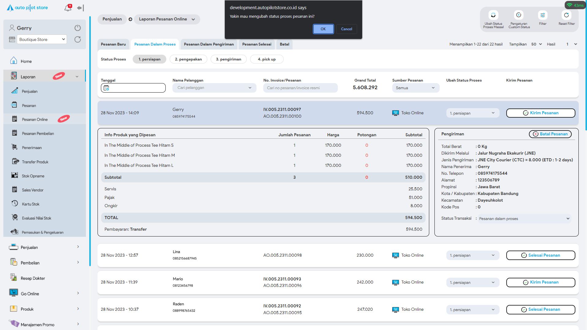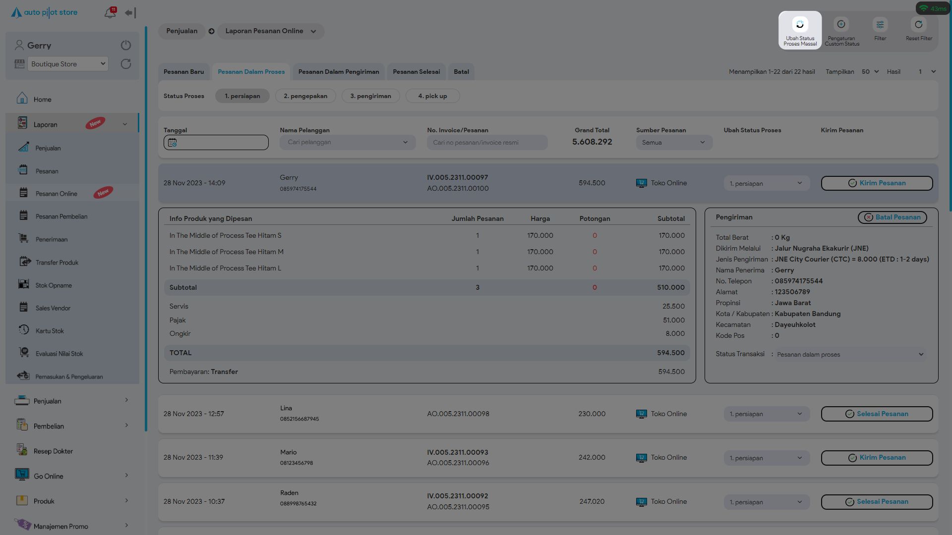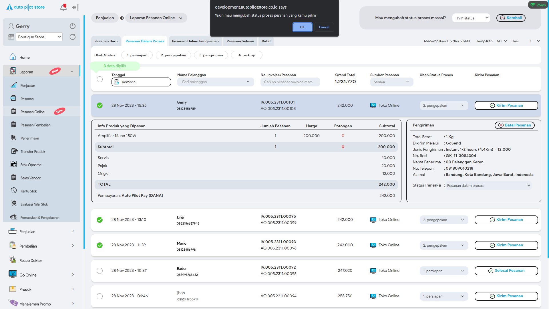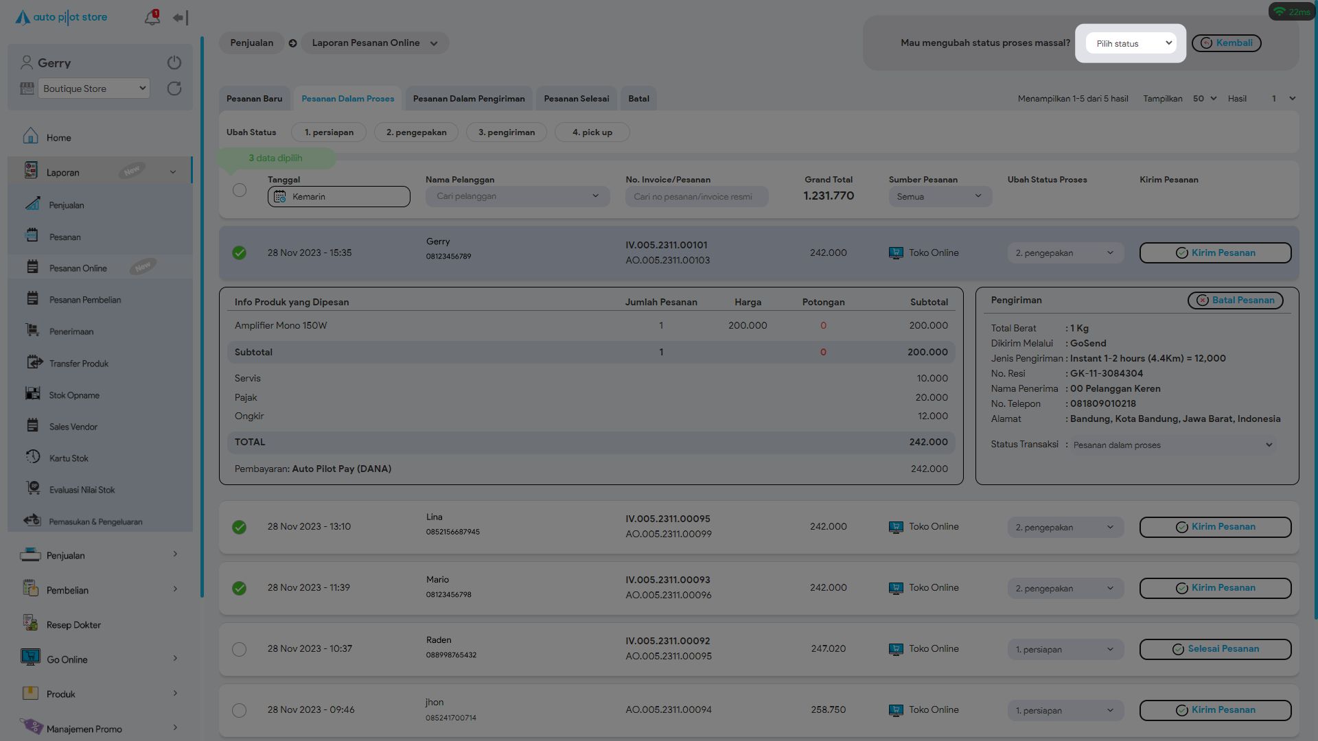*Untuk mengubah status proses pesanan terdapat 2 cara. Baik satu per satu atau pun secara massal