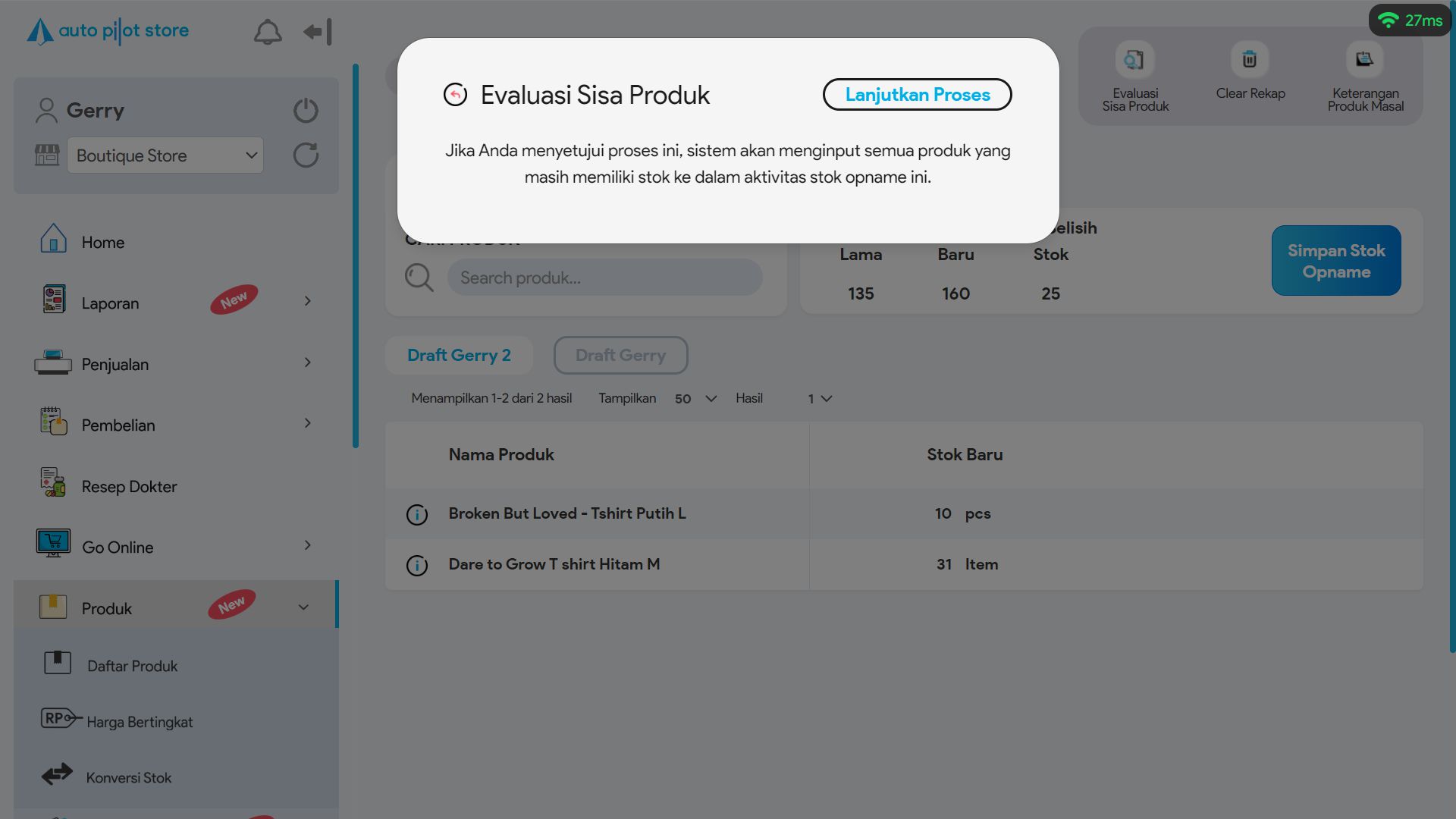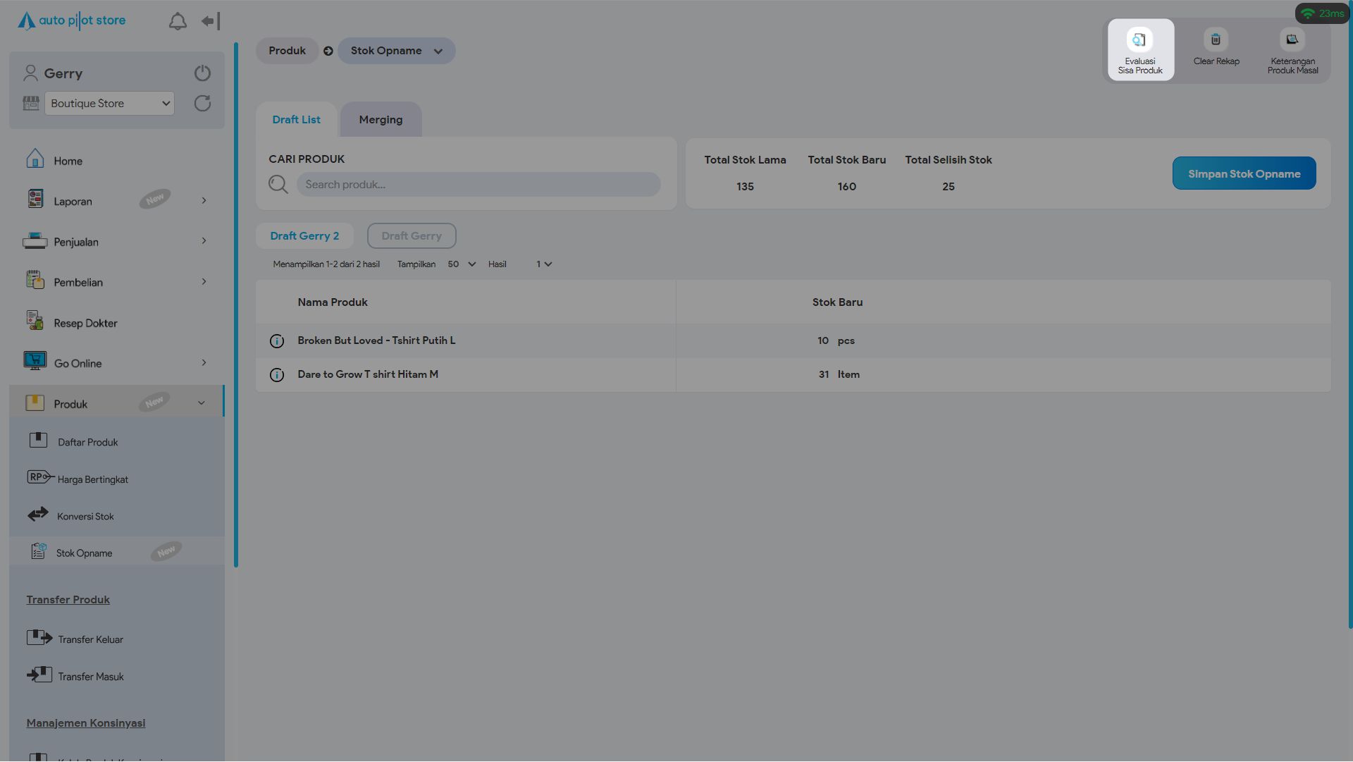 1. Di halaman merging draft (tutorial menyatukan beberapa draft : https://help.autopilotstore.co.id/menyatukan-beberapa-draft-stok-opname-backoffice/ ), klik button Evaluasi Sisa Produk