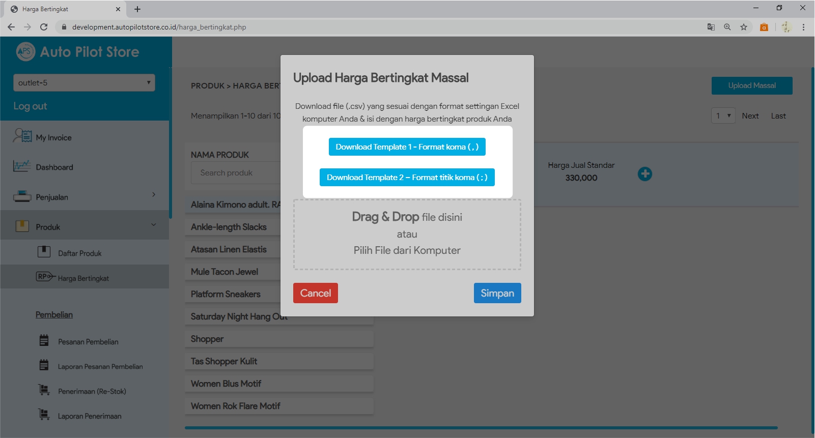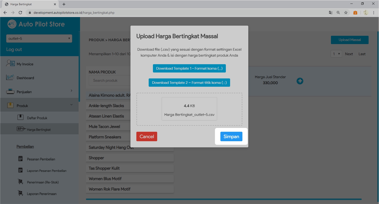 4. Download Template Harga Bertingkat Format 1 atau Format 2. Pilih template produk yang sesuai dengan pengaturan csv di komputer, apakah menggunakan koma (,) atau titik koma (;)