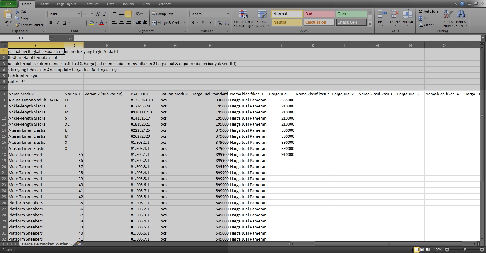 5. Isi data harga jual bertingkat beserta dengan nama klasifikasi harga nya, sesuai dengan ketentuan pengisian yang sudah tercantum di header template, kemudian Simpan