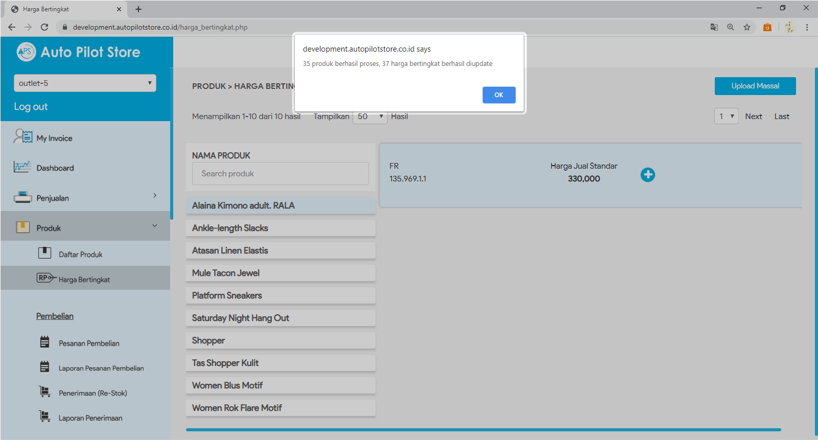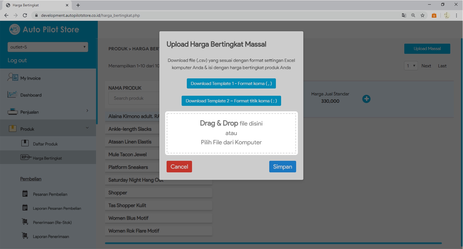 6. Pilih kembali tombol Upload Massal lalu klik Drag & Drop File Disini (pilih file csv yang telah diolah dari komputer)