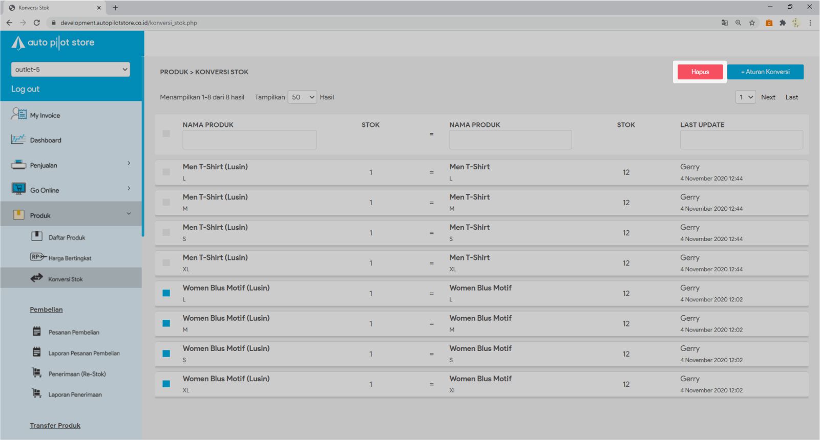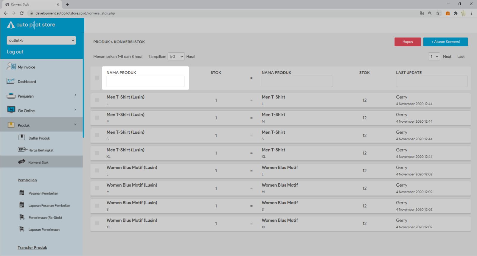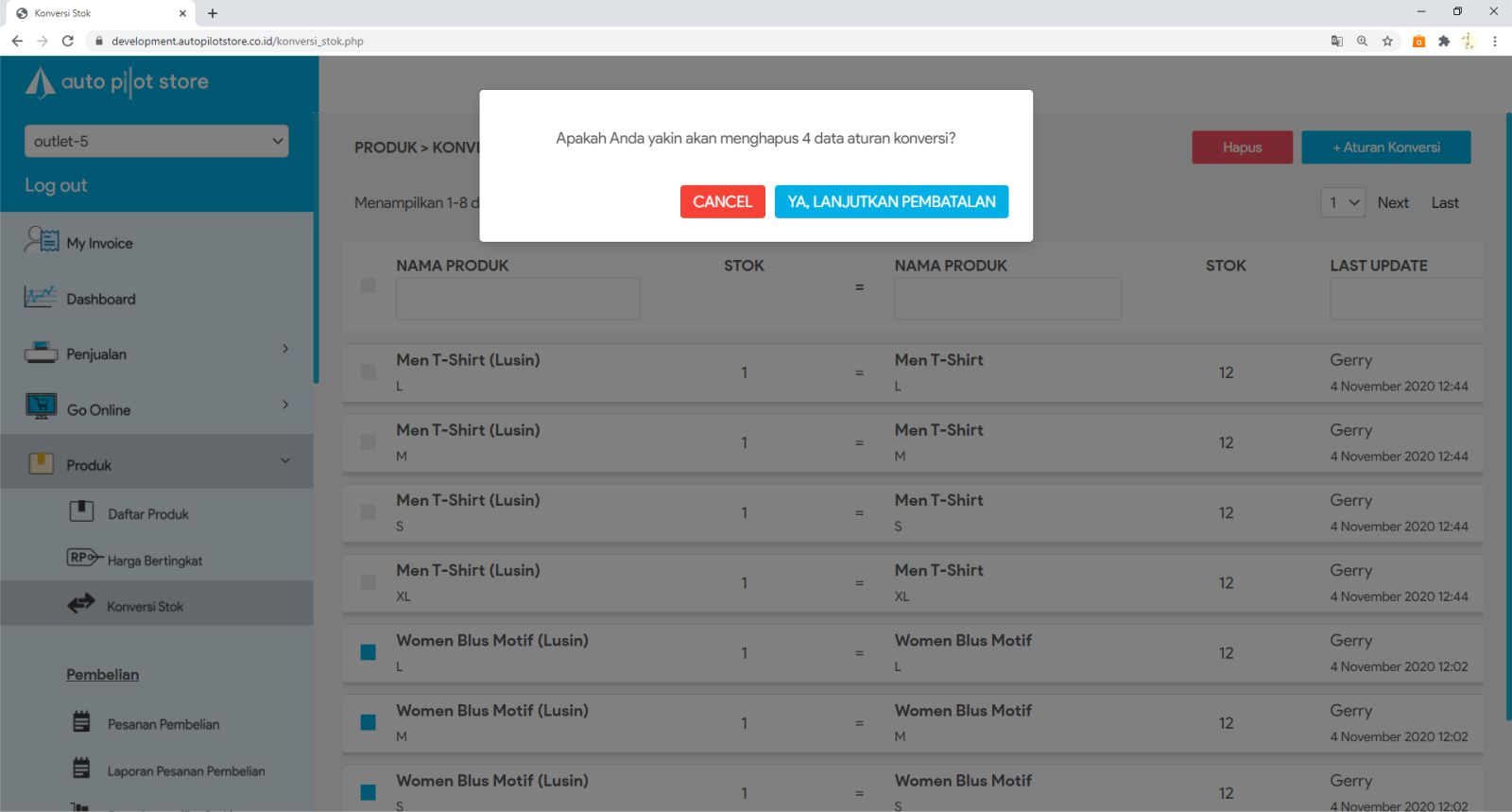 3. Masukkan Nama Produk yang akan dihapus aturan konversi nya