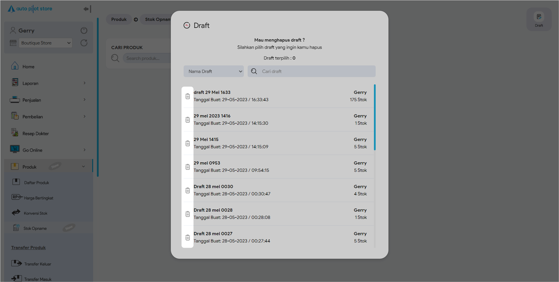 5. Pilih draft yang dingin dihapus dengan mengklik icon tempat sampah. Anda bisa menggunakan pencarian draft / nama pembuat draft, untuk memudahkan pencarian