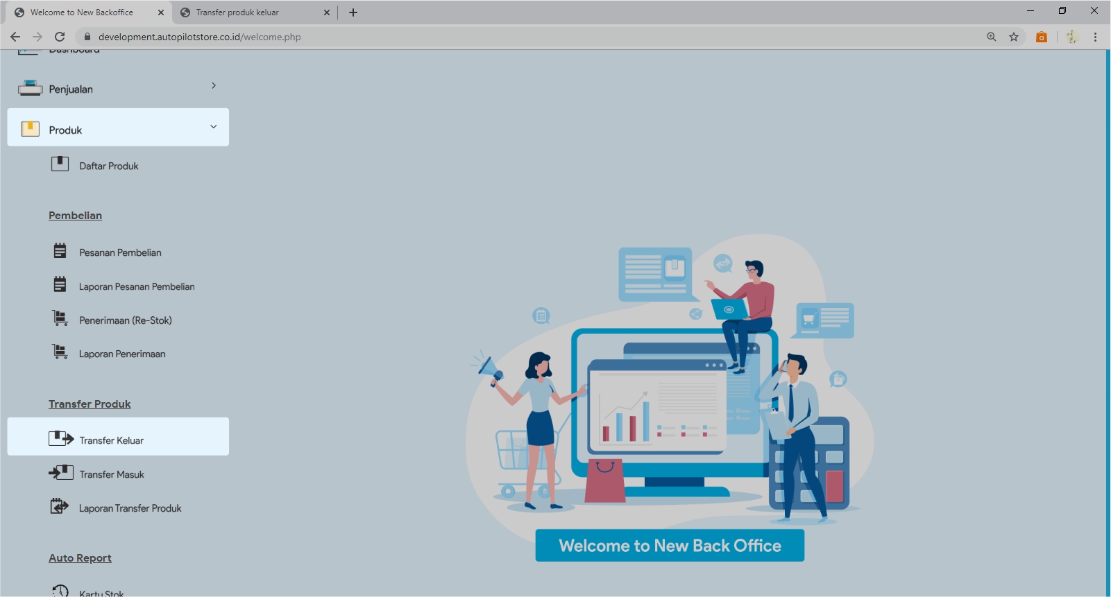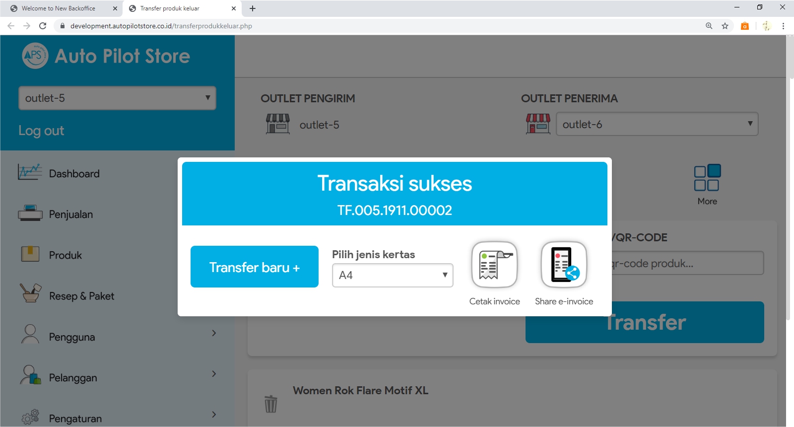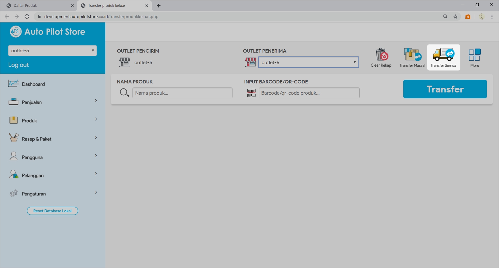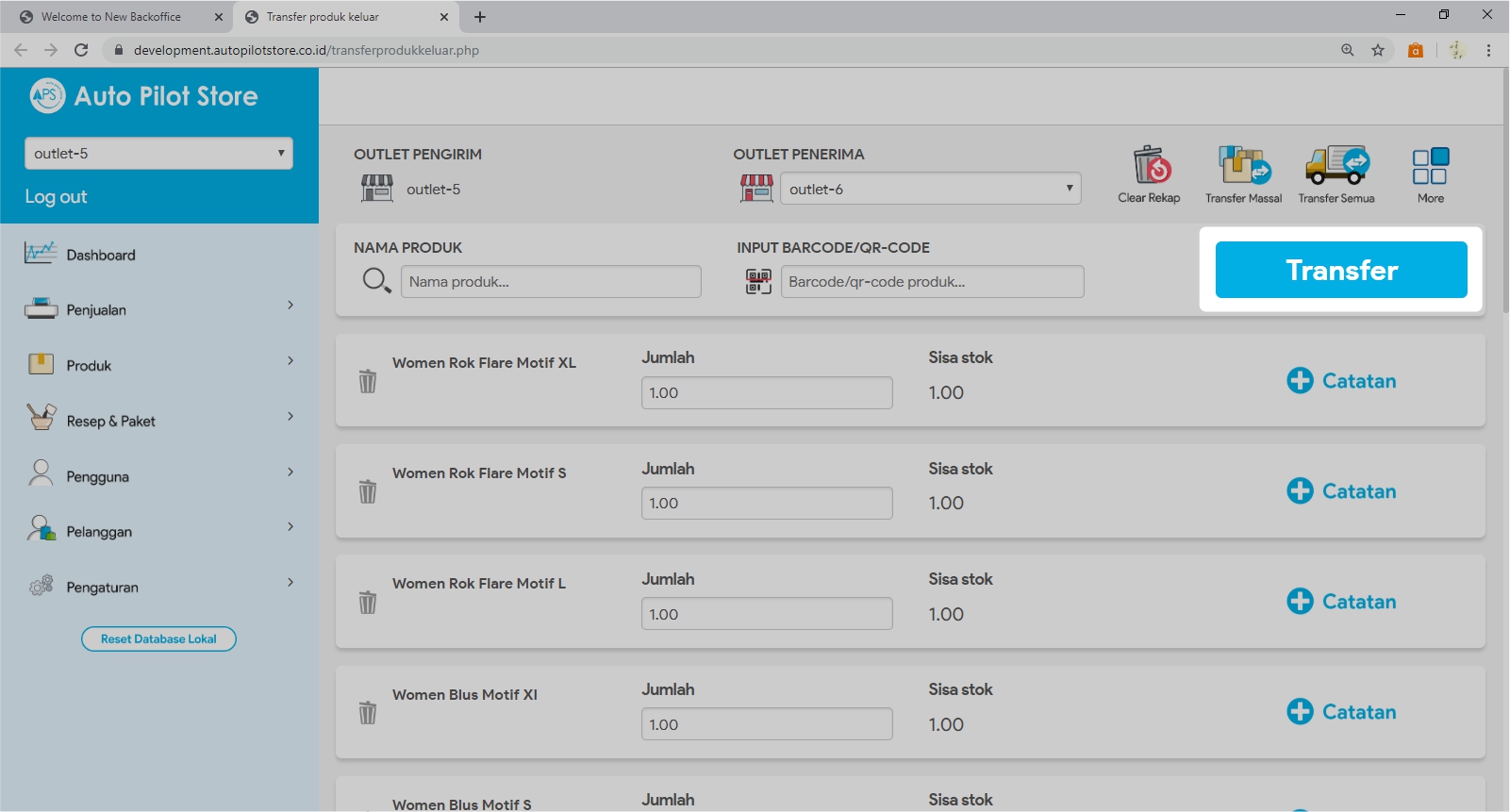 6. Pilih Transfer. Semua produk yang ada jumlahnya akan ditransfer ke outlet penerima