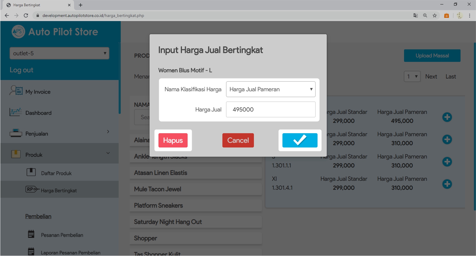 6. Klik tombol v untuk menyimpan perubahan atau klik tombol Hapus untuk menghapus harga bertingkat