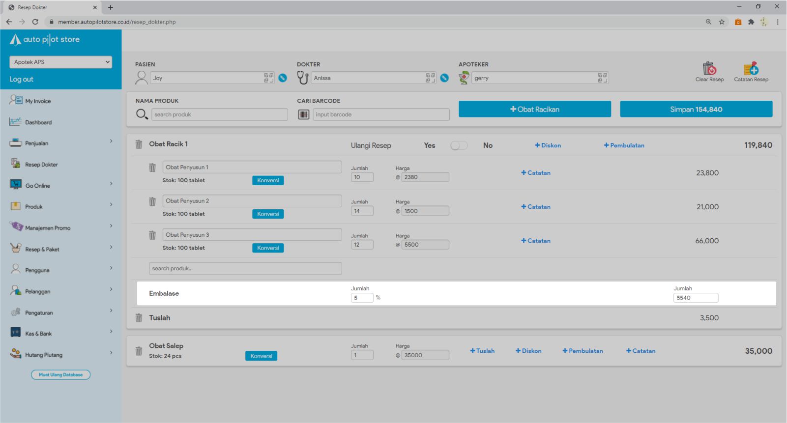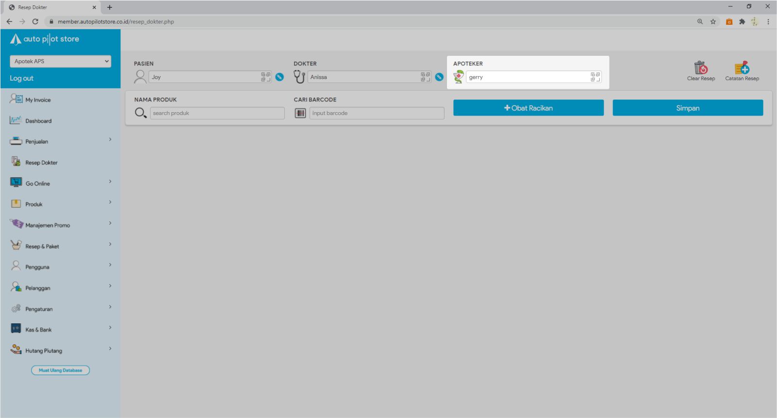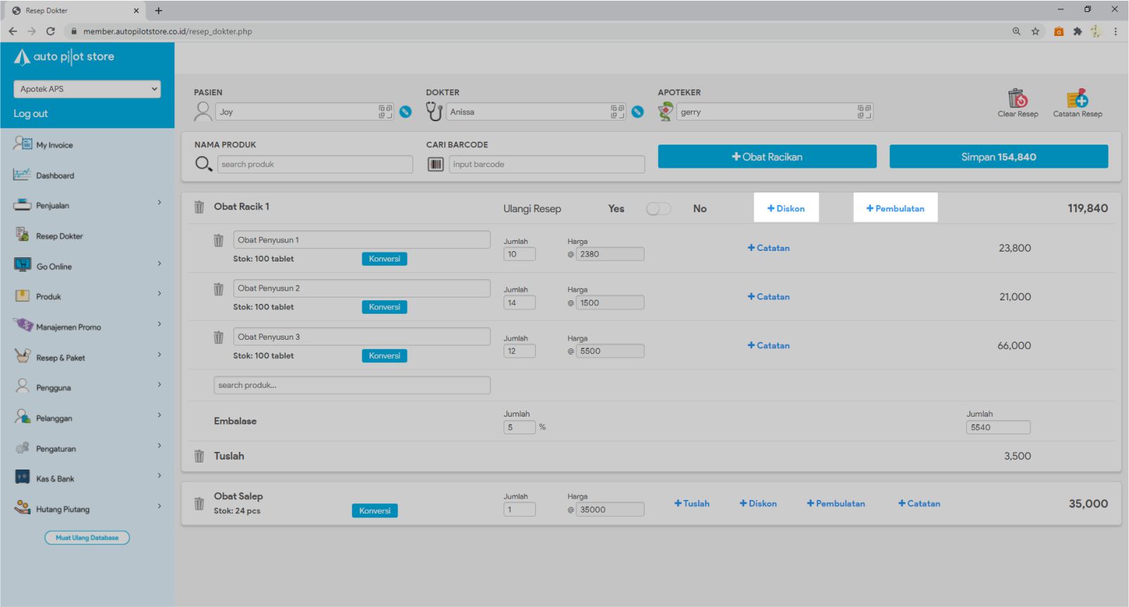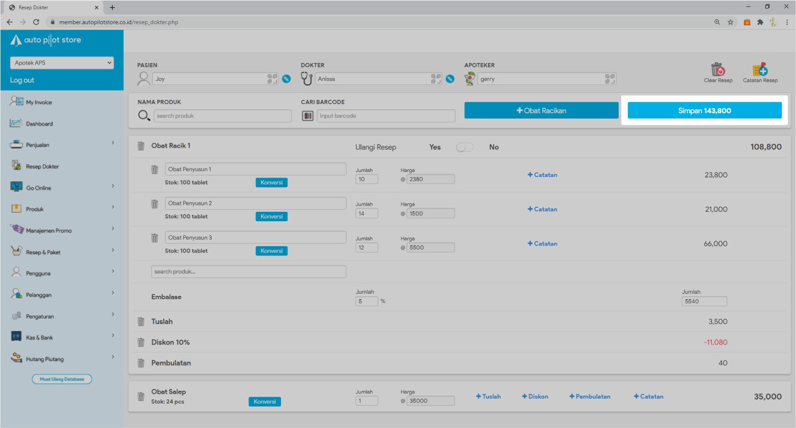 Fasilitas resep dokter digunakan oleh apoteker atau pengguna yang berwenang, untuk mengatur komposisi dari resep obat yang diberikan oleh dokter. Berikut tahapan membuat resep dokter: