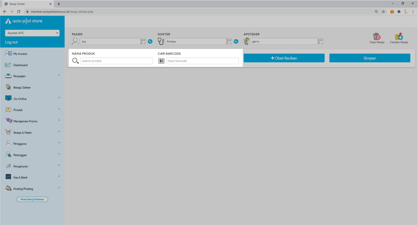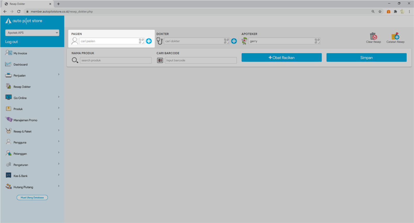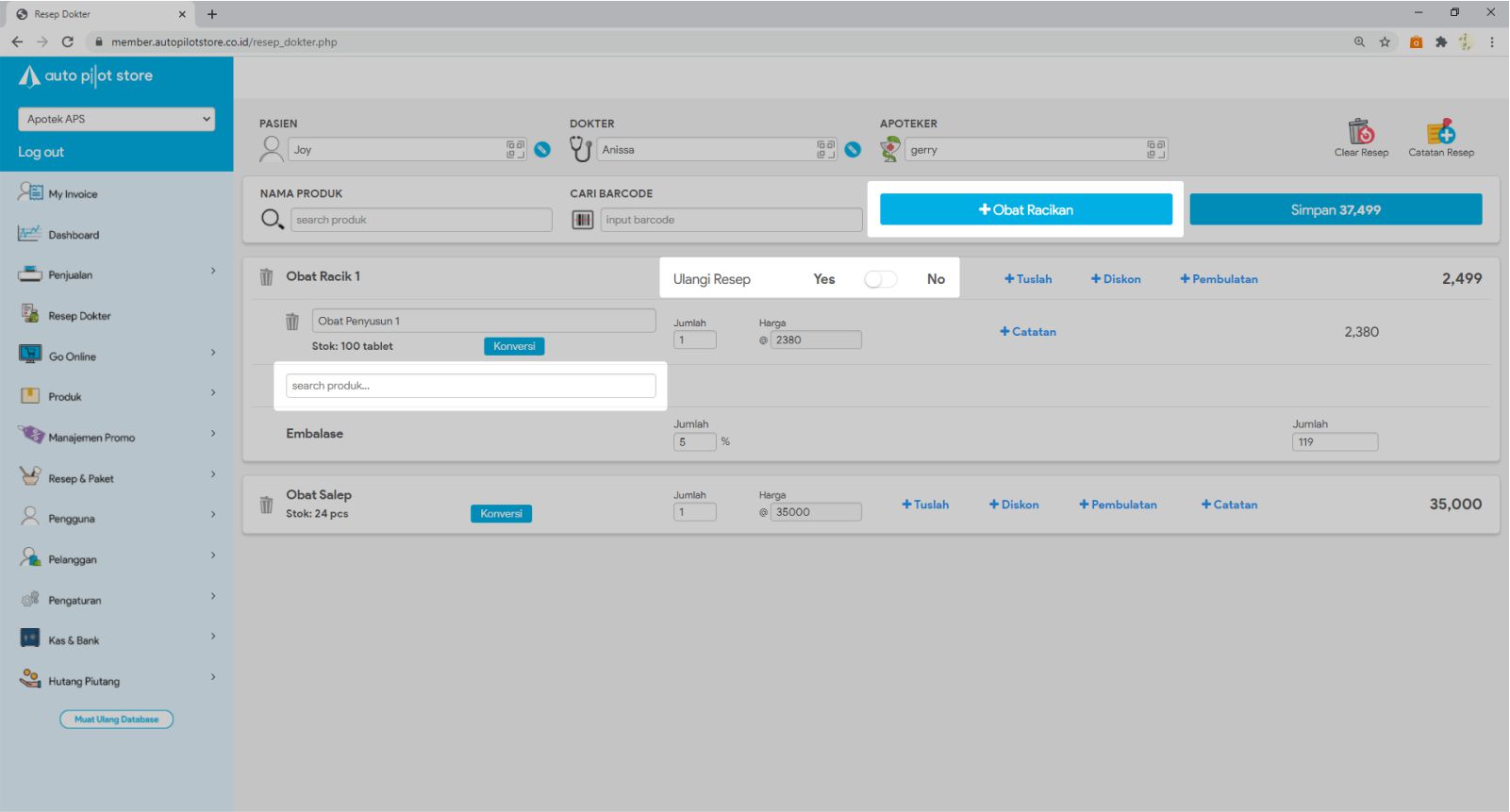 Fasilitas resep dokter digunakan oleh apoteker atau pengguna yang berwenang, untuk mengatur komposisi dari resep obat yang diberikan oleh dokter. Berikut tahapan membuat resep dokter: