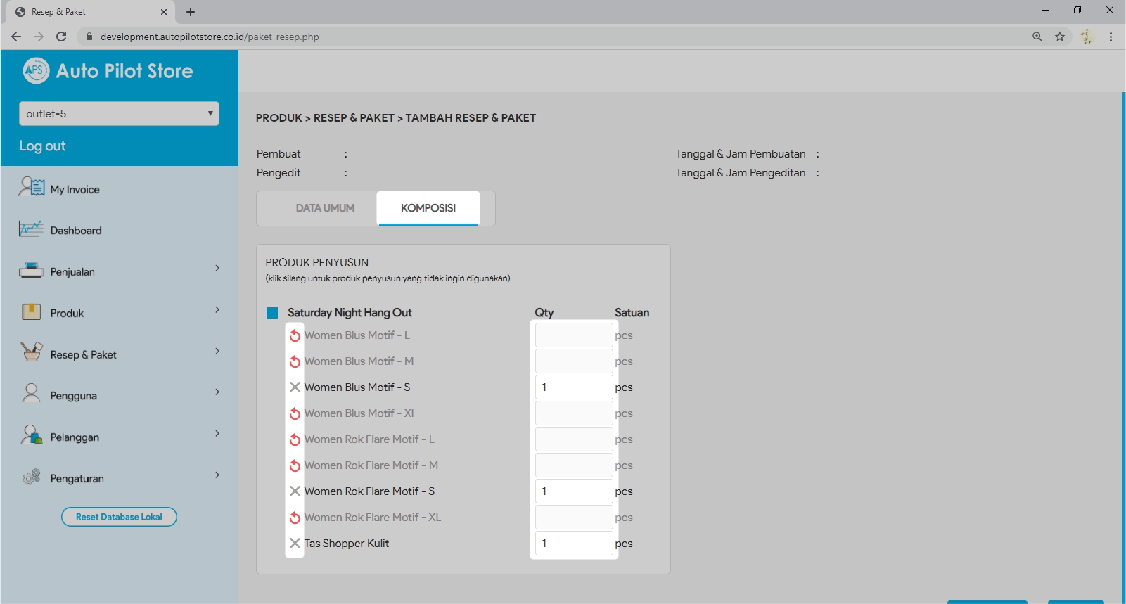 6. Isi Tabulasi Komposisi Resep dari Produk. Klik silang (X) untuk menghapus produk penyusun yang tidak diperlukan pada varian tertentu. Masukkan jumlah (Qty) produk penyusun yang digunakan untuk membuat 1 satuan produk paket.