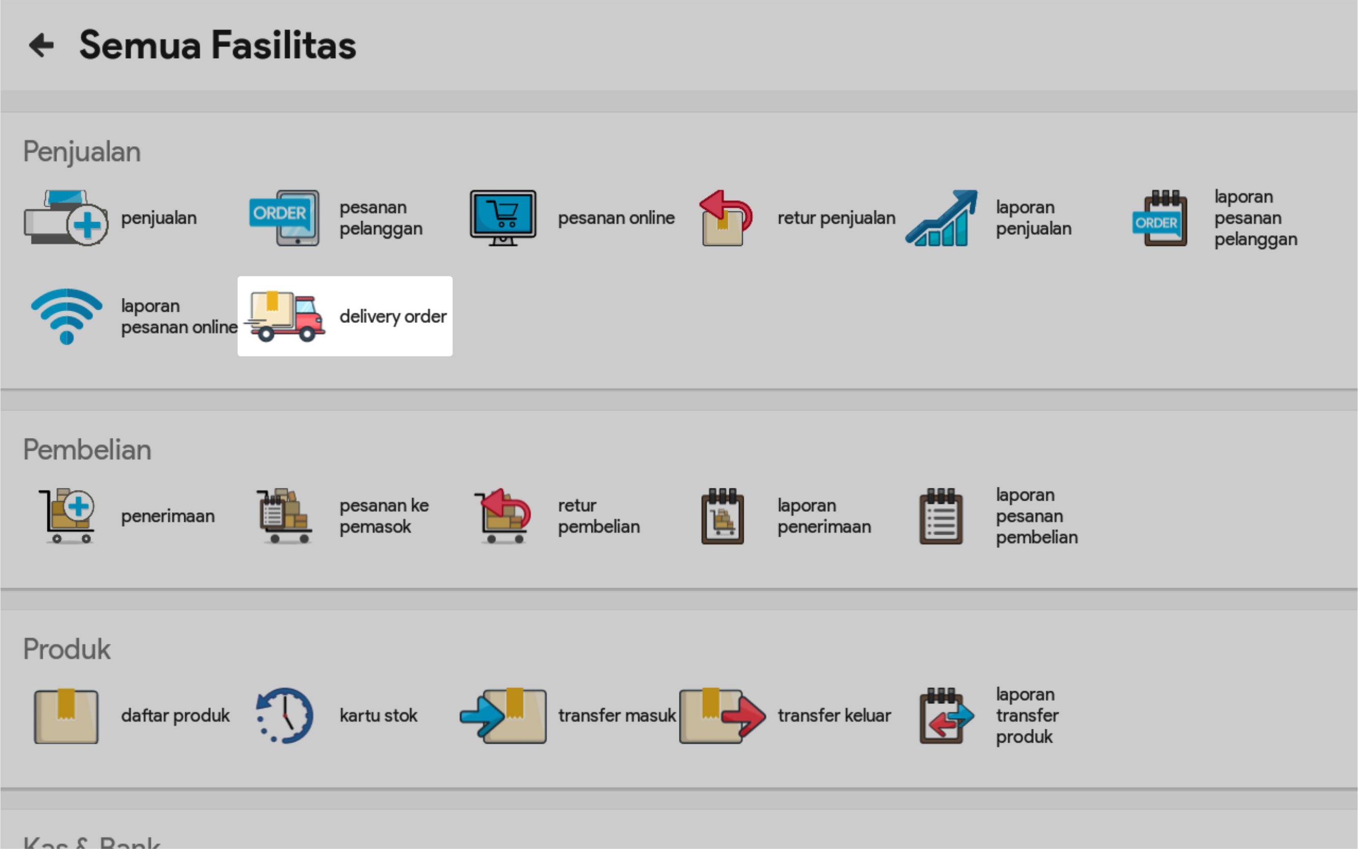 1. Pilih Fasilitas Delivery Order. Jika Anda tidak menemukannya di Halaman Menu Utama, Anda bisa klik Semua Fasilitas lalu pilih Fasilitas Delivery Order