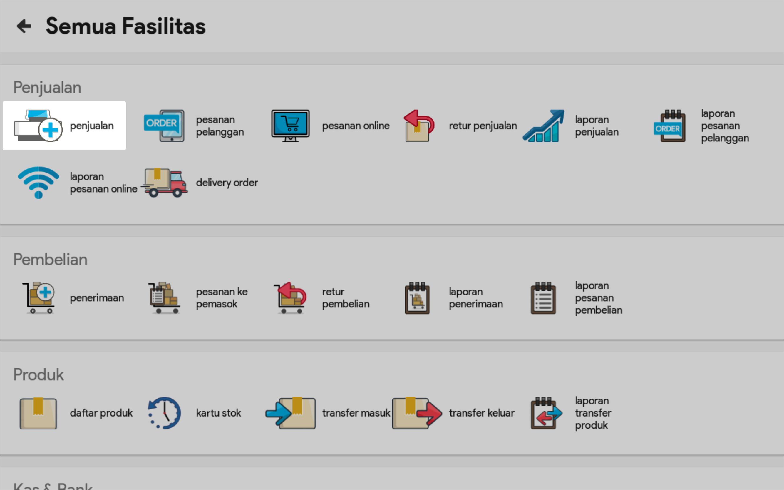 1.  Pilih Fasilitas Penjualan. Jika Anda tidak menemukannya di Halaman Menu Utama, Anda bisa klik Semua Fasilitas lalu pilih Fasilitas Penjualan