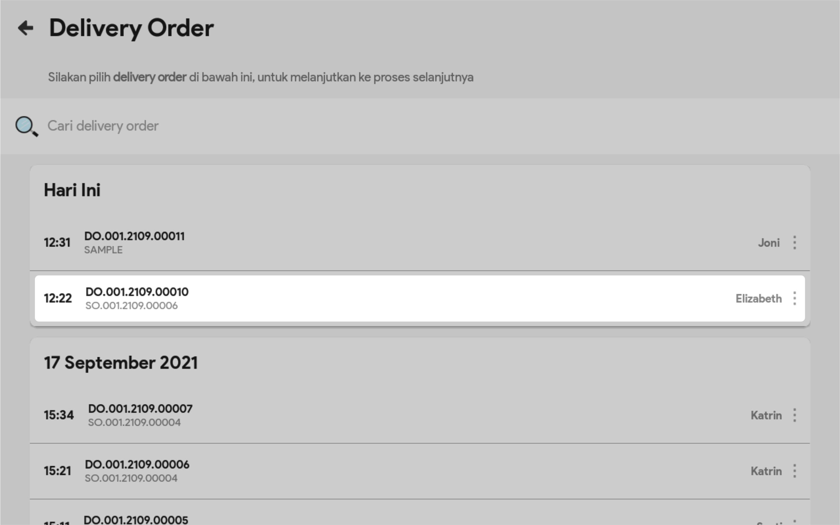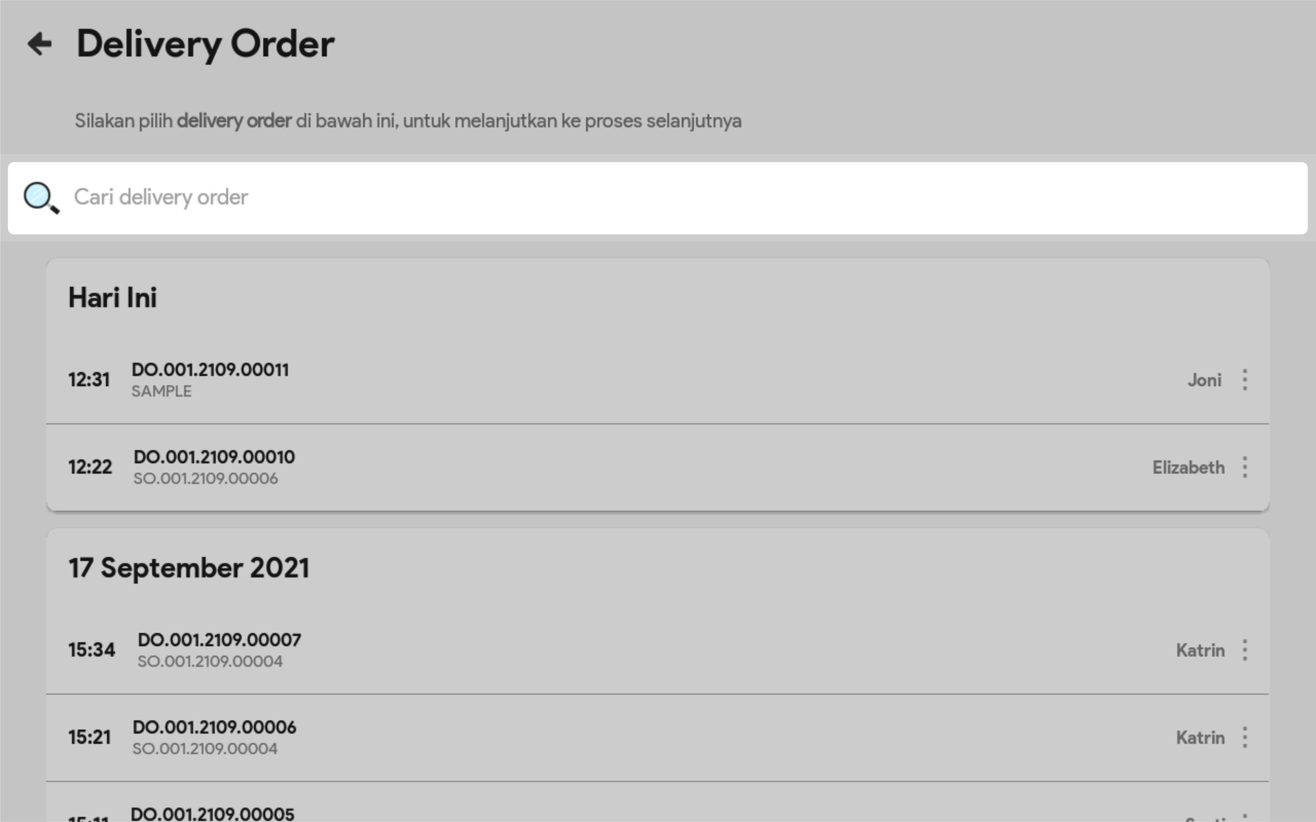 3.  Di kolom pencarian, masukkan nomor delivery order/ nomor pesanan/ Nama pelanggan untuk mencari delivery order yang akan dibuat invoice penjualannya