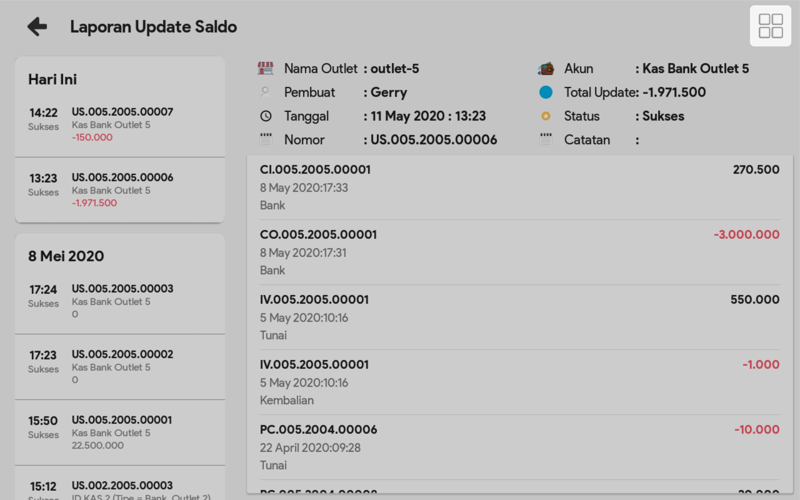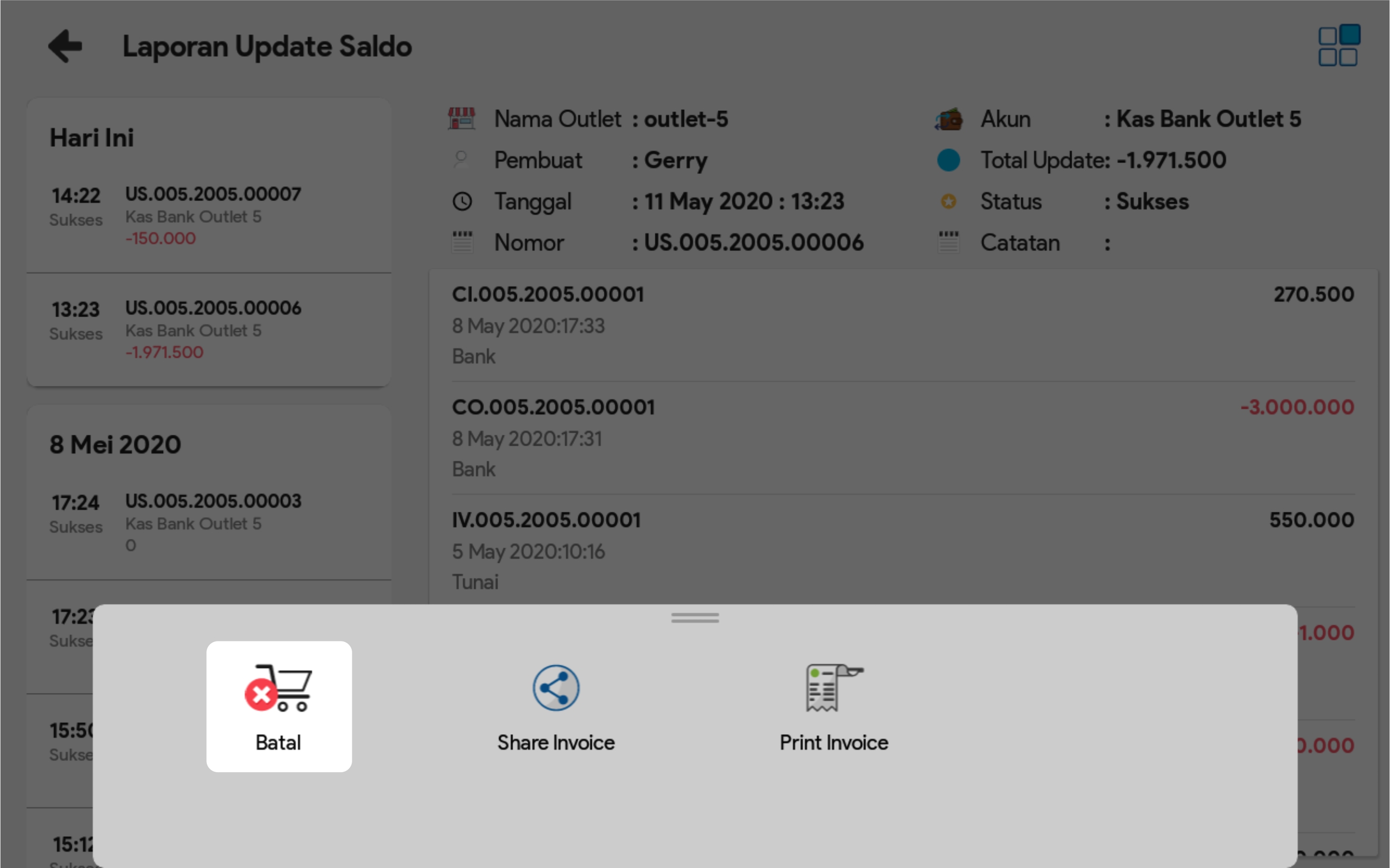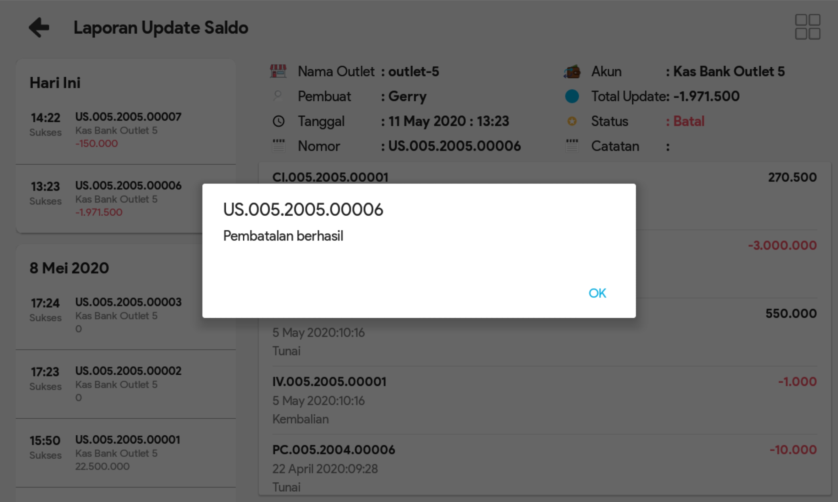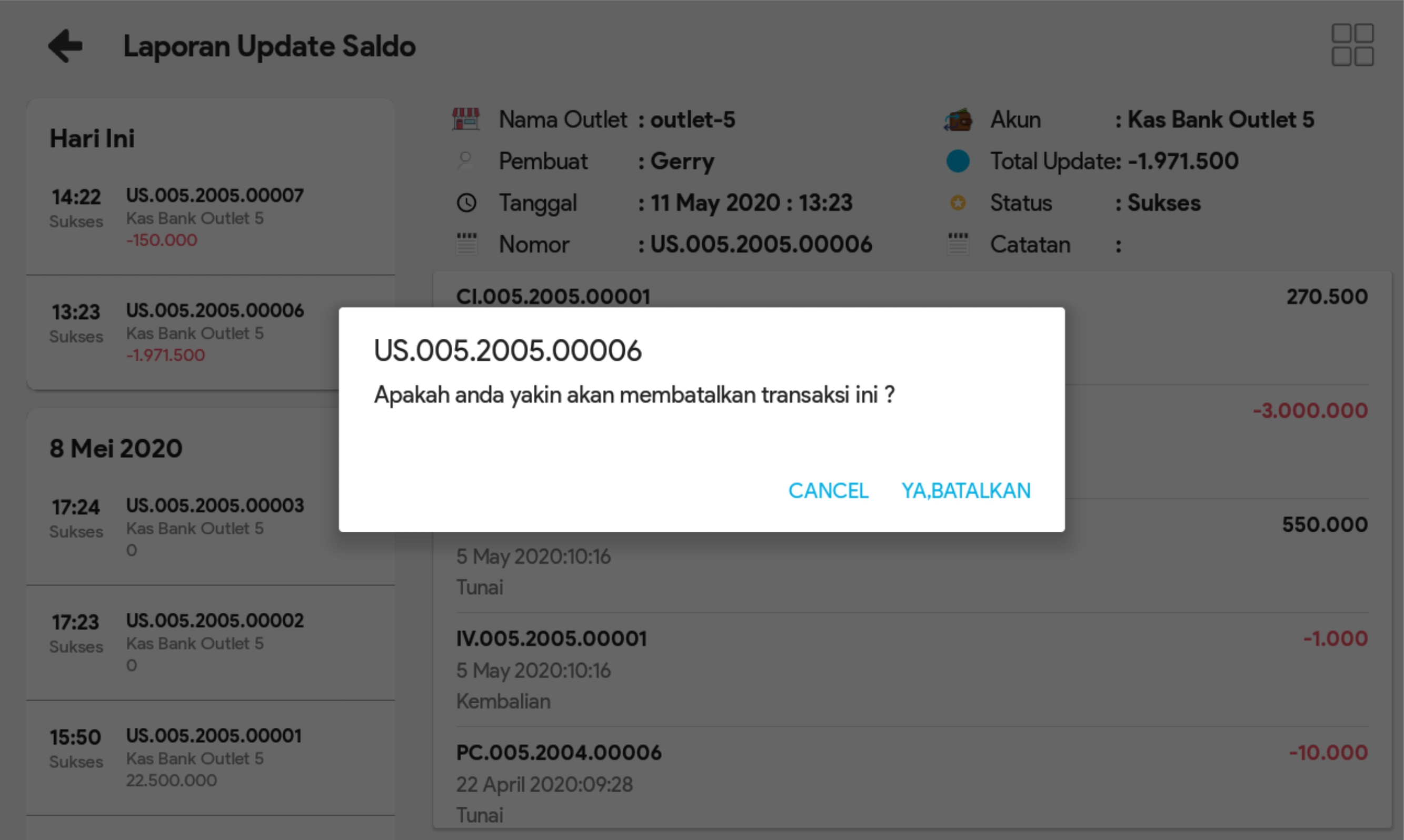 2. Cari transaksi update saldo yang ingin dibatalkan.
