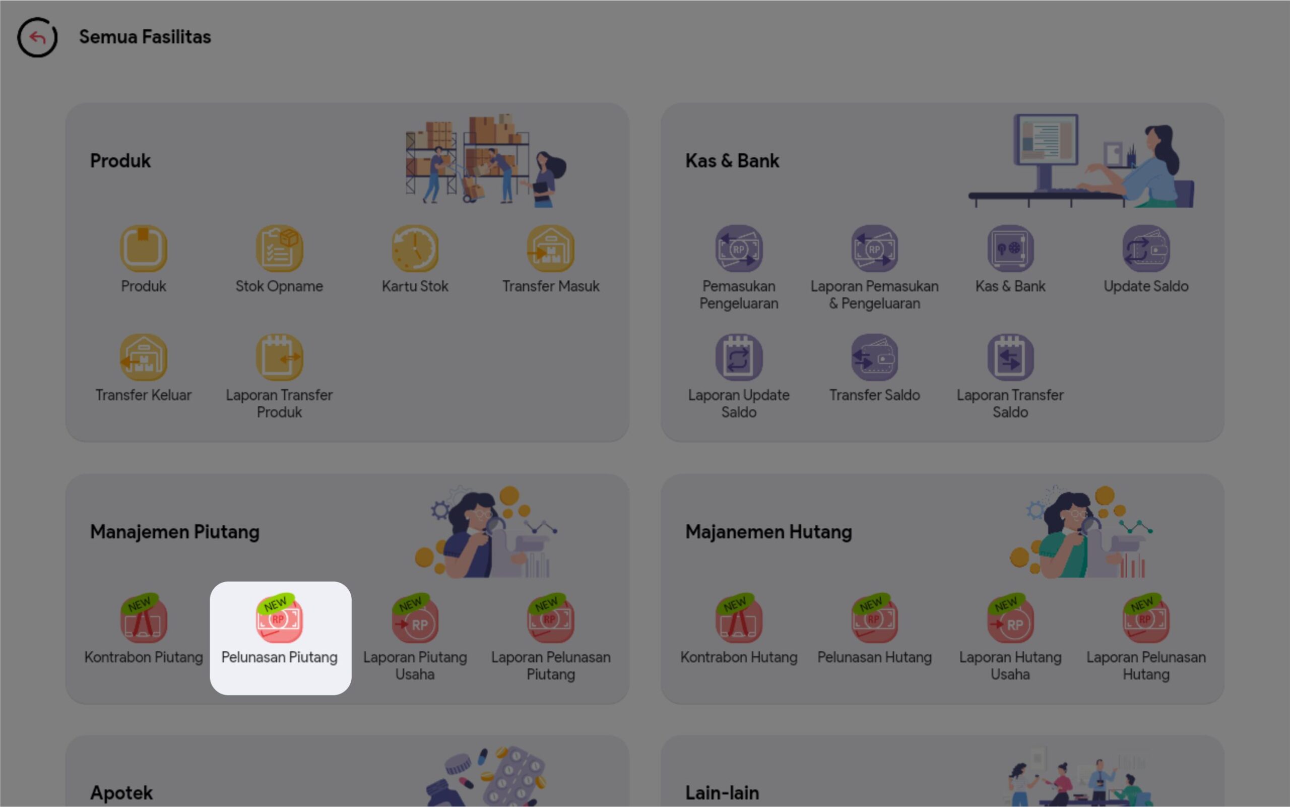 1. Pertama adalah dengan pilih menu Pelunasan Piutang di halaman menu utama. Atau jika Anda tidak menemukan menu Pelunasan Piutang di halaman utama, Anda dapat mengklik Semua Fasilitas, kemudian pilih menu Pelunasan Piutang