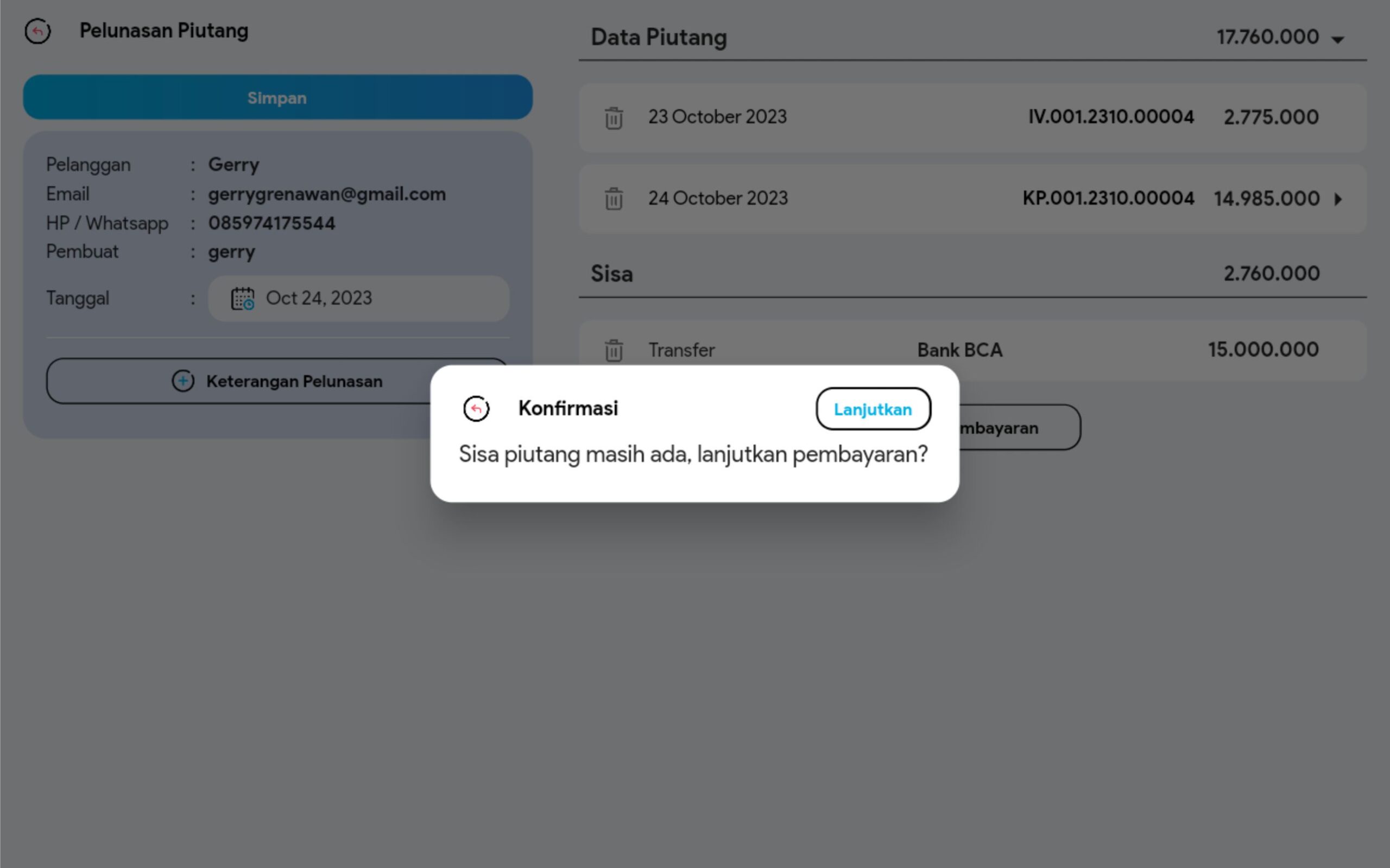 7. Pilih Pembayaran dan masukkan Keterangan Pelunasan (jika diperlukan).