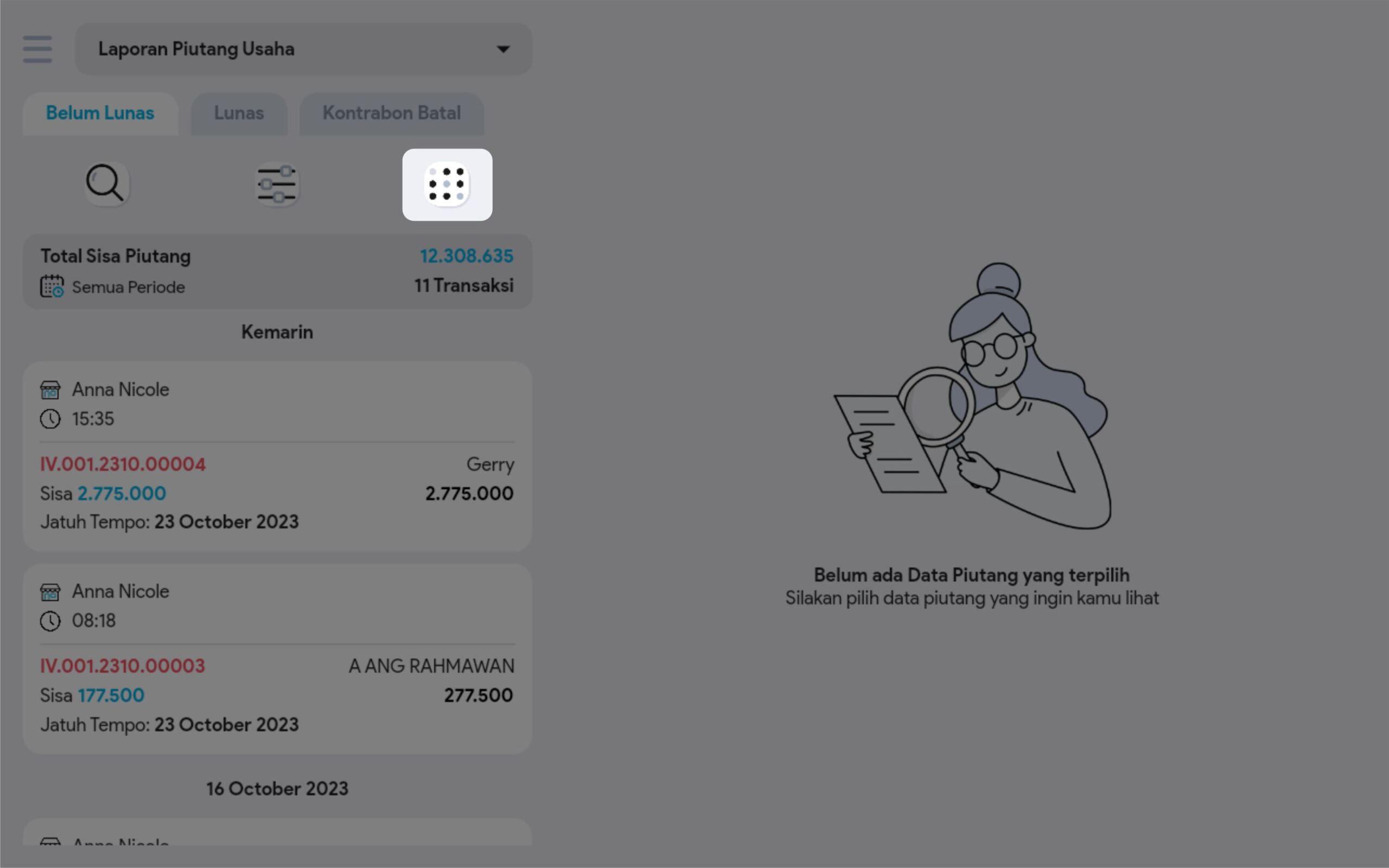 2. Cara kedua adalah melalui menu Laporan Piutang Usaha. Di dalam menu Laporan Piutang Usaha klik button More, kemudian klik kontrabon