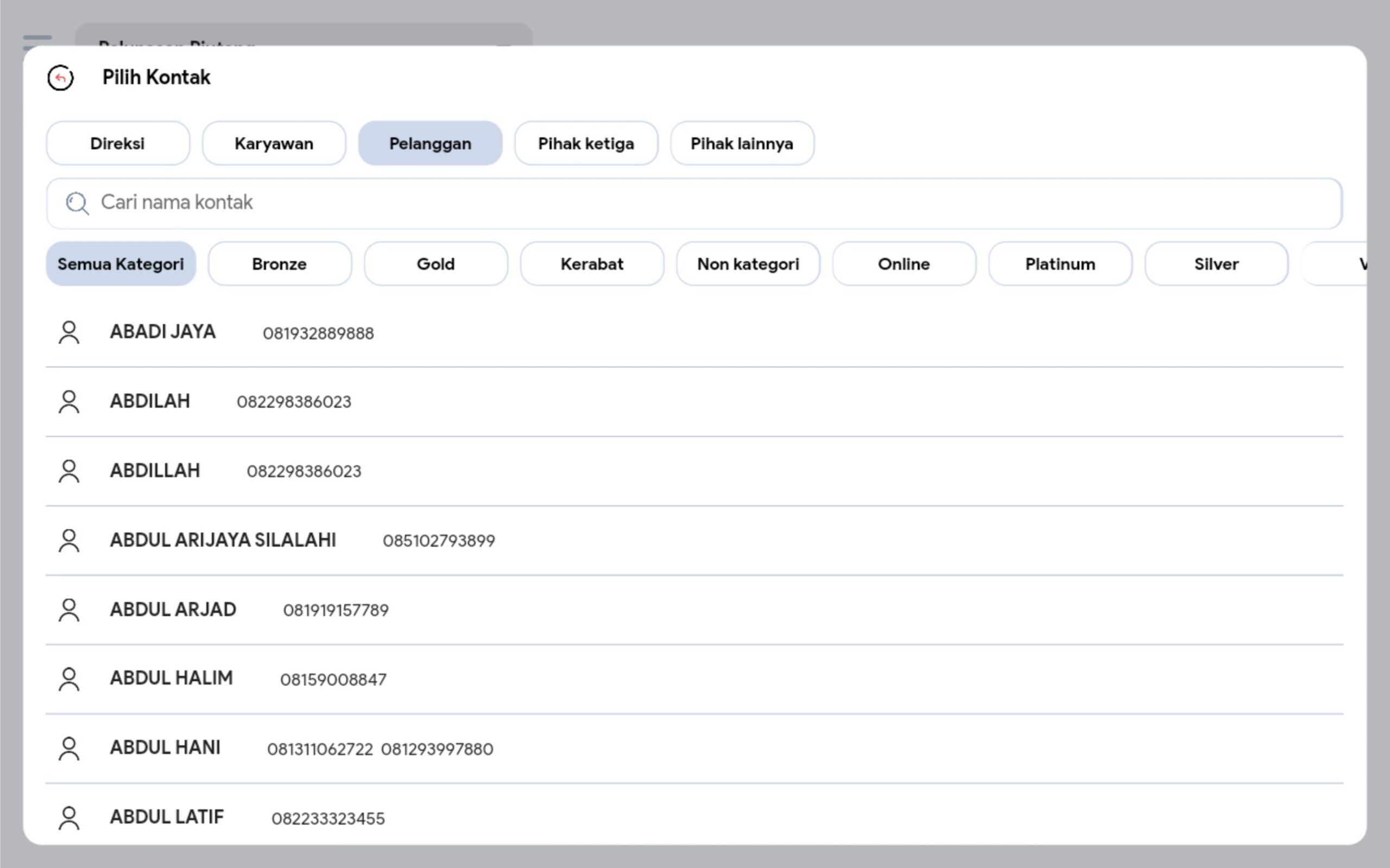 3. Pilih kategori kontak dan nama kontak yang diinginkan