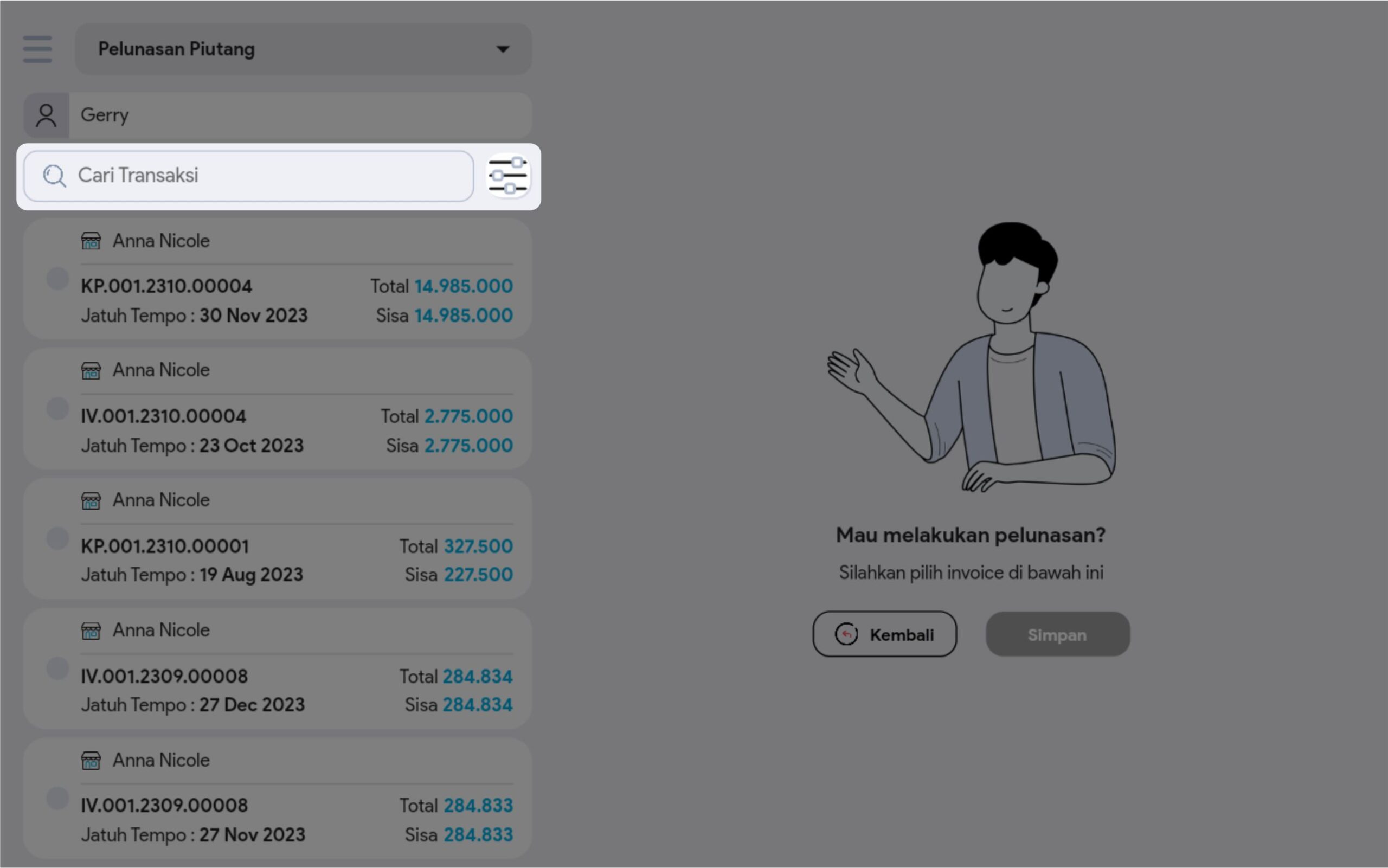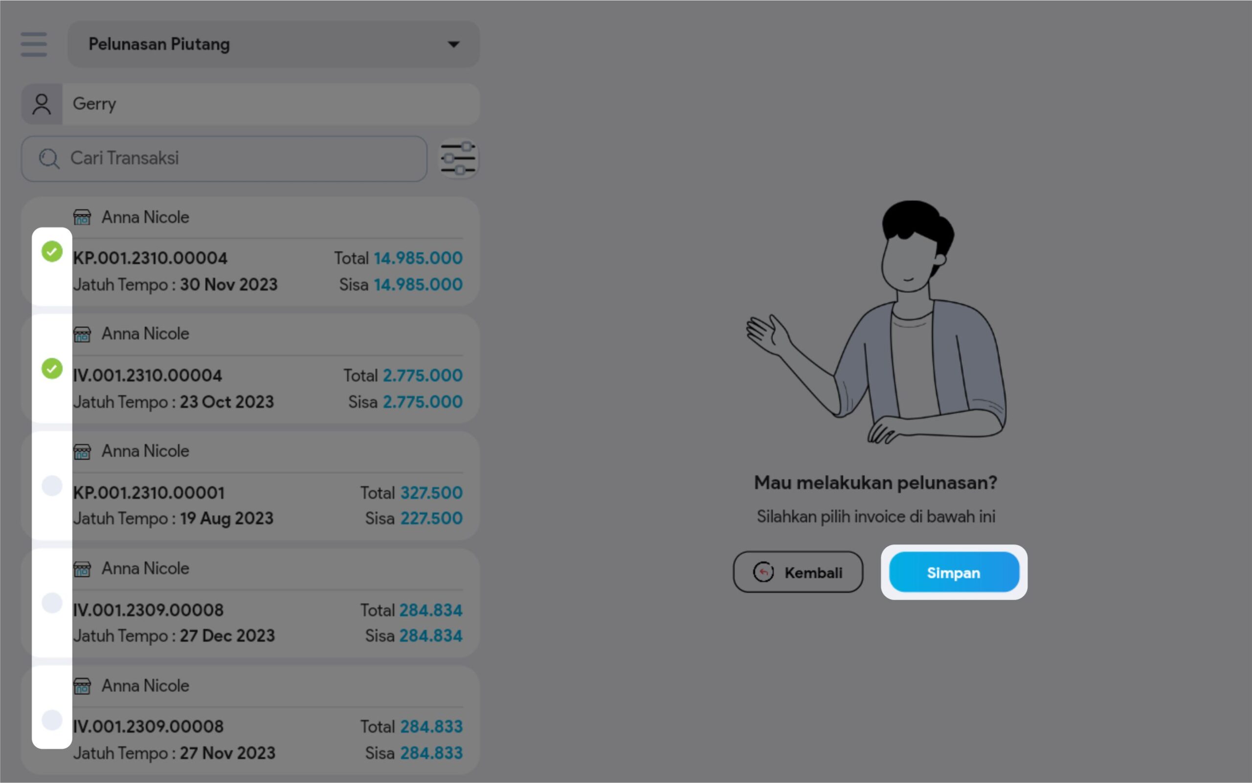 6. Pilih transaksi yang diinginkan, kemudian klik Simpan