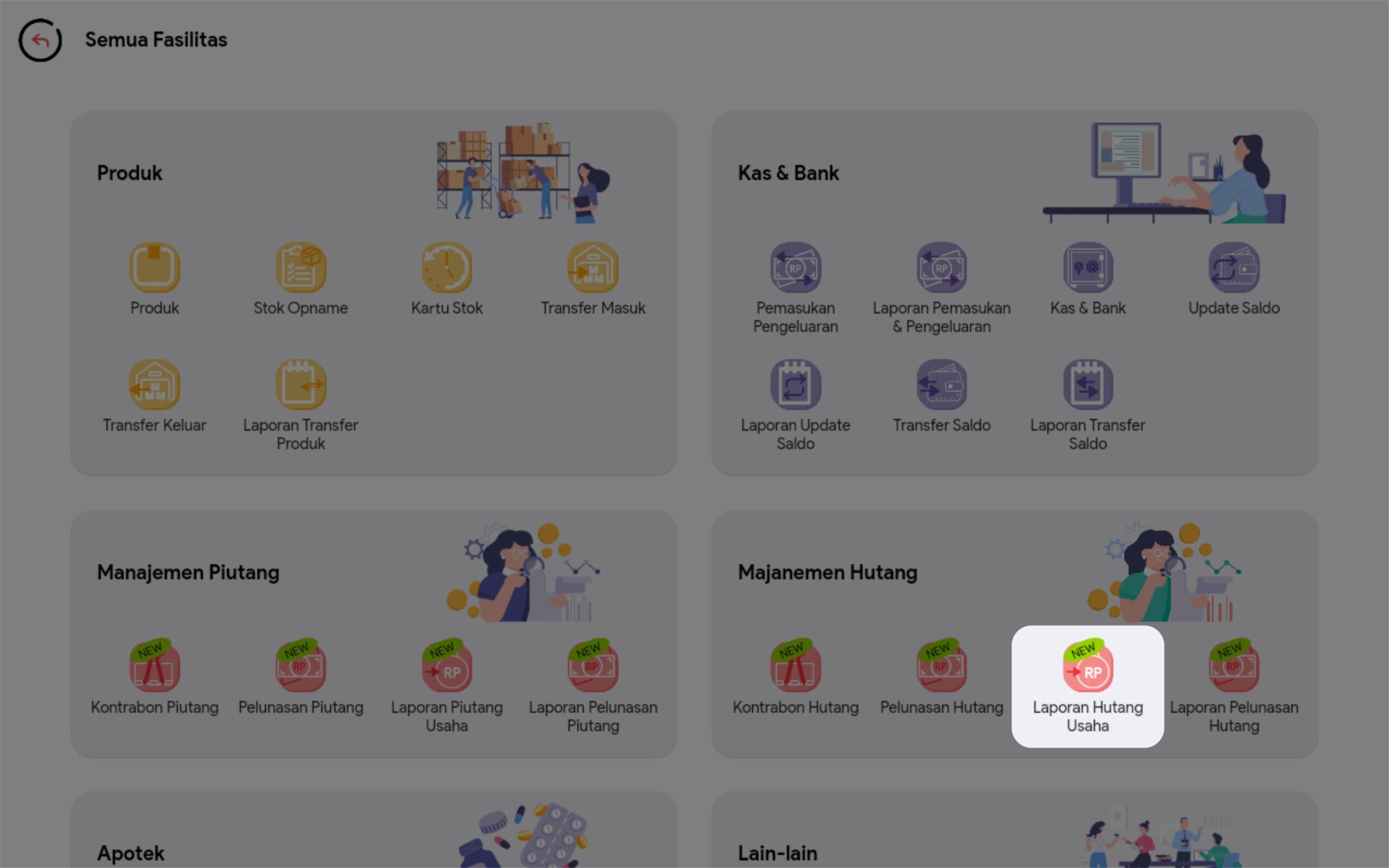 1. Pilih menu Laporan Hutang Usaha di halaman menu utama. Atau jika Anda tidak menemukan menu Laporan Hutang Usaha di halaman utama, Anda dapat mengklik Semua Fasilitas, kemudian pilih menu Laporan Hutang Usaha