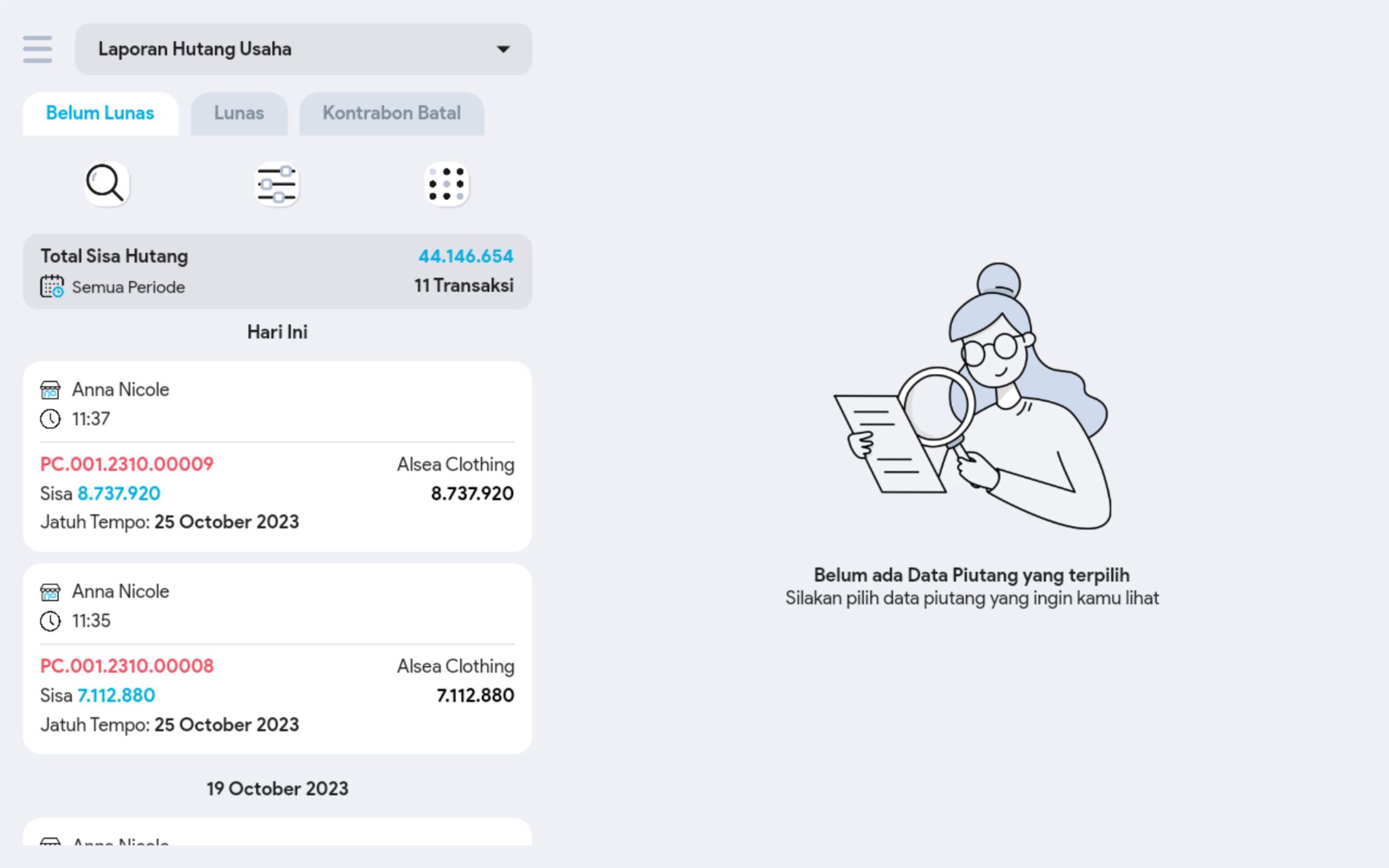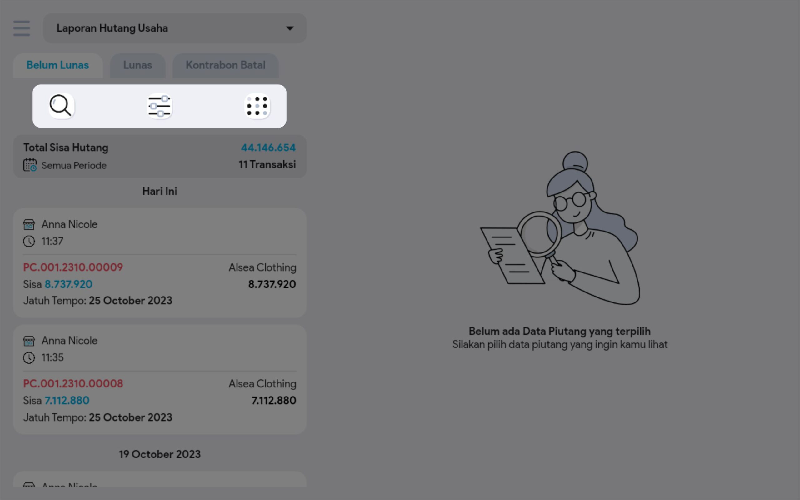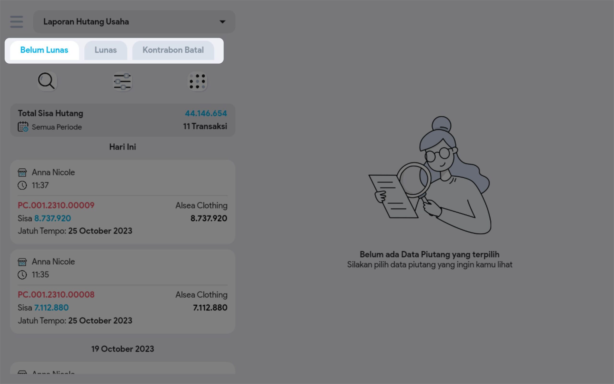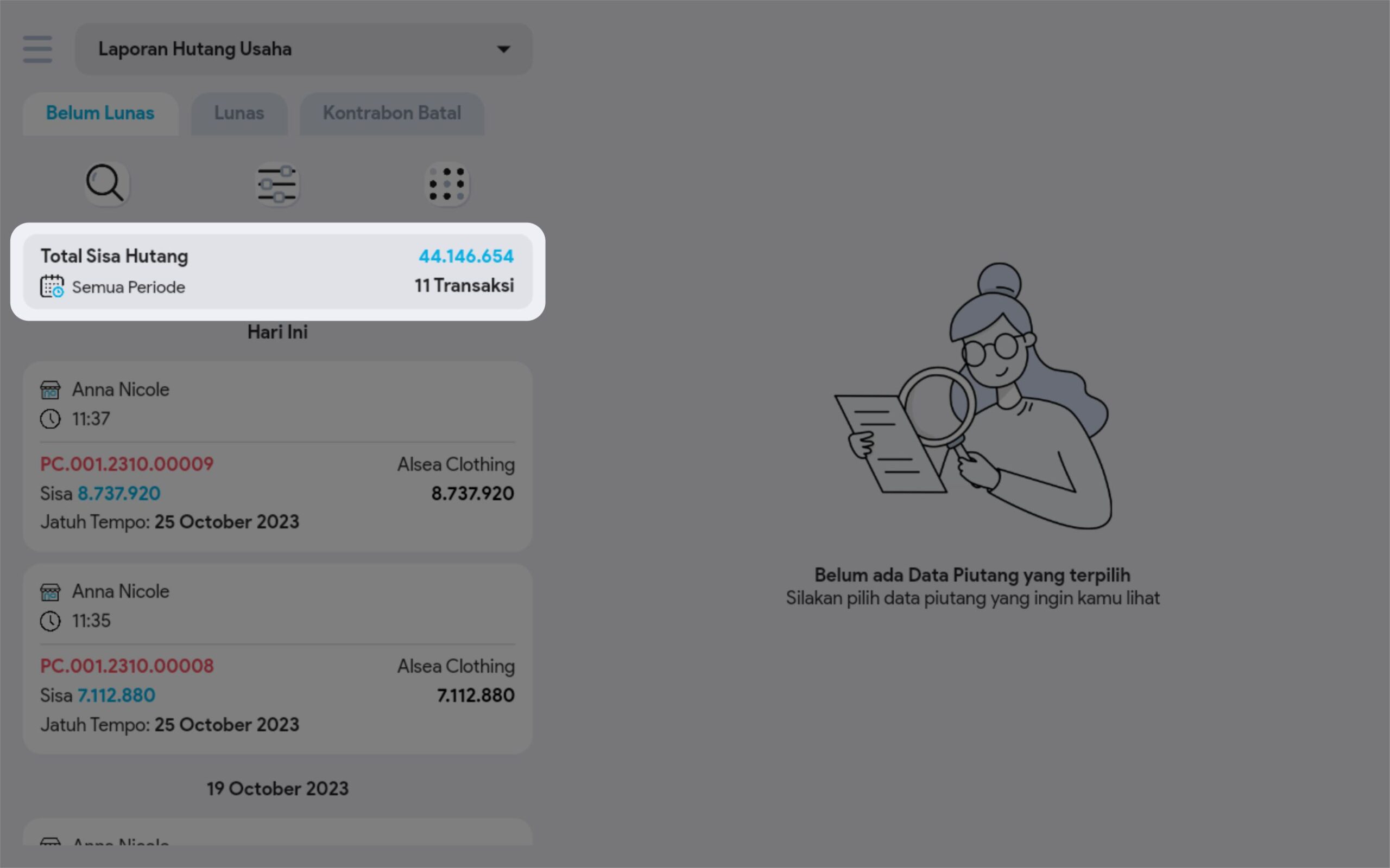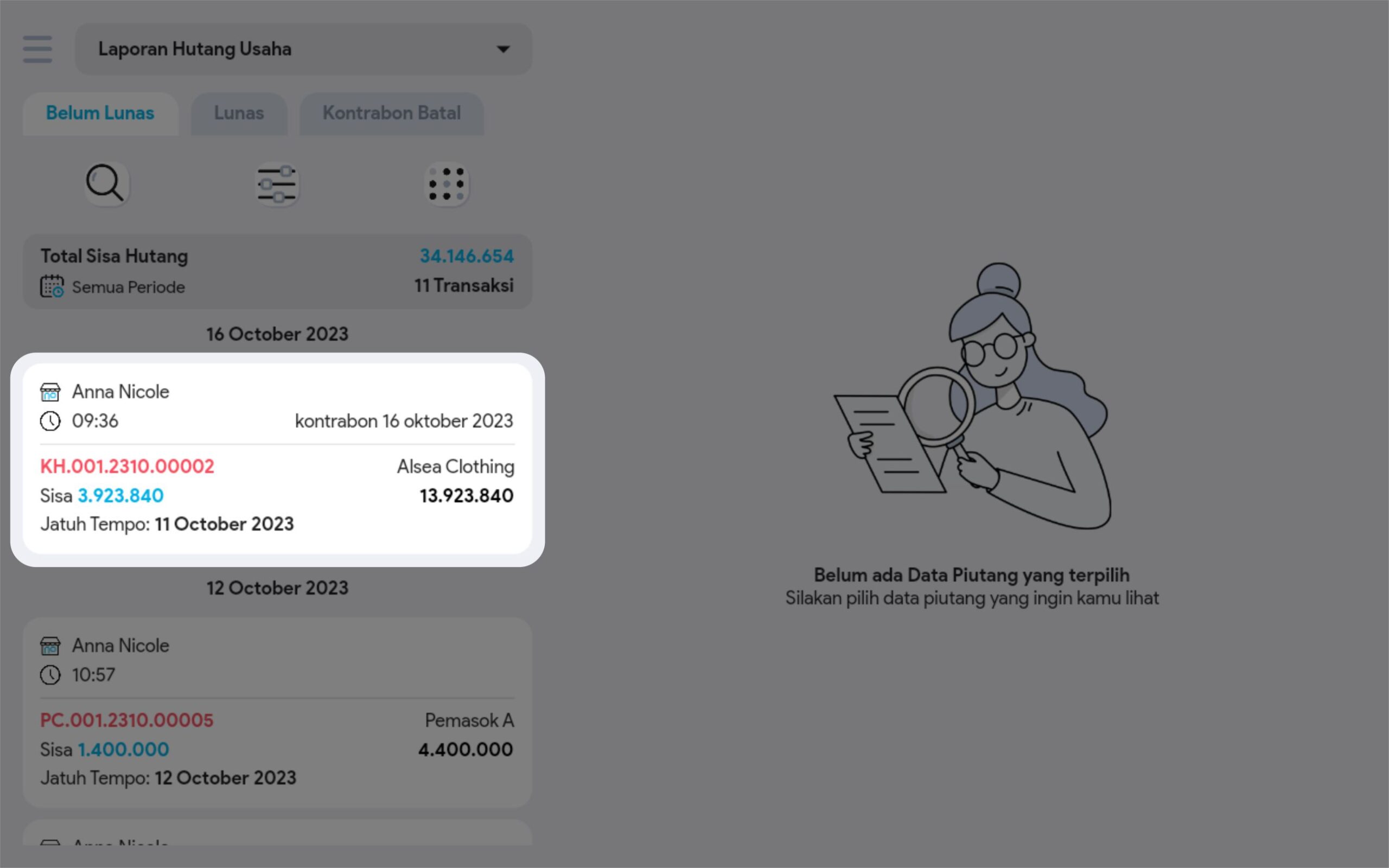 6. Cari dan pilih transaksi hutang yang diinginkan untuk melihat informasi lebih detail