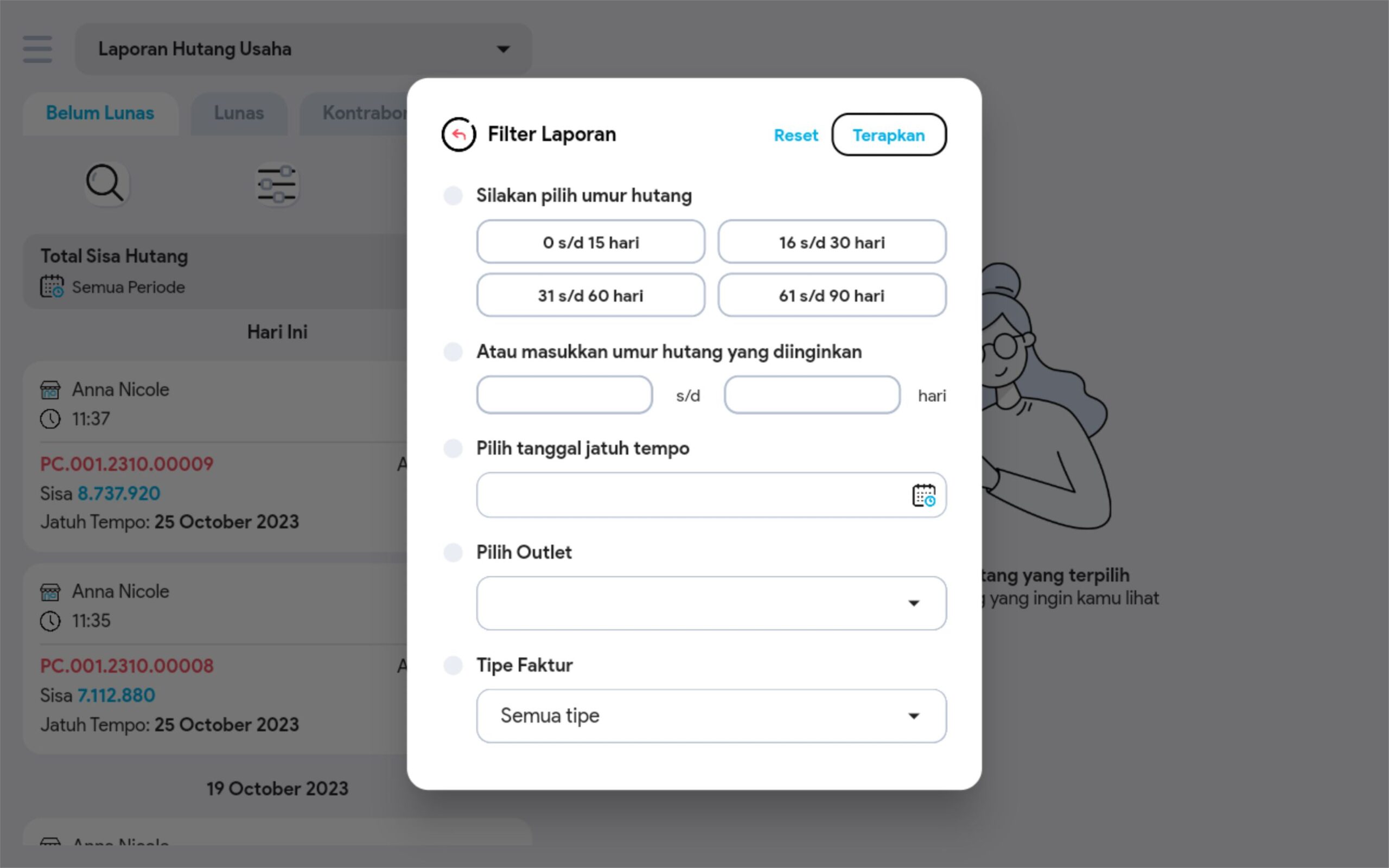4. Untuk mencari transaksi tertentu, gunakan pembatasan filter jika diperlukan (tanggal jatuh tempo, umur hutang, pemasok, outlet, no penerimaan/ kontrabon/surat jalan)