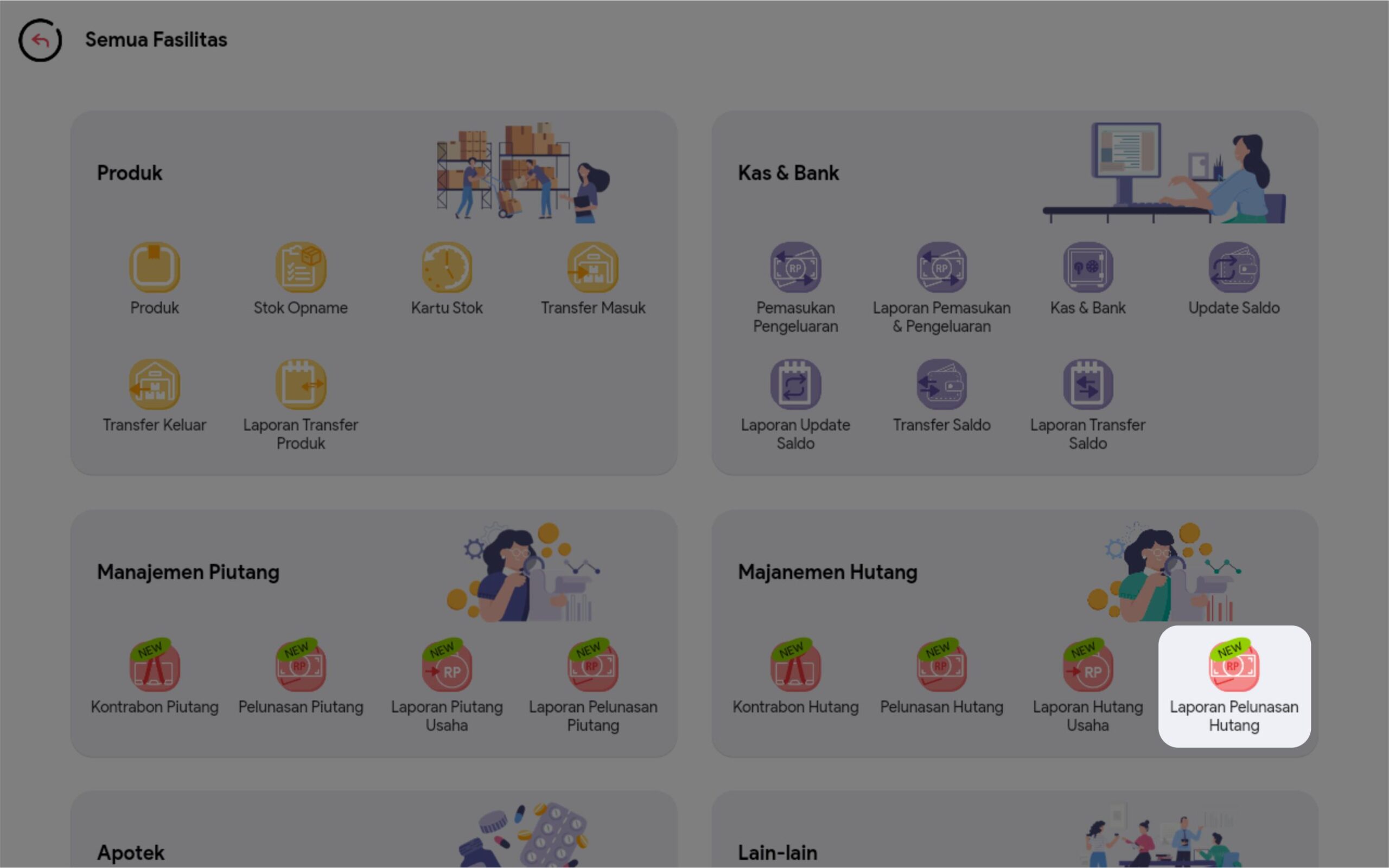 1.  Pilih menu Laporan Pelunasan Hutang di halaman menu utama. Atau jika Anda tidak menemukan menu Laporan Pelunasan Hutang di halaman utama, Anda dapat mengklik Semua Fasilitas, kemudian pilih menu Laporan Pelunasan Hutang