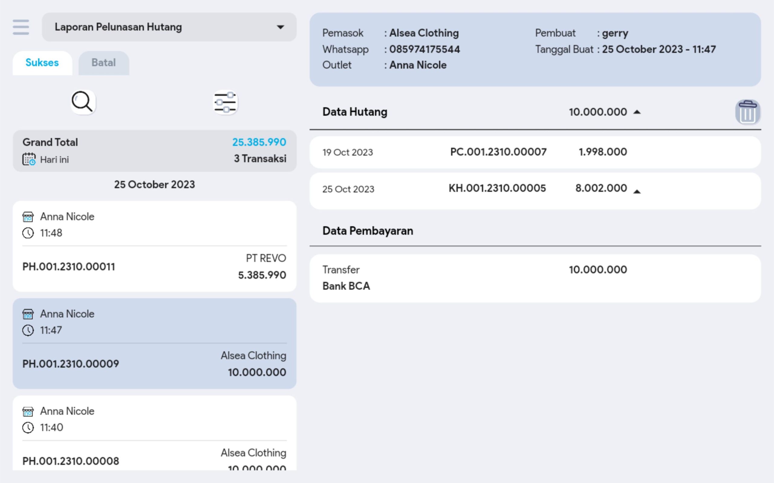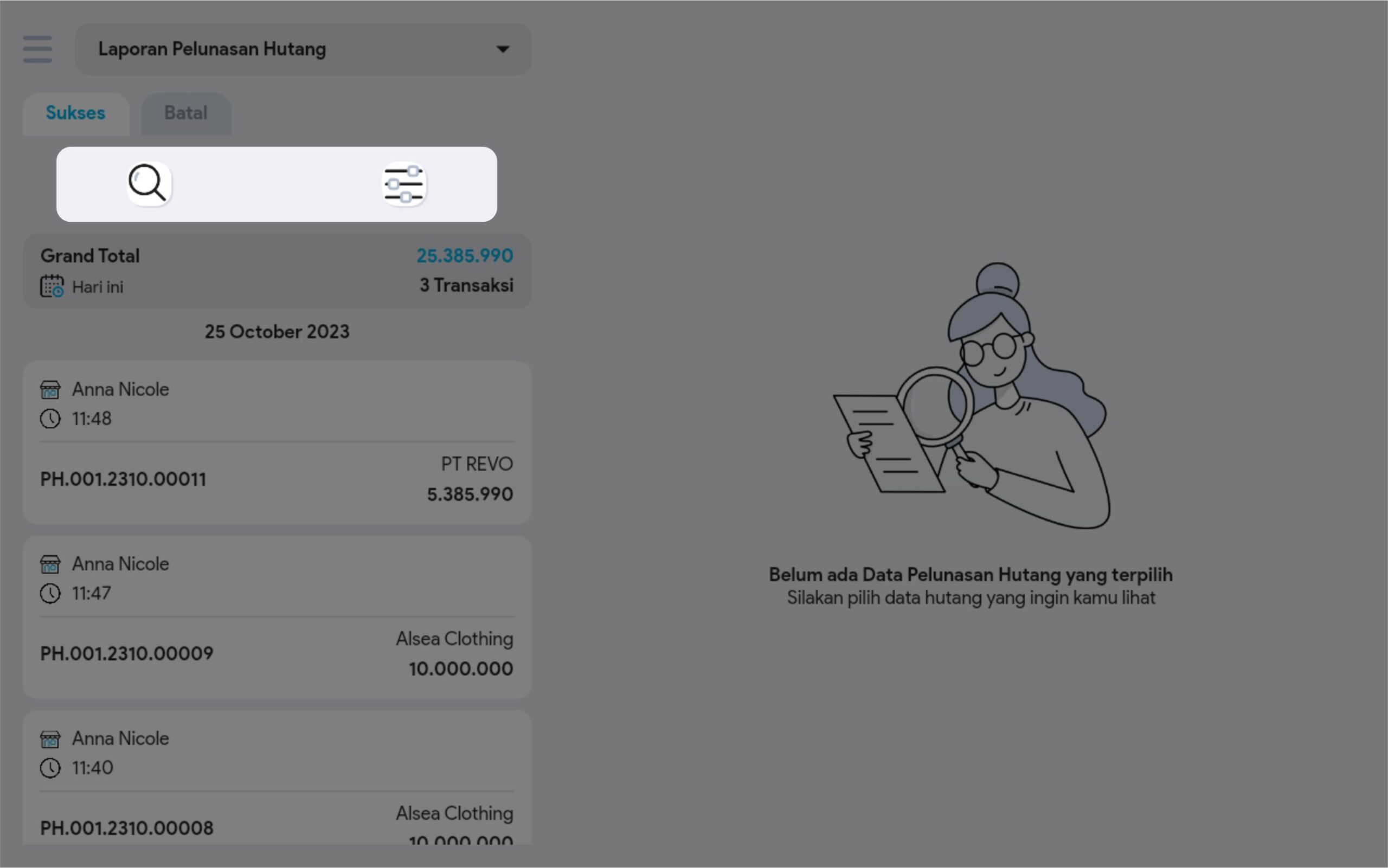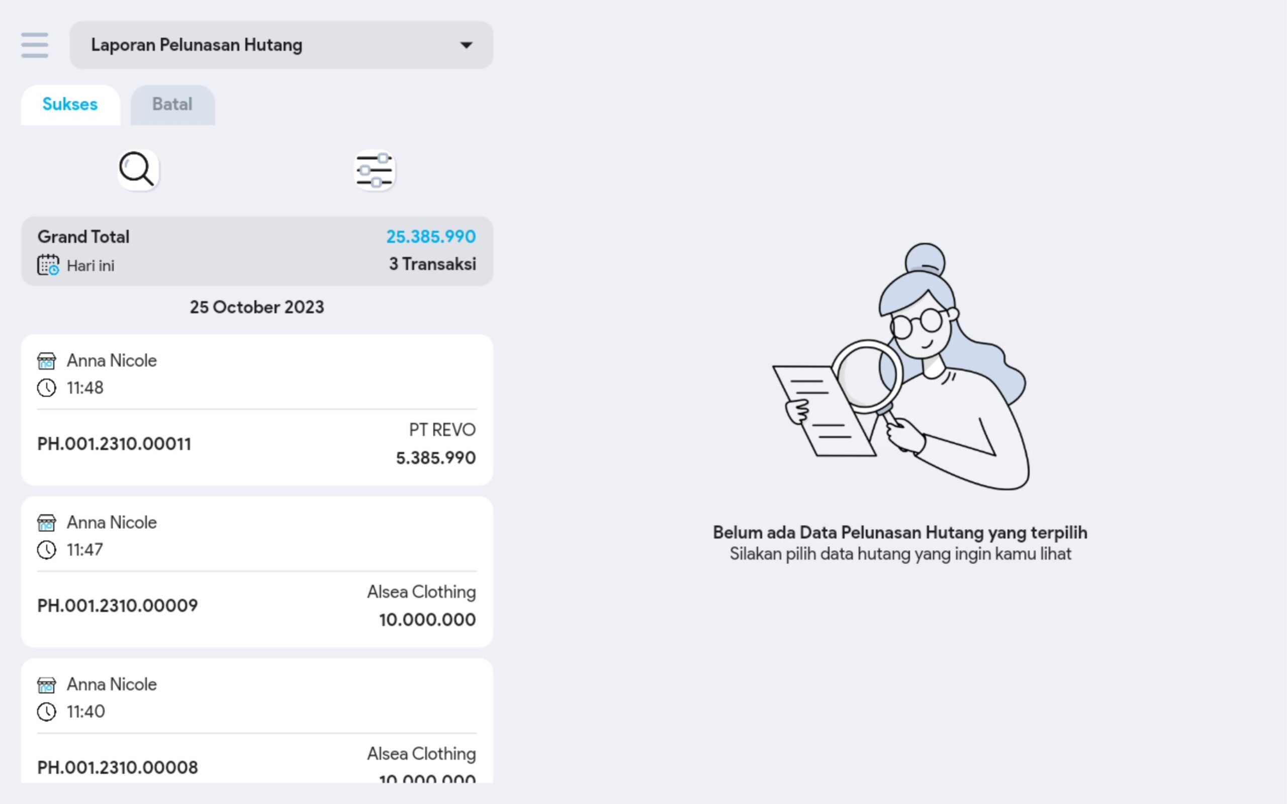 4.  Cari dan pilih transaksi pelunasan hutang yang diinginkan untuk melihat informasi lebih detail