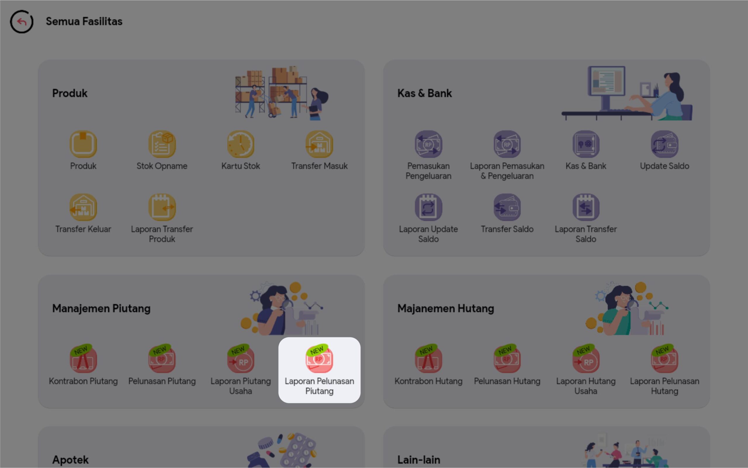 1. Pilih menu Laporan Pelunasan Piutang di halaman menu utama. Atau jika Anda tidak menemukan menu Laporan Pelunasan Piutang di halaman utama, Anda dapat mengklik Semua Fasilitas, kemudian pilih menu Laporan Pelunasan Piutang