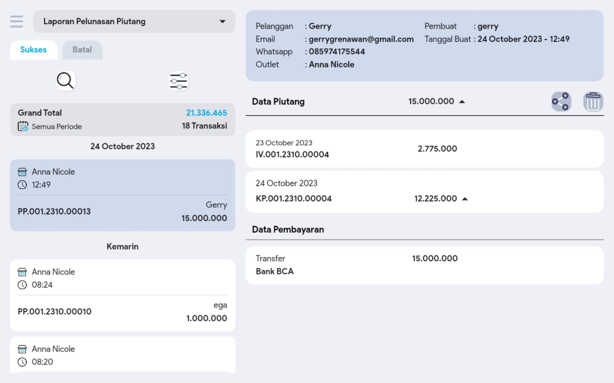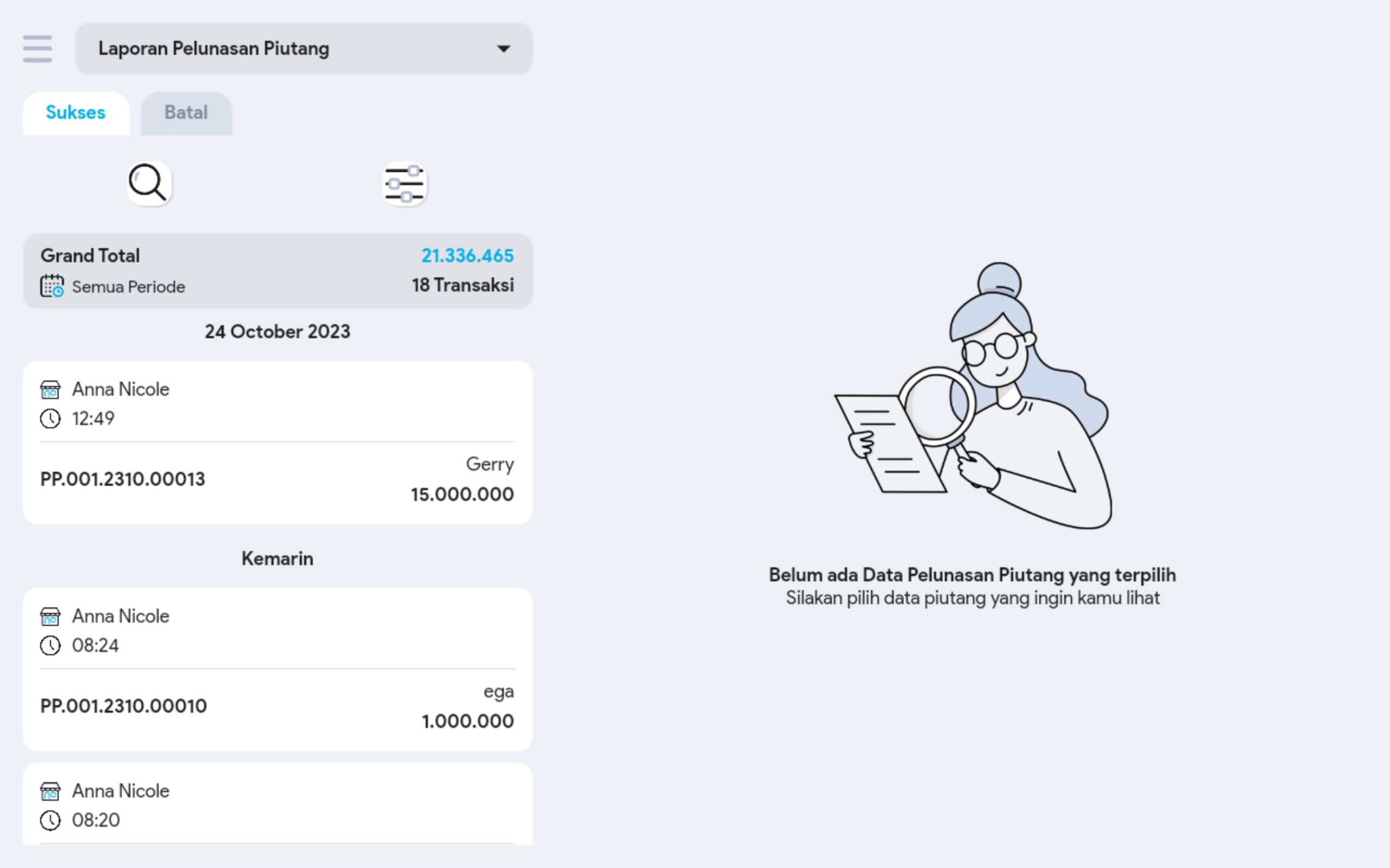 4. Cari dan pilih transaksi pelunasan piutang yang diinginkan untuk melihat informasi lebih detail
