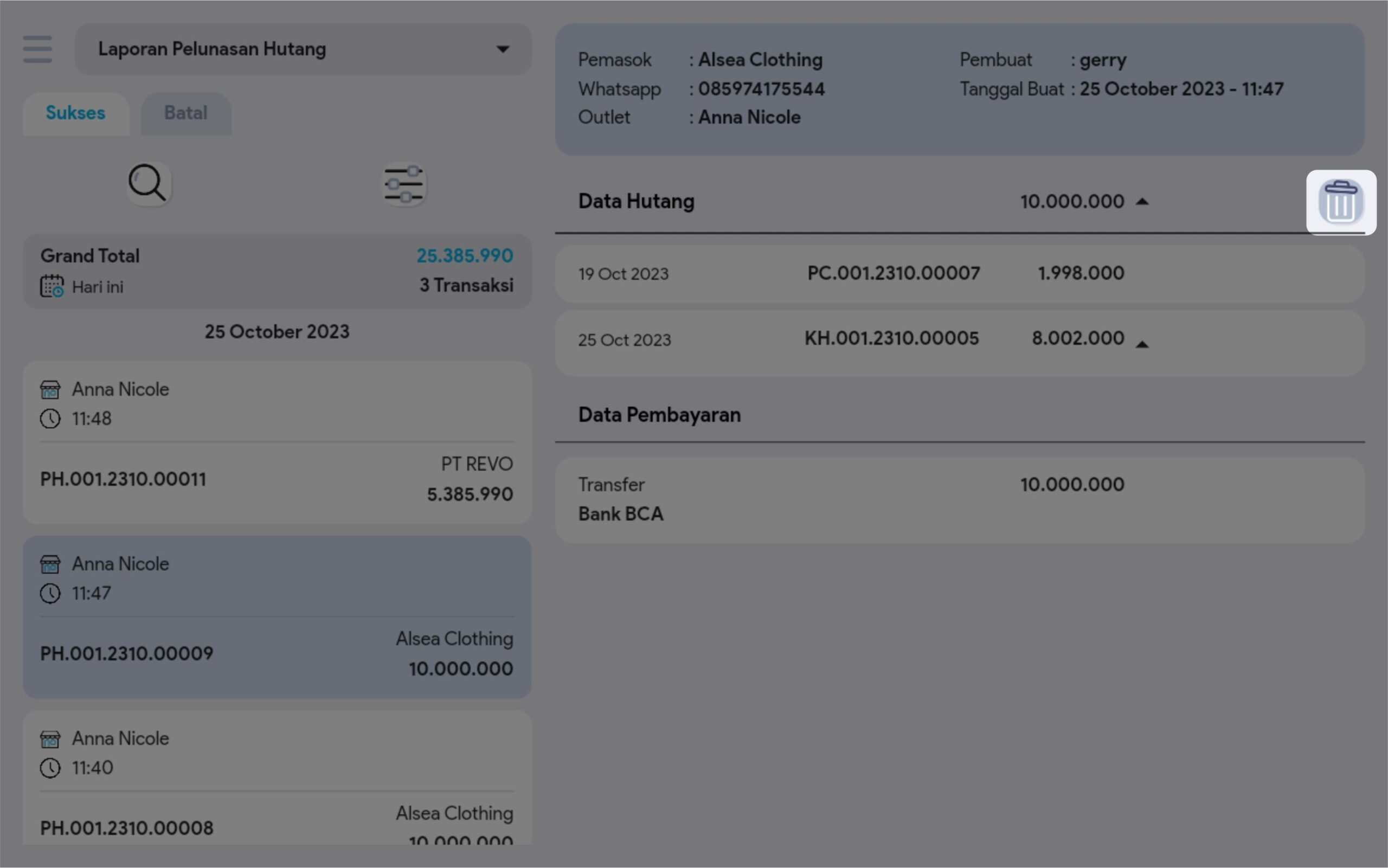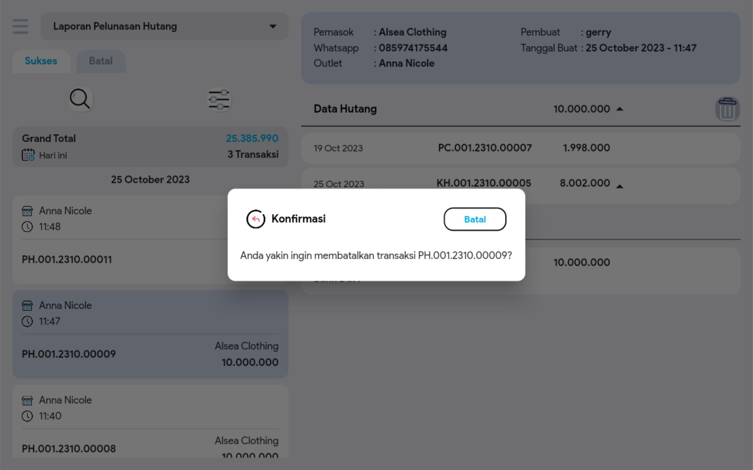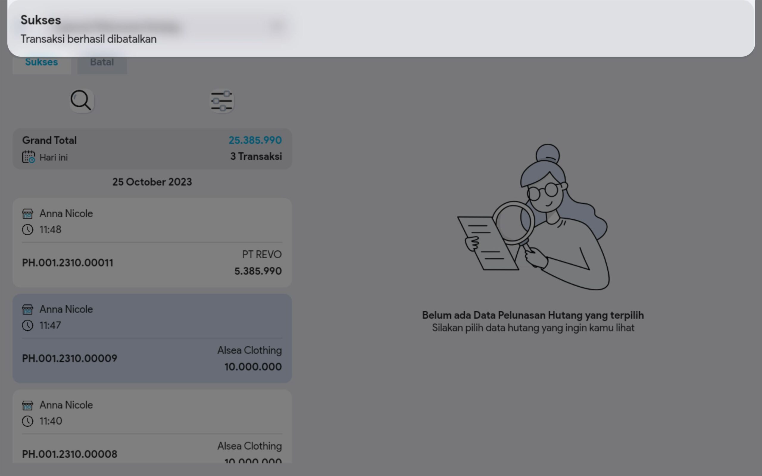 2.   Cari transaksi pelunasan yang diinginkan. Gunakan pembatasan filter jika diperlukan (tanggal, pemasok, outlet, nomor pelunasan/ penerimaan/ kontrabon)