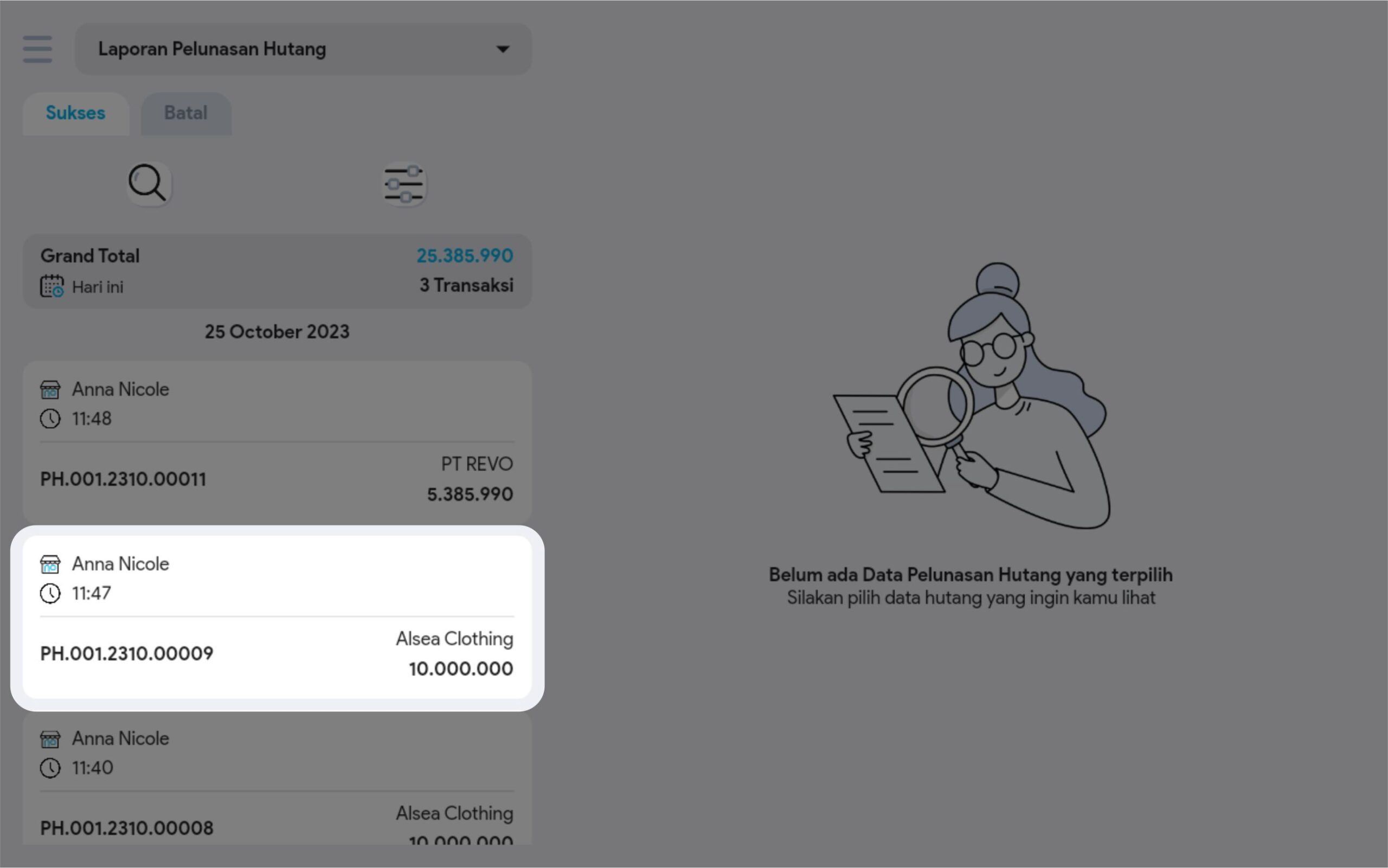 1.  Pilih menu Laporan Pelunasan Hutang di halaman menu utama. Atau jika Anda tidak menemukan menu Laporan Pelunasan Hutang di halaman utama, Anda dapat mengklik Semua Fasilitas, kemudian pilih menu Laporan Pelunasan Hutang