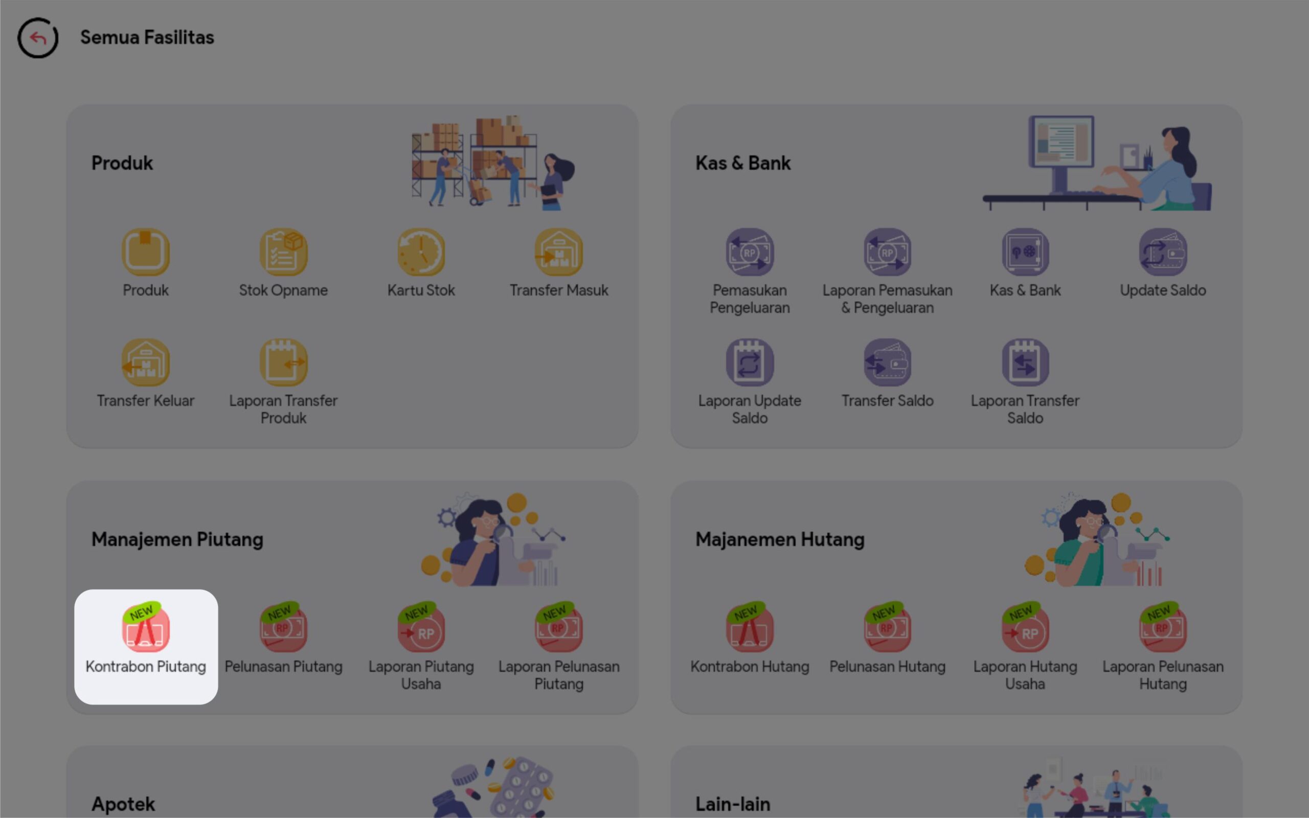 1. Pertama adalah dengan pilih menu Kontrabon Piutang di halaman menu utama. Atau jika Anda tidak menemukan menu Kontrabon Piutang di halaman utama, Anda dapat mengklik Semua Fasilitas, kemudian pilih menu Kontrabon Piutang