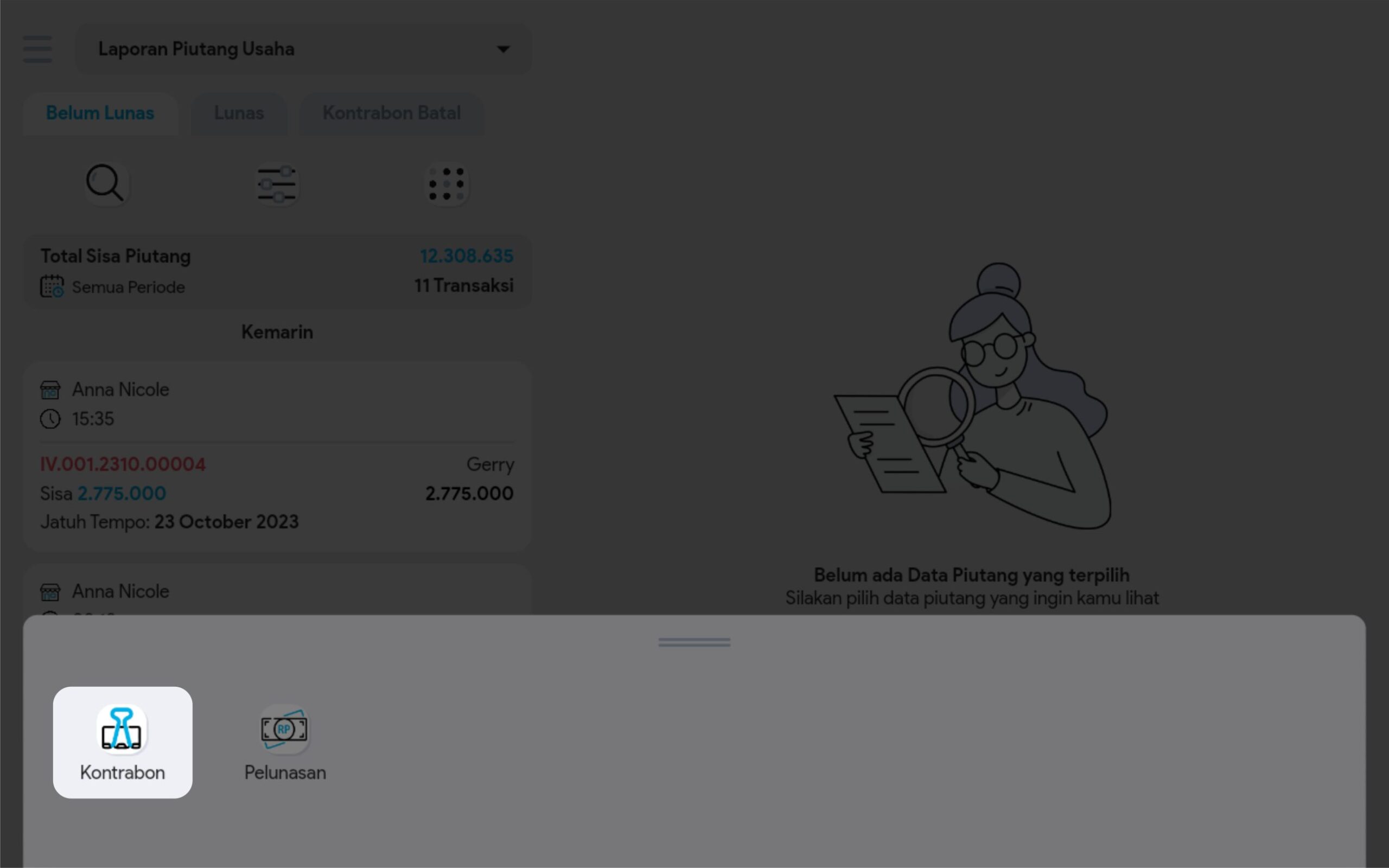 Pilih Lihat Laporan Piutang Usaha untuk melihat laporan kontrabon atau pilih +Kontrabon baru untuk membuat kontrabon piutang lainnya