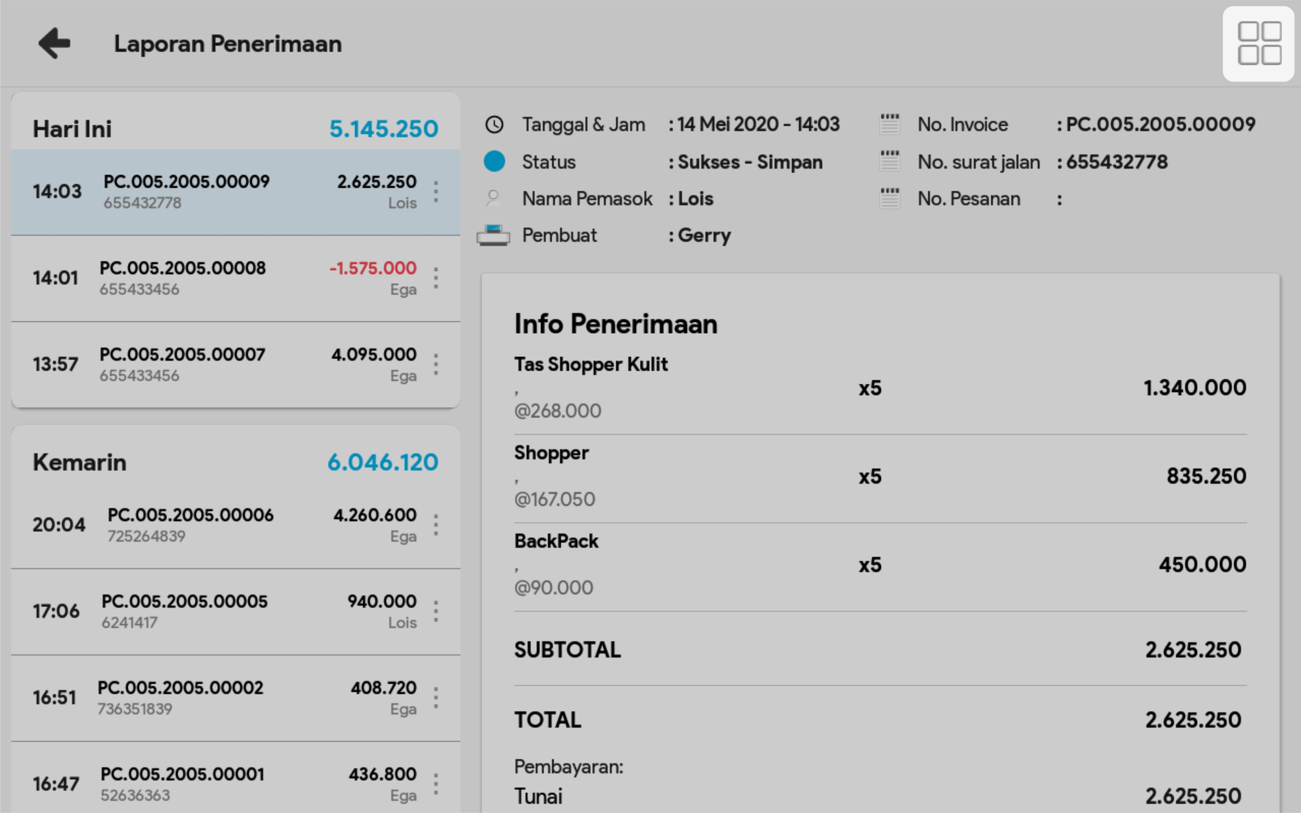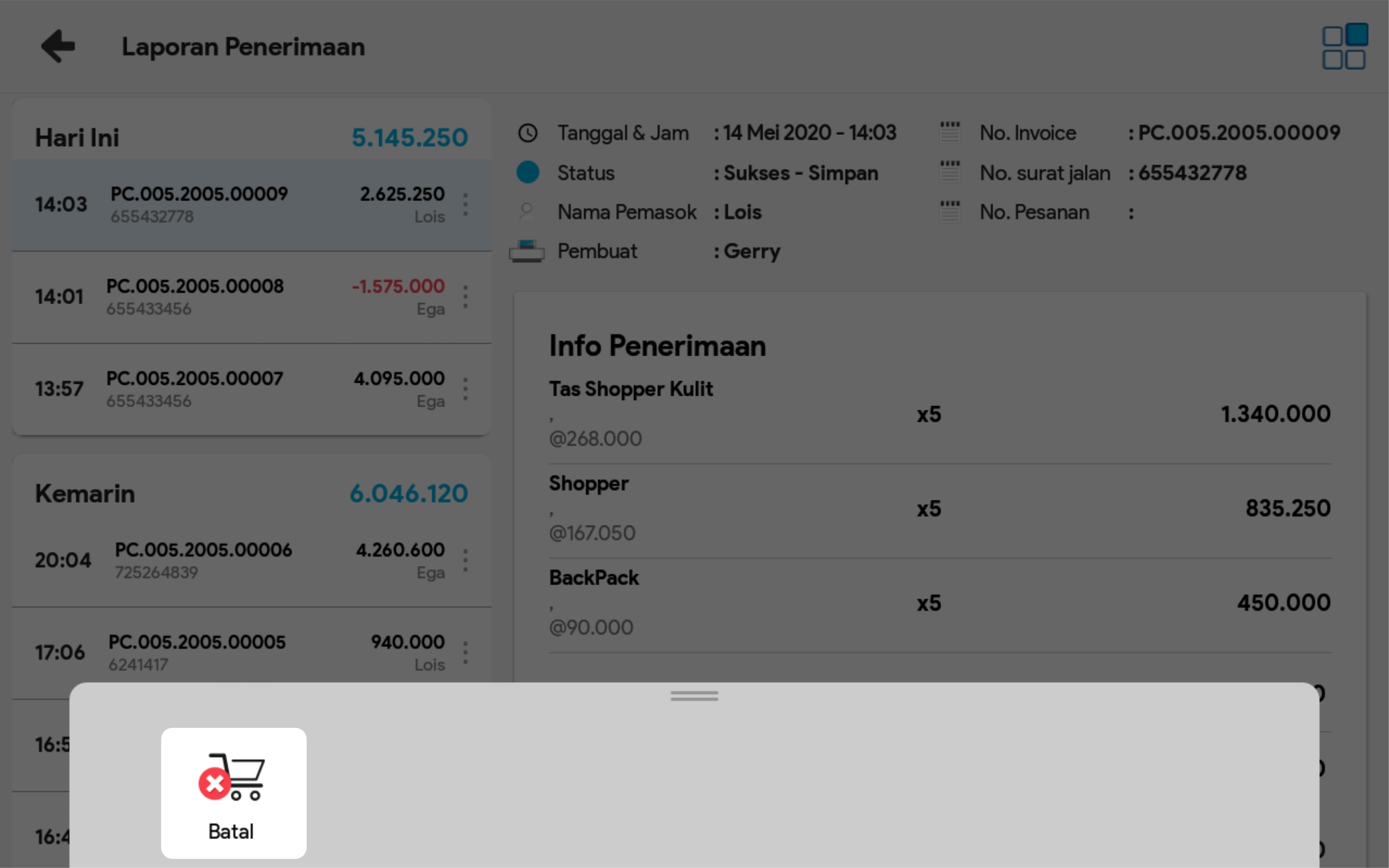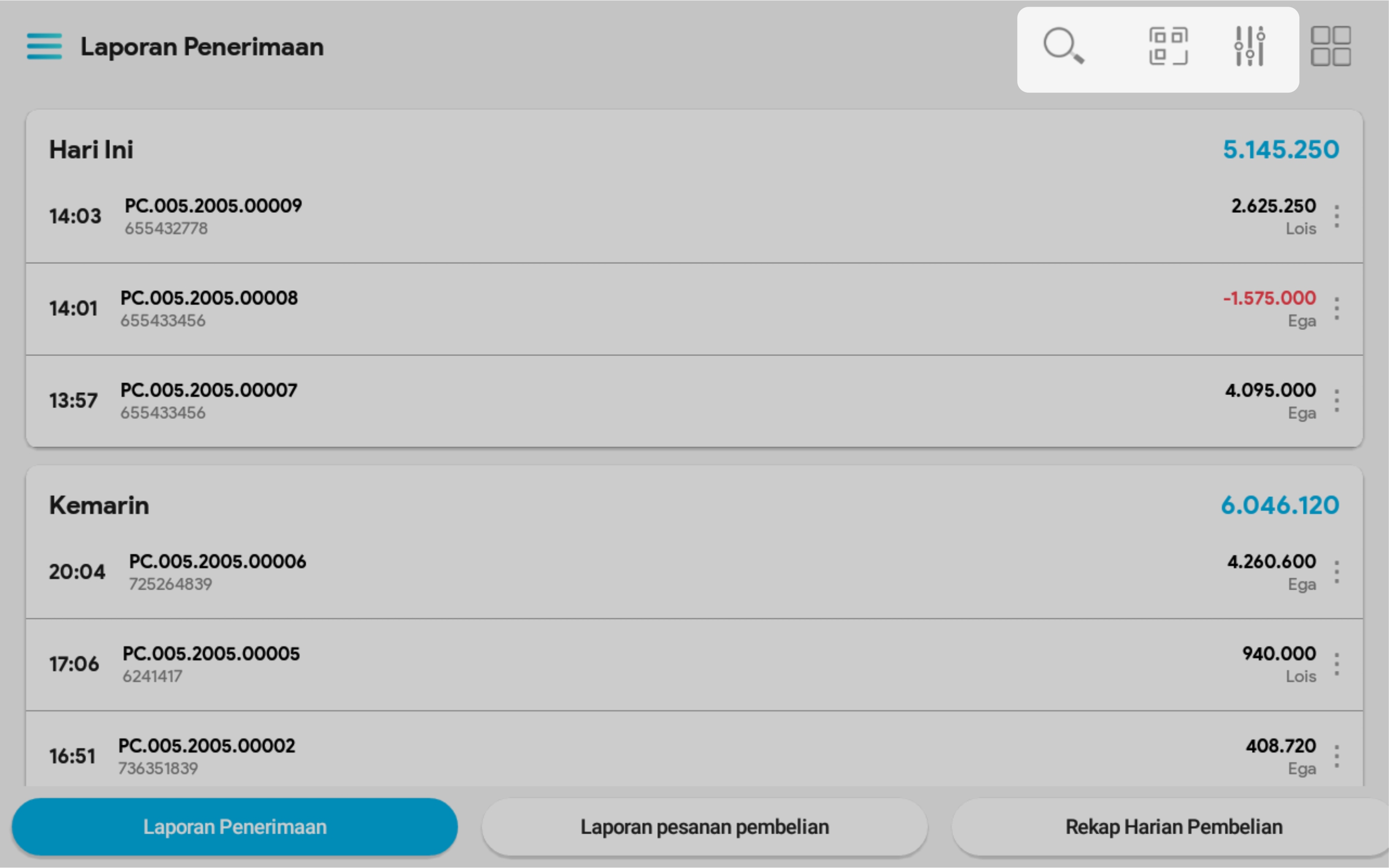 2. Cari transaksi penerimaan yang hendak dibatalkan, melalui pencarian No transaksi / Nama pemasok, atau persempit pencarian dengan menggunakan filter tanggal