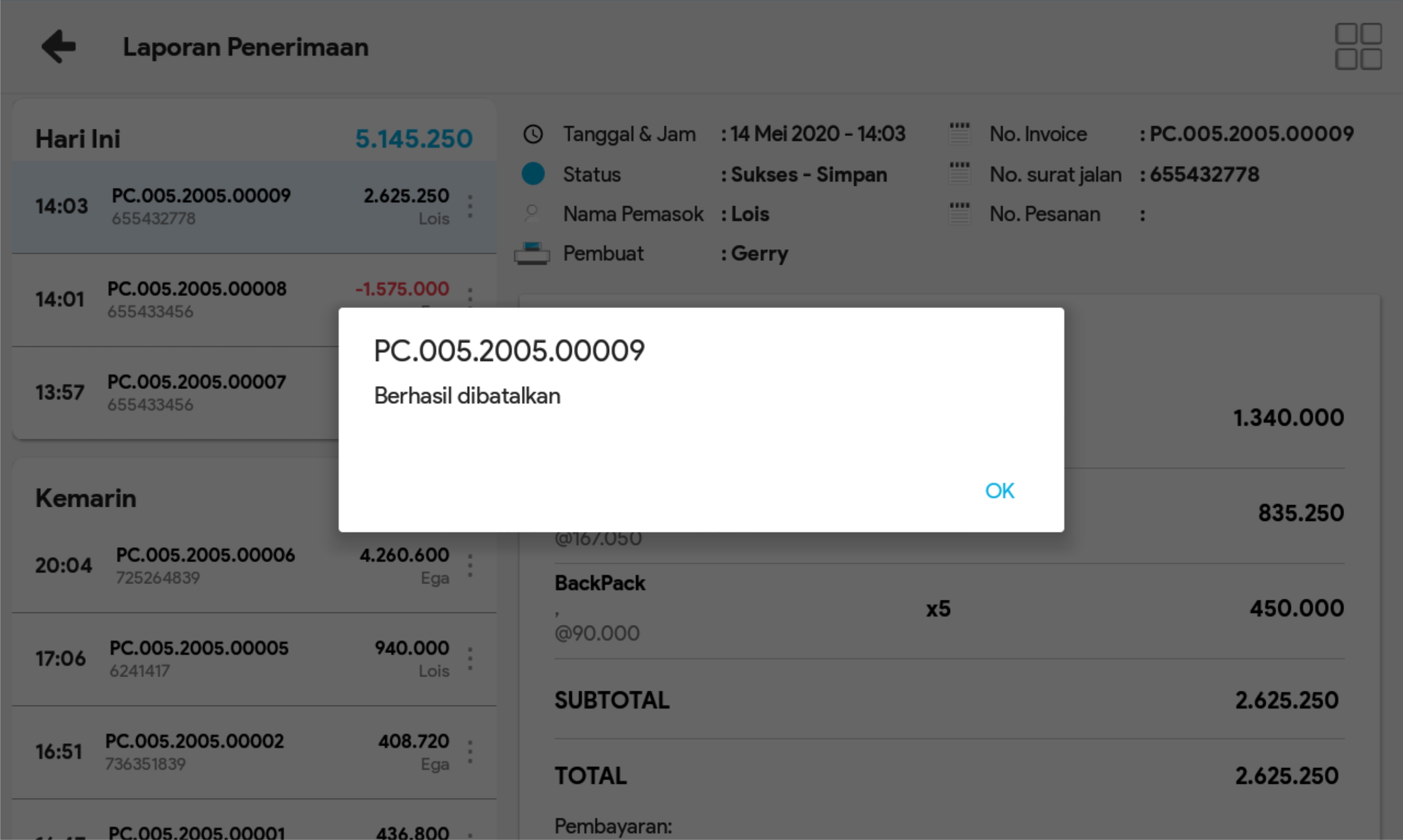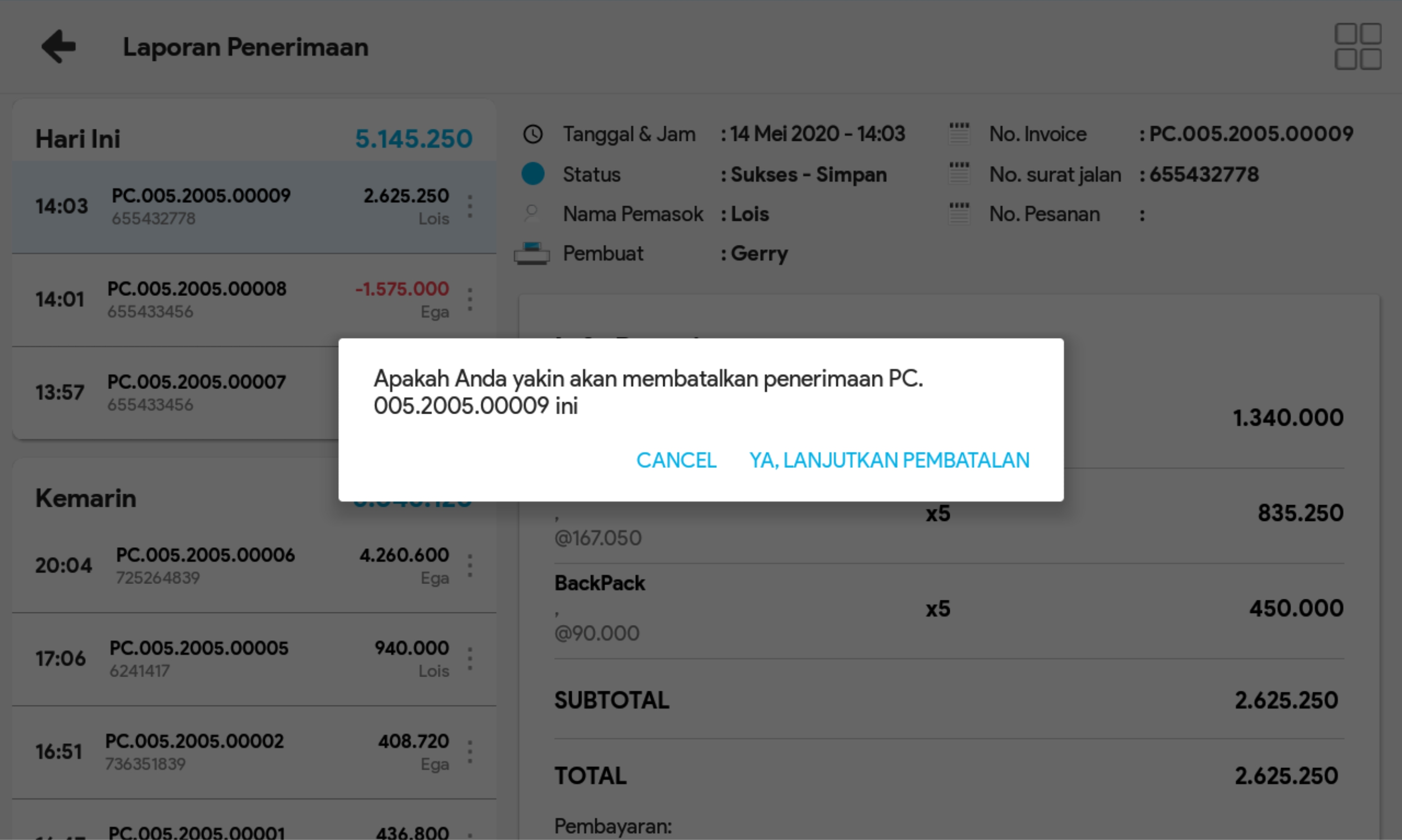 6. Pilih Ya, batalkan dan muncul notifikasi pembatalan berhasil