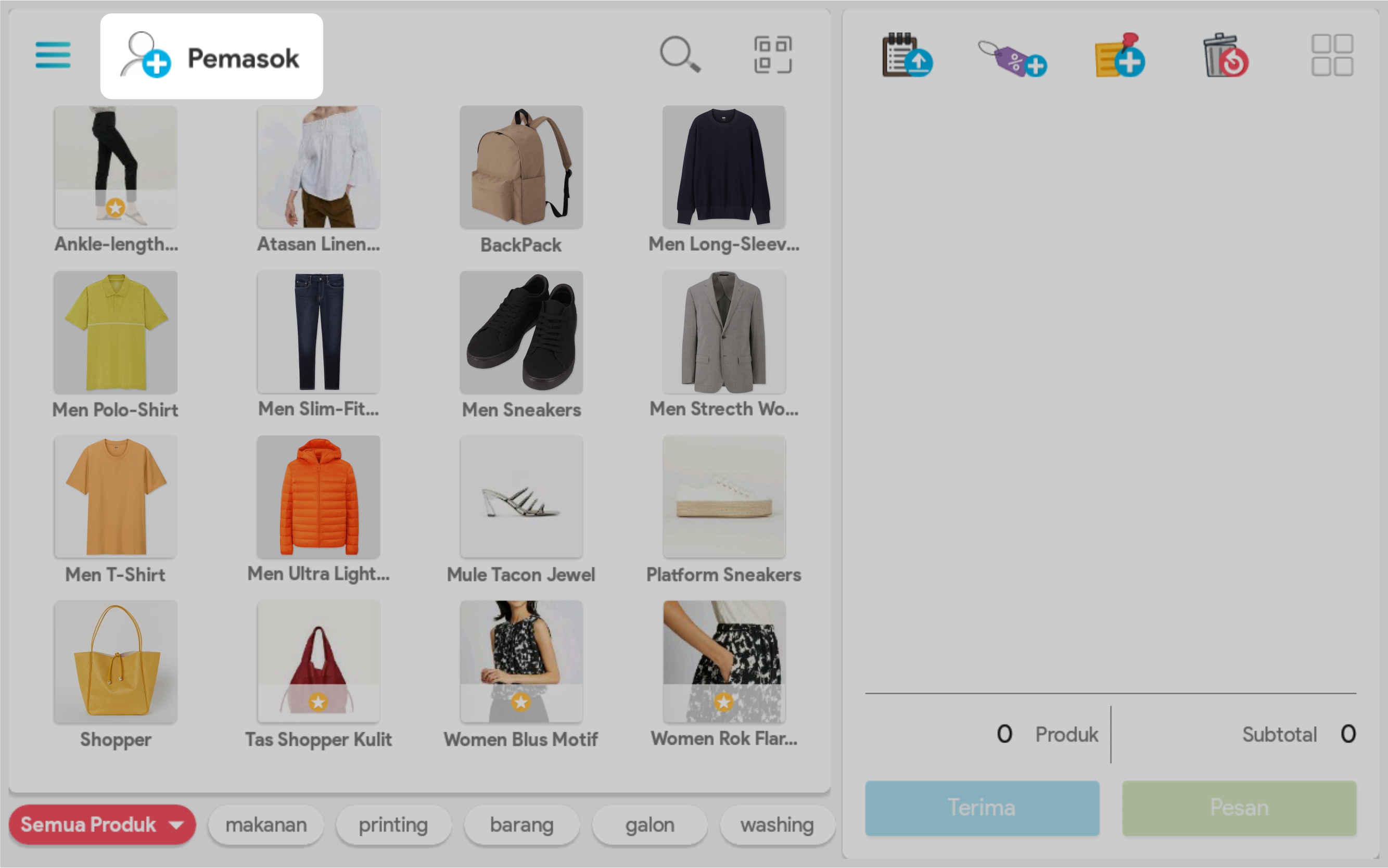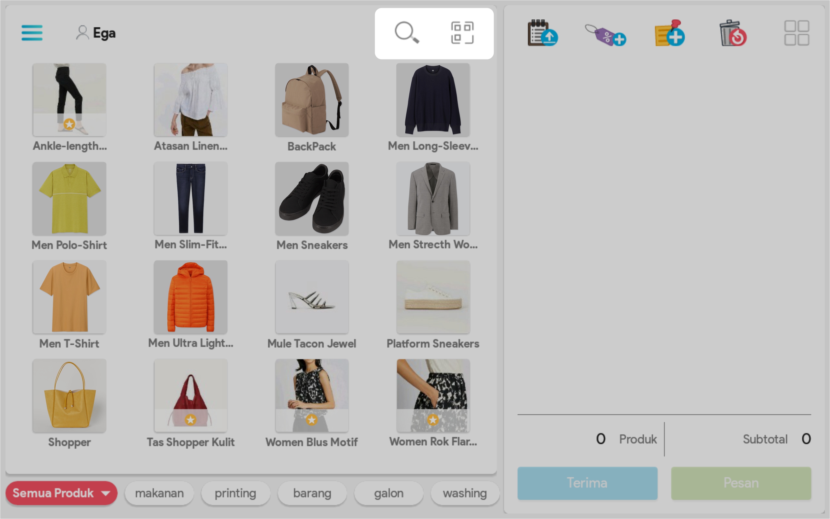 Gunakan pengaturan kategori, kolom pencarian, atau barcode produk untuk mempermudah pencarian