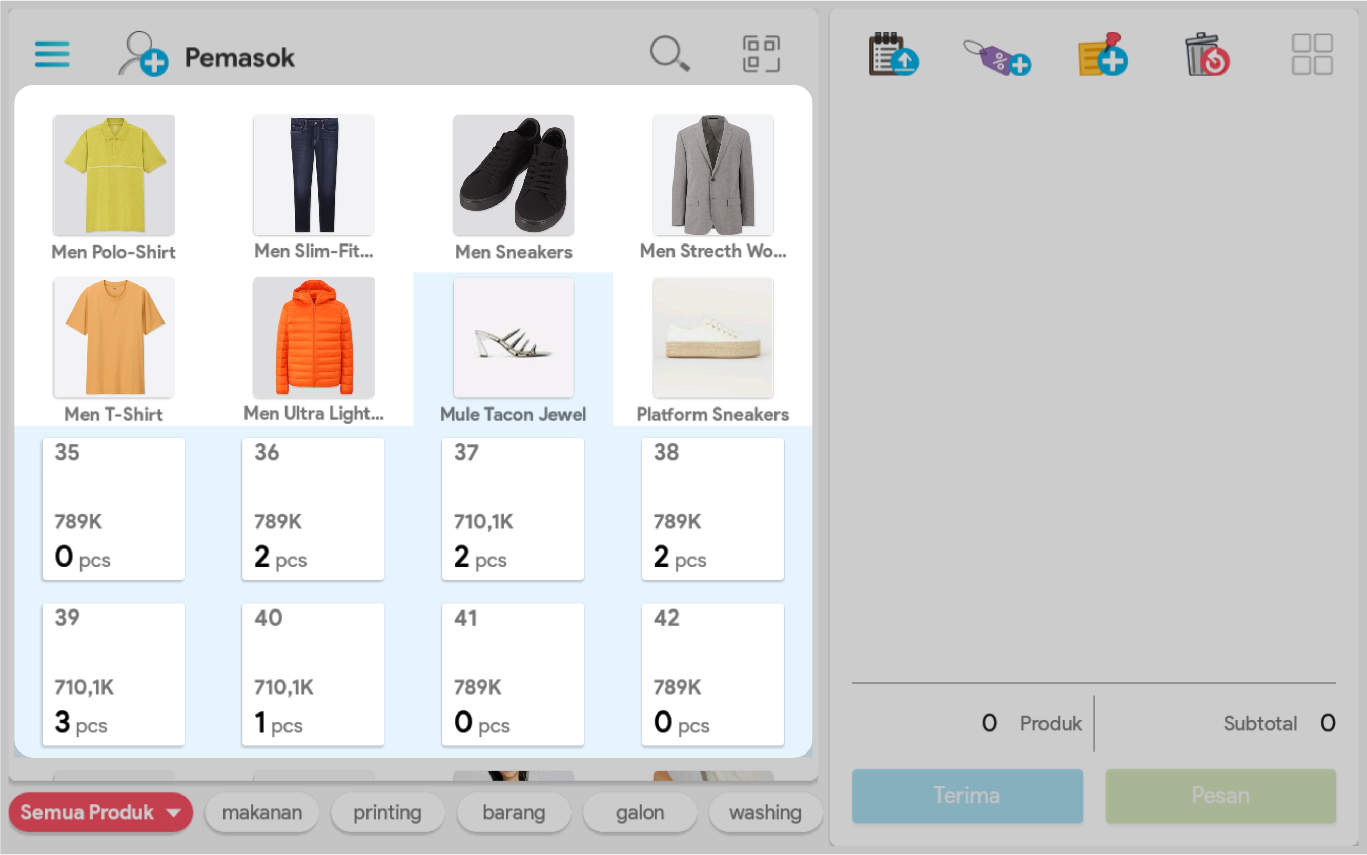 5. Masukkan jumlah produk dengan cara mengetuk produk sebanyak jumlah produk yang ingin ditransaksikan atau atur jumlah produk di segmen Keranjang