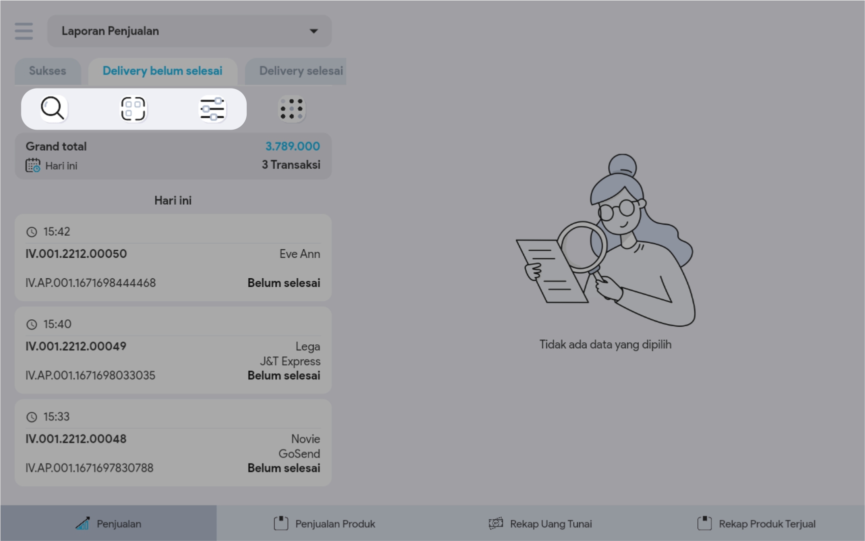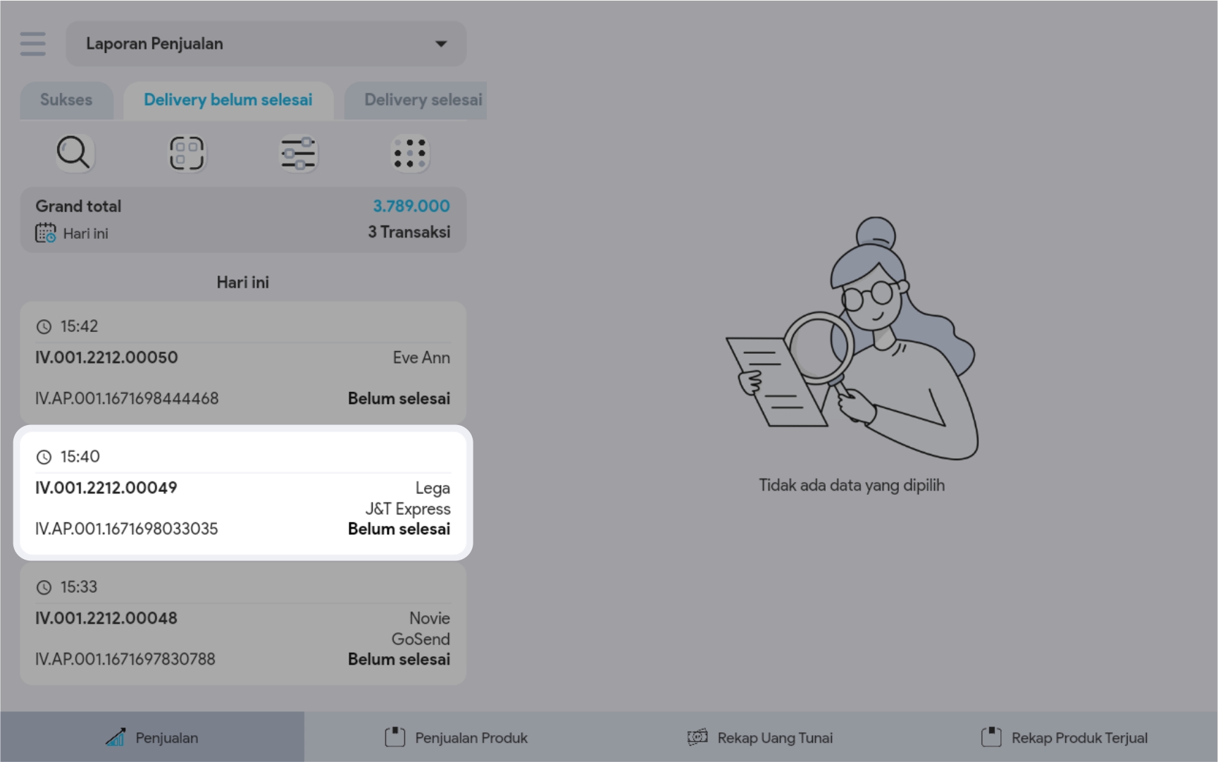 2. Pilih tabulasi Delivery Belum Selesai. Maka secara otomatis akan menampilkan transaksi yang belum selesai di terima pelanggan.