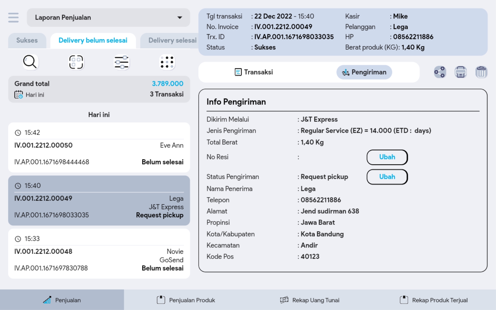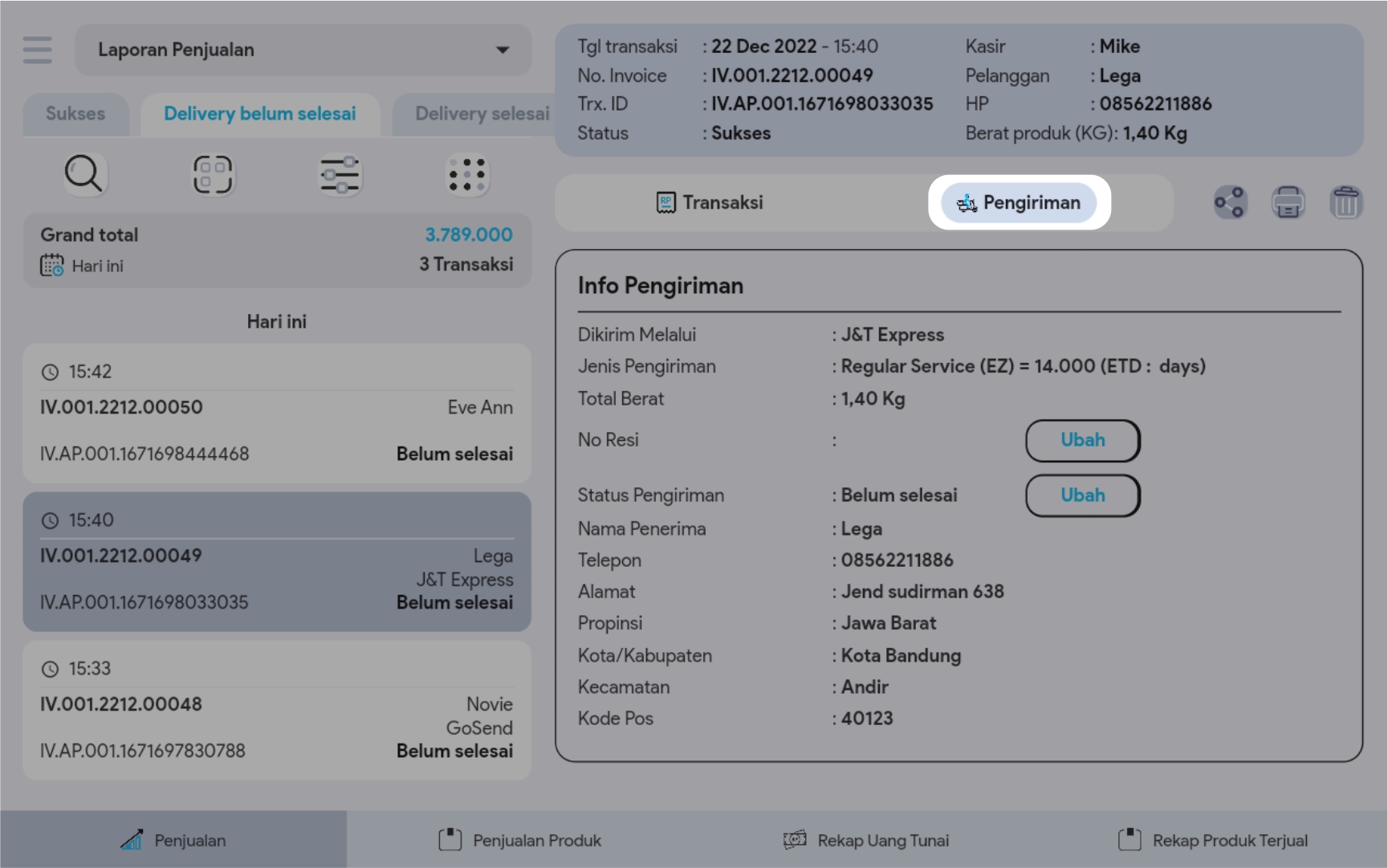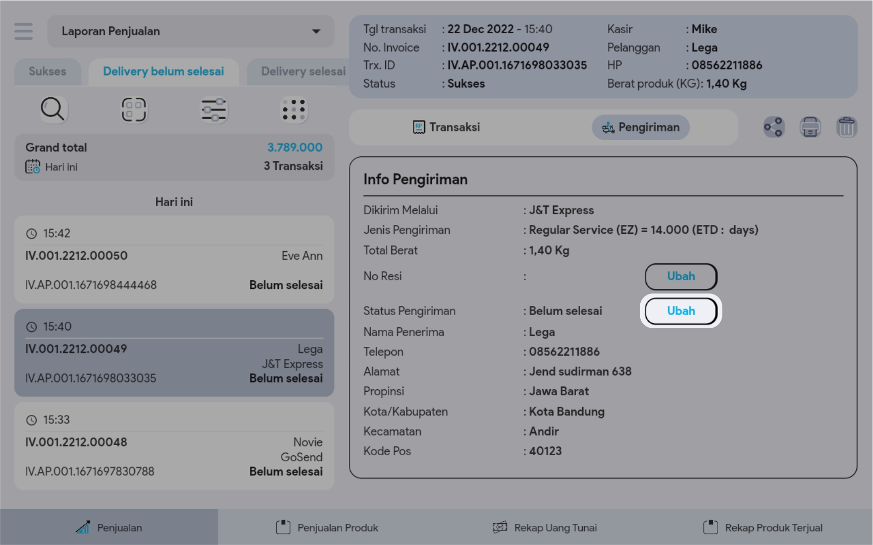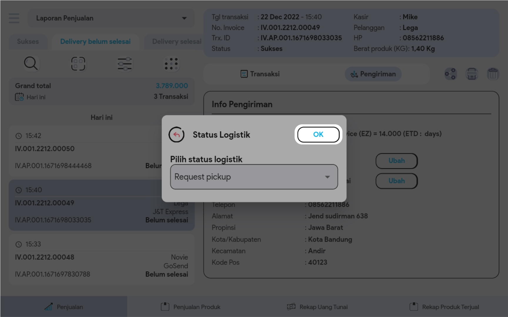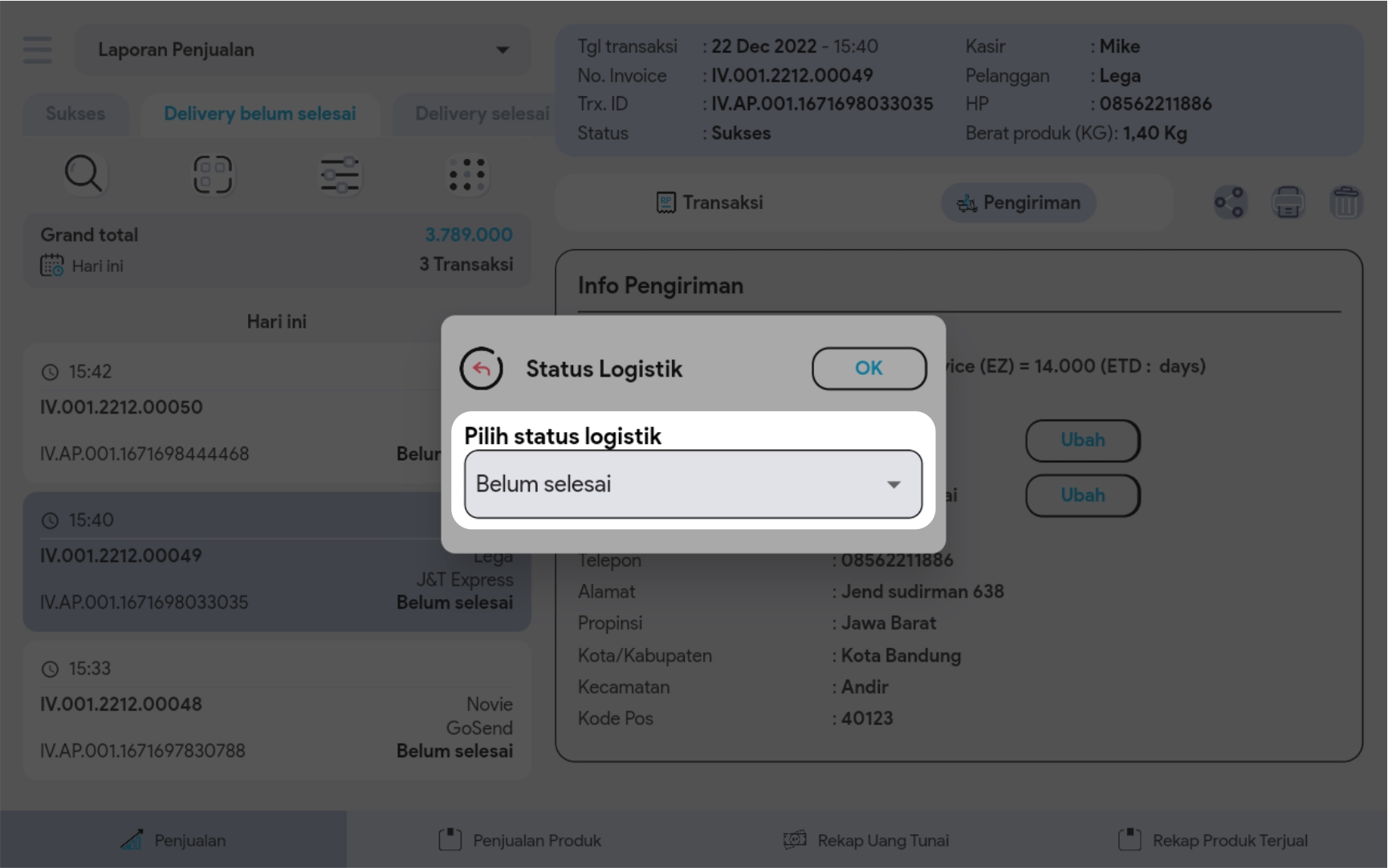Semua transaksi penjualan yang menggunakan ongkir, maka status ekspedisinya “belum selesai” dan berada di tabulasi delivery belum selesai pada index laporan. Status ini dapat digunakan untuk membedakan transaksi mana saja yang masih harus diproses untuk dikirim ke pelanggan. Berikut cara mengubah status ekspedisi:
