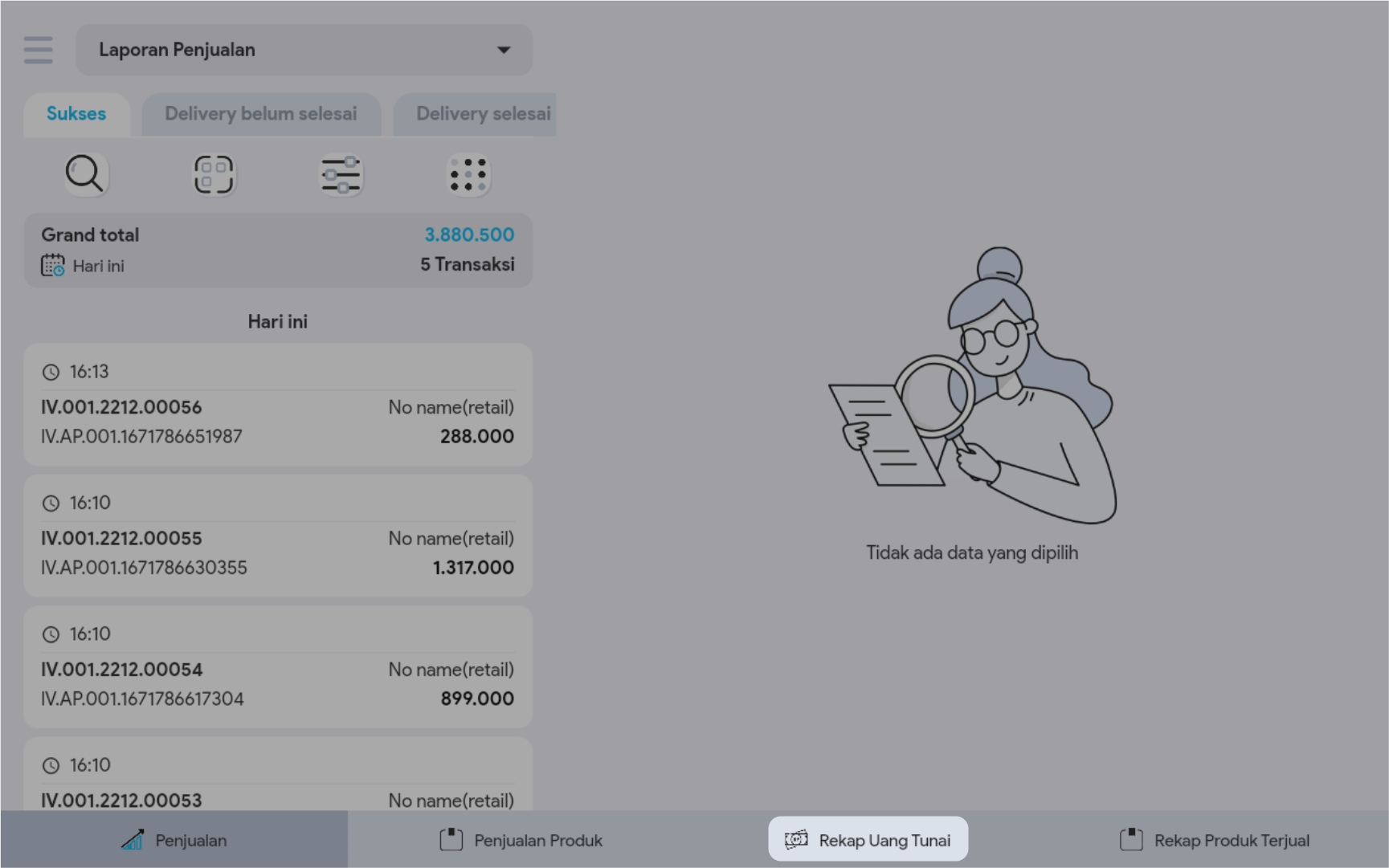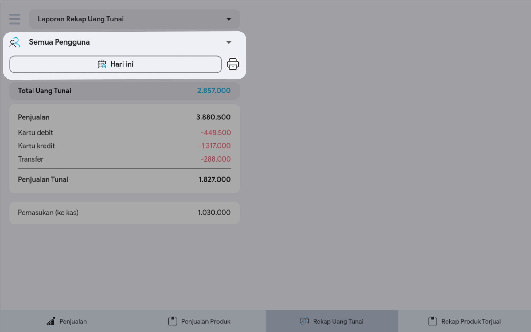 4. Sistem akan menyajikan total uang tunai yang Anda miliki dan jenis-jenis pembayaran yang diterima beserta jumlah nominalnya.
