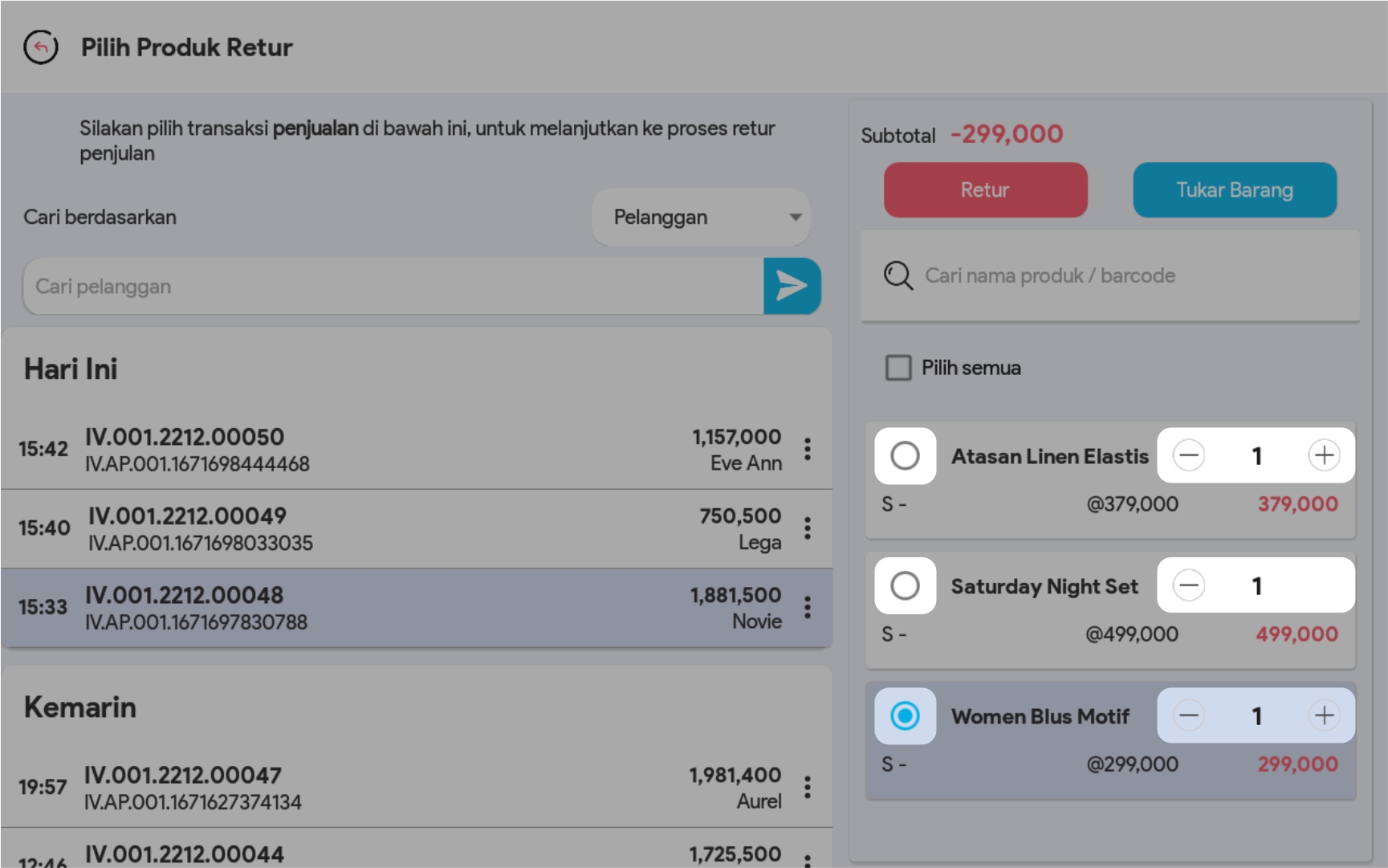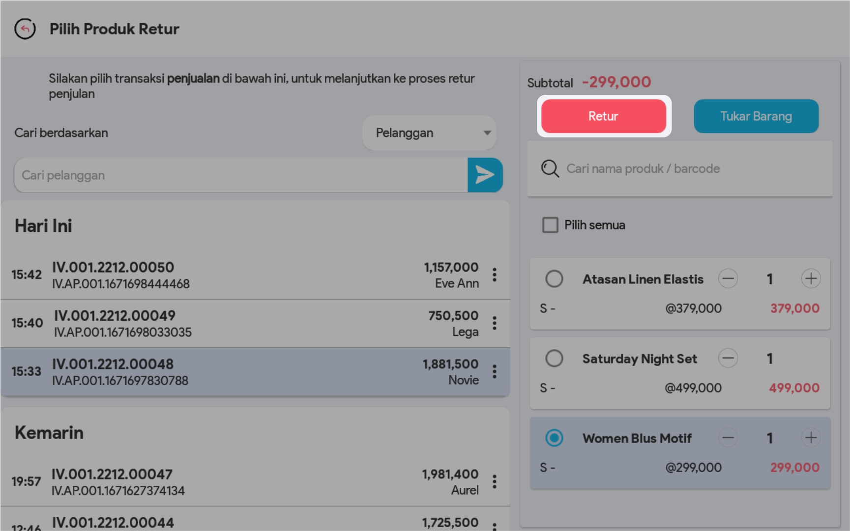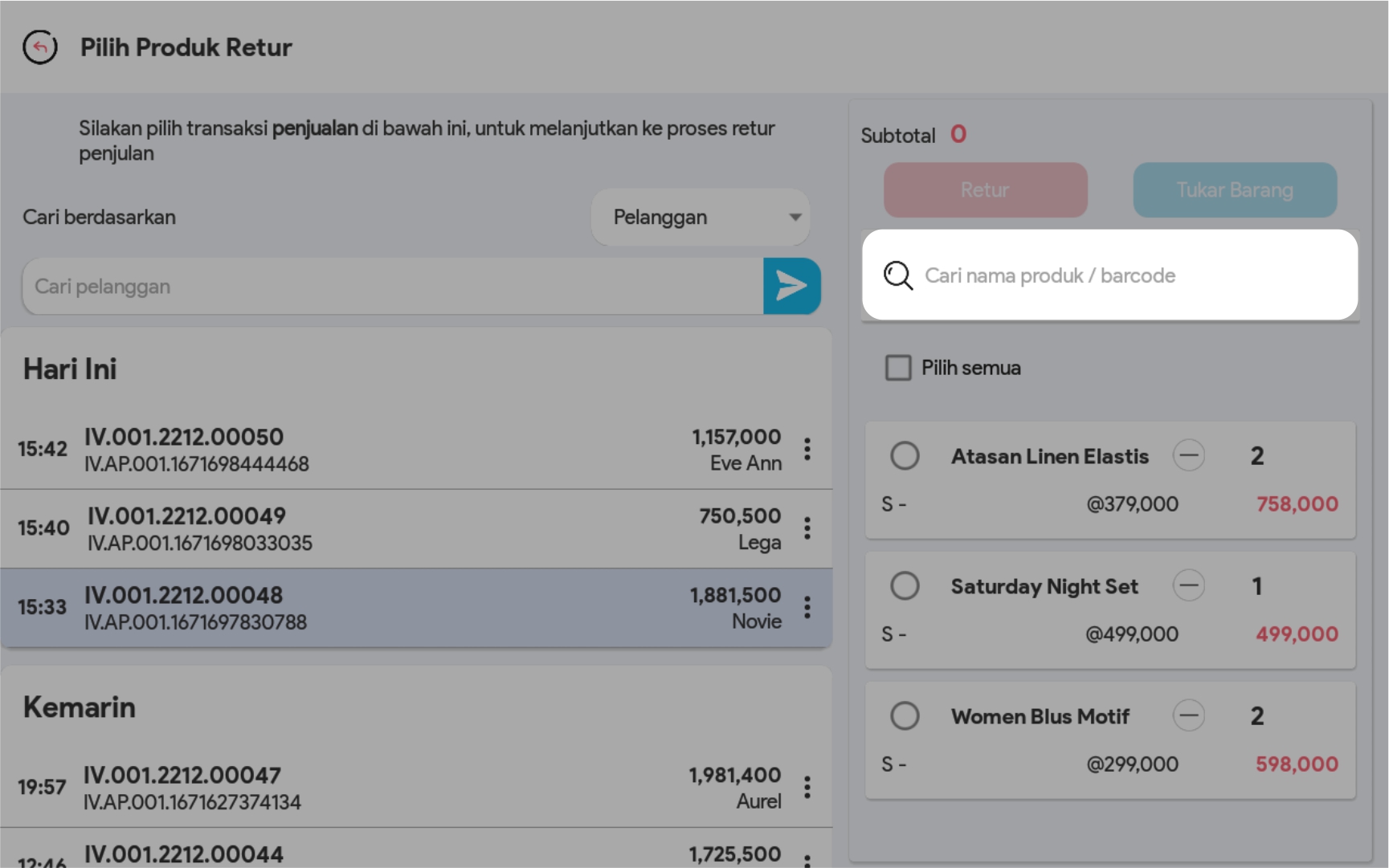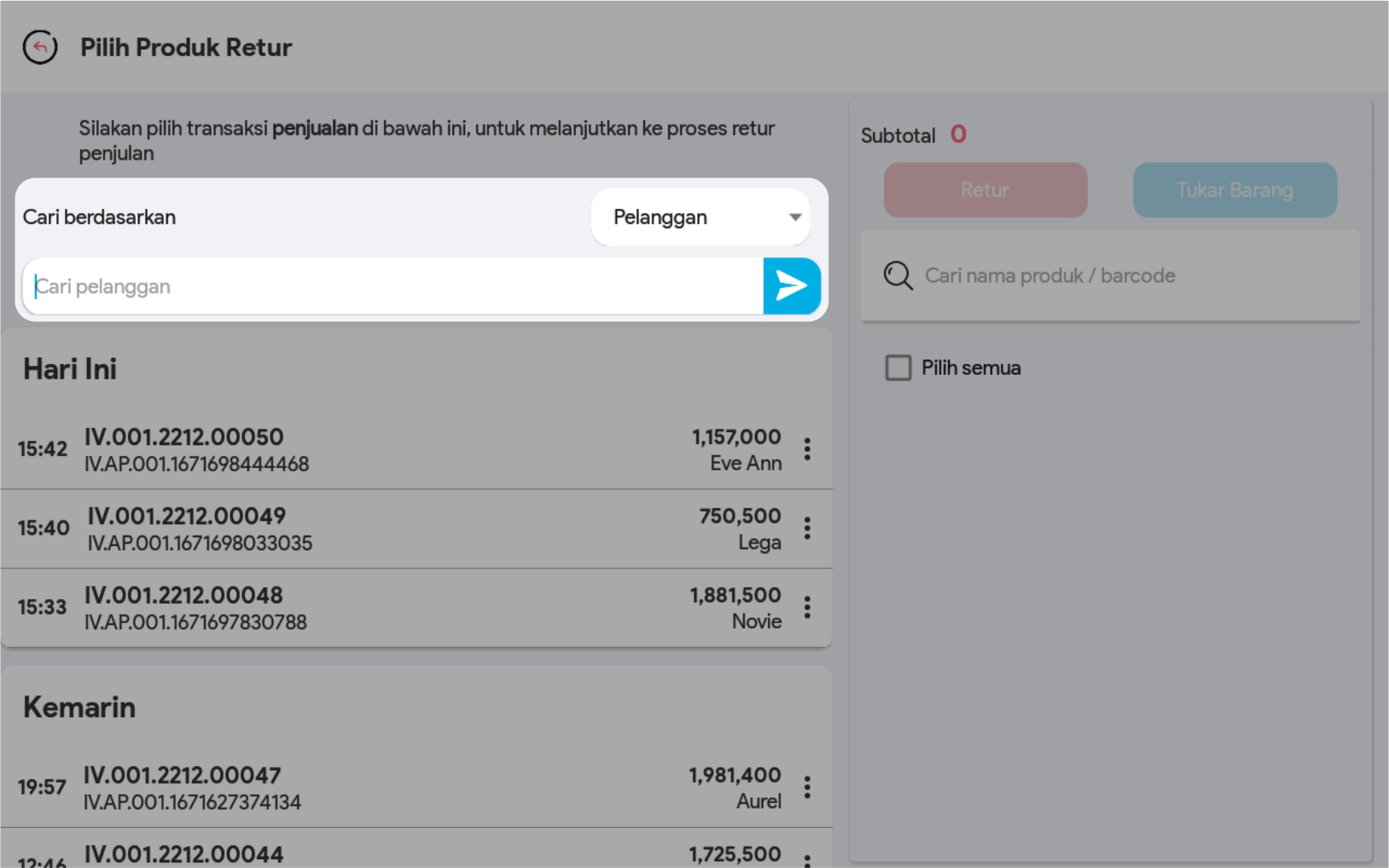 2. Lakukan pencarian transaksi yang akan diretur di kolom pencarian. Anda bisa melakukan pencarian berdasarkan Nama Pelanggan/Invoice/ID transaksi