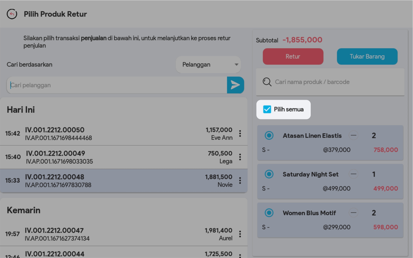5. Klik Pilih semua jika seluruh produk dalam satu transaksi tersebut akan diretur atau