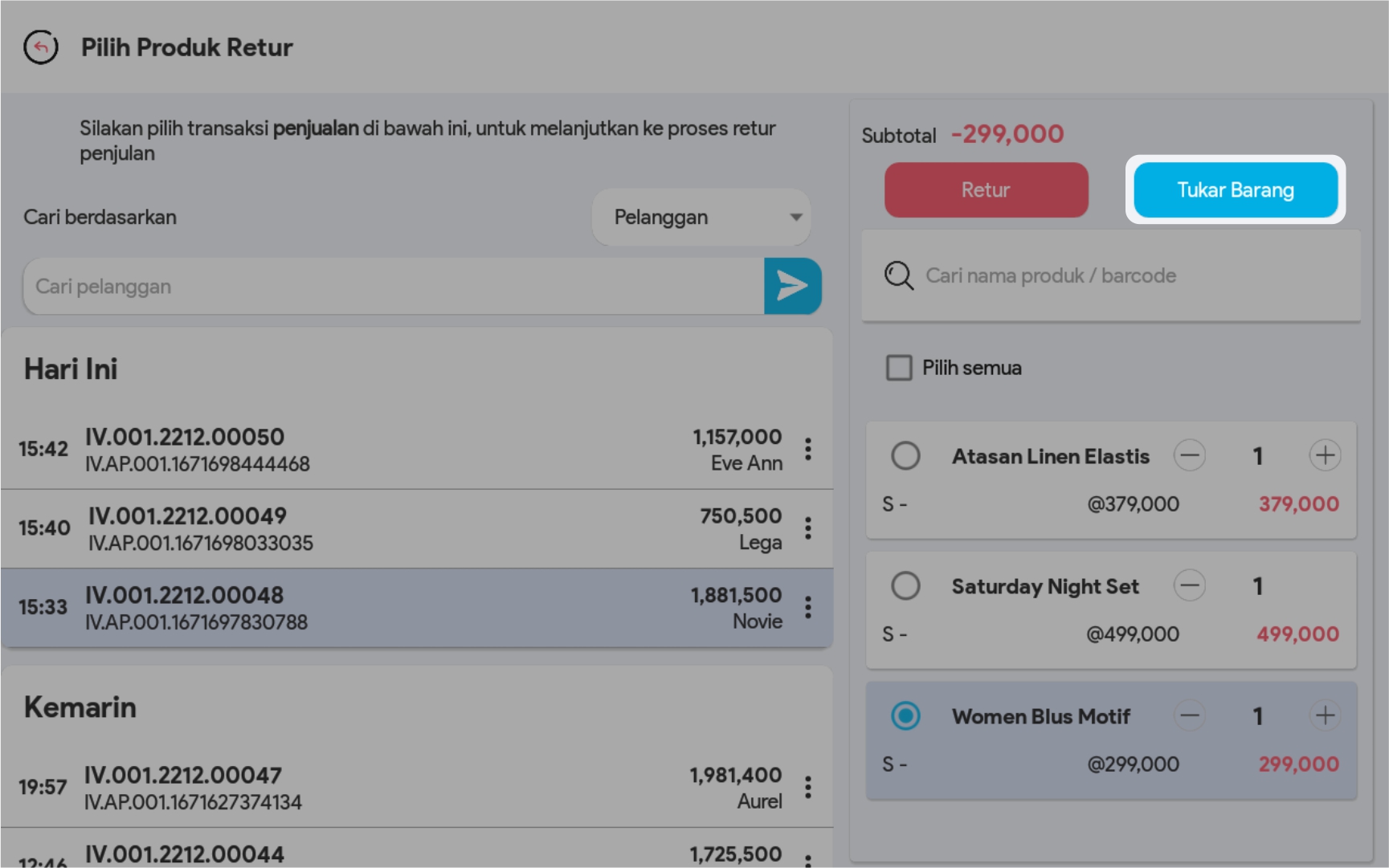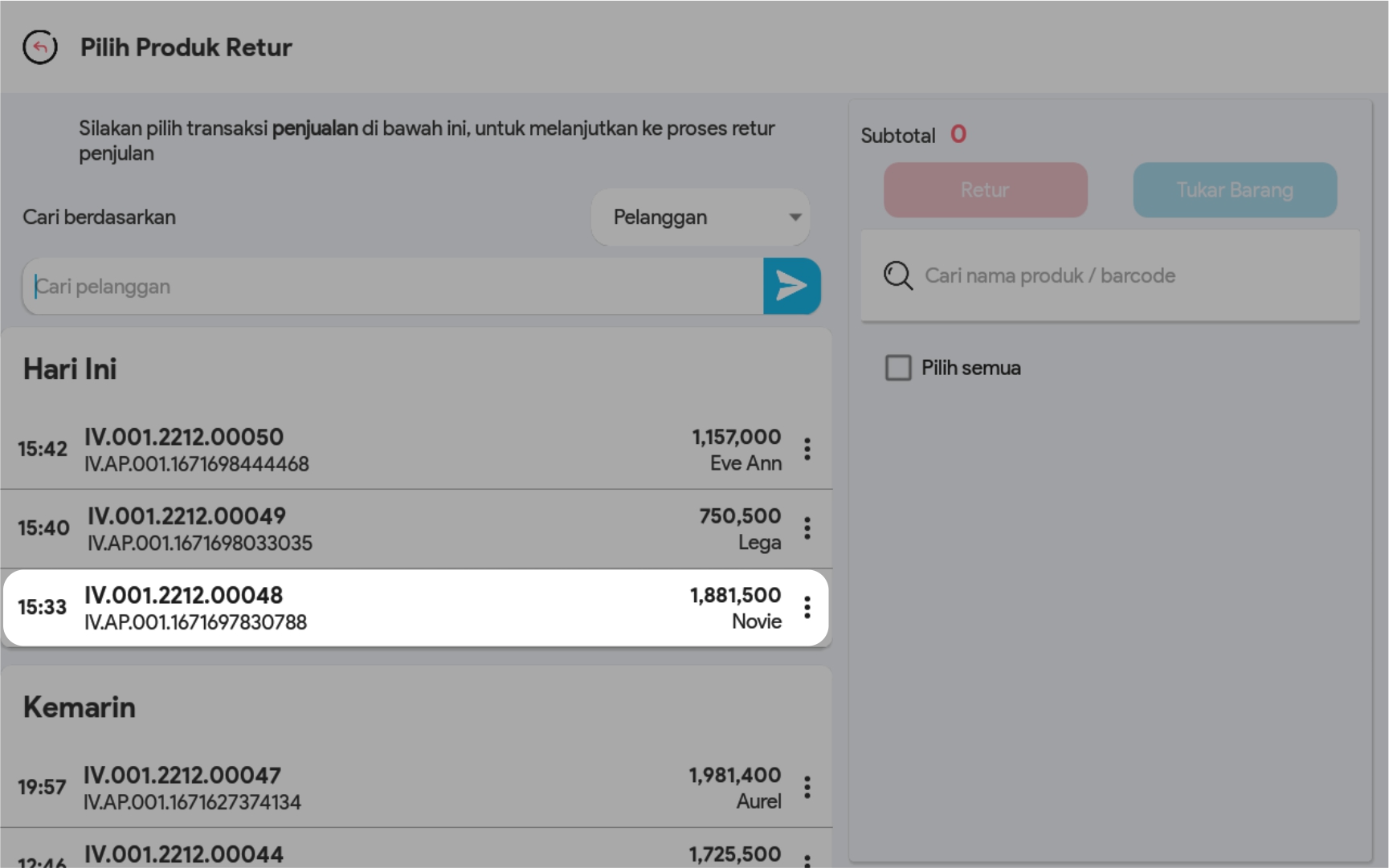 2. Lakukan pencarian transaksi yang akan diretur di kolom pencarian. Anda bisa melakukan pencarian berdasarkan Nama Pelanggan/Invoice/ID transaksi