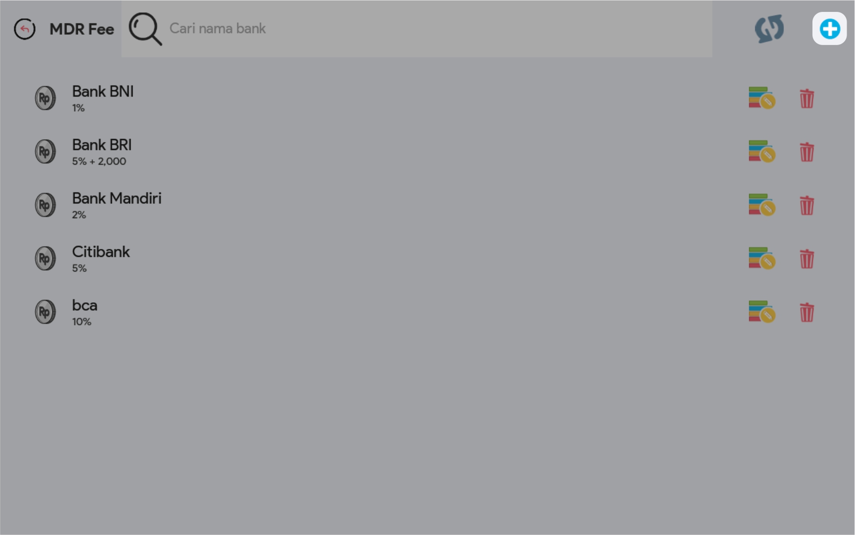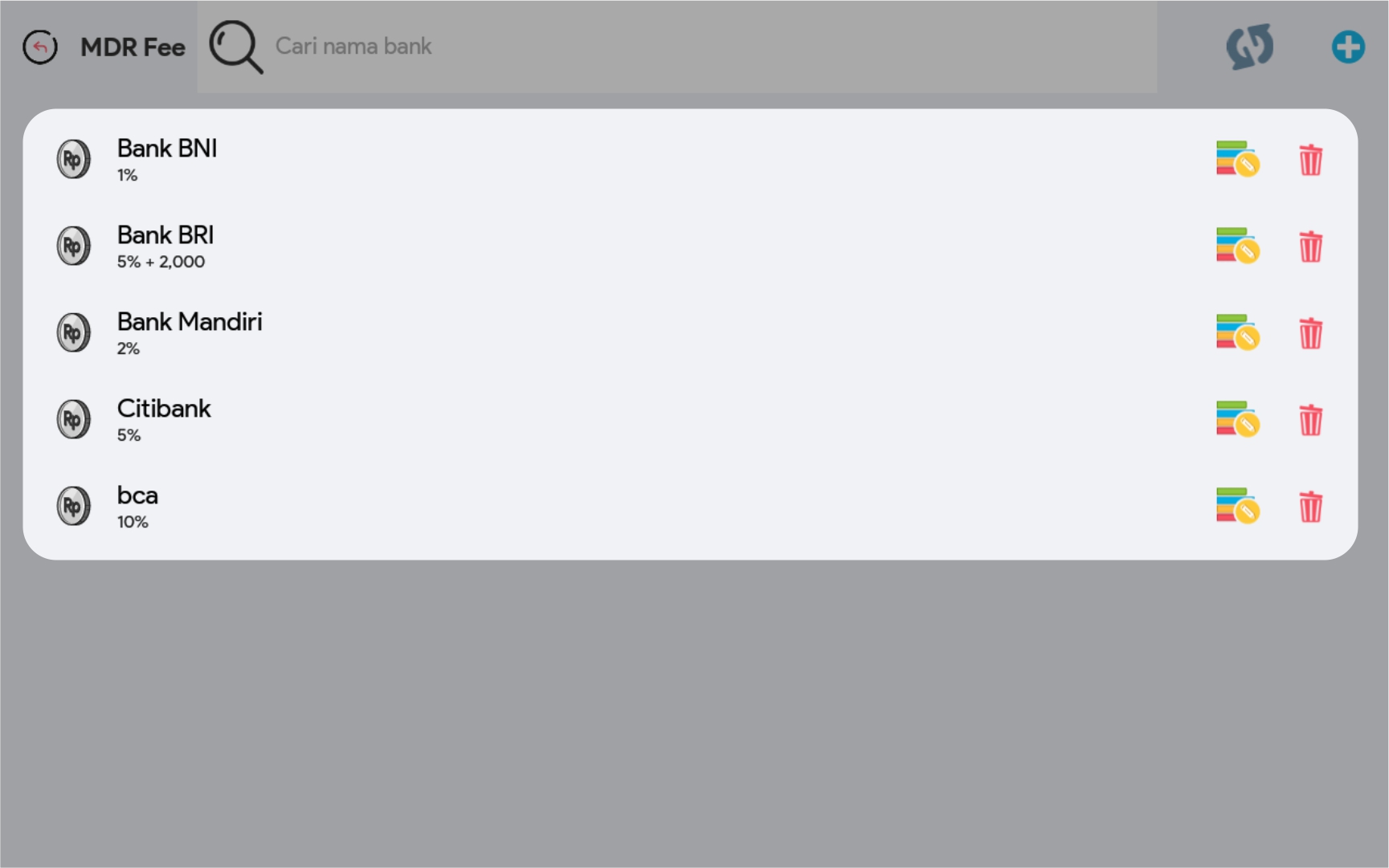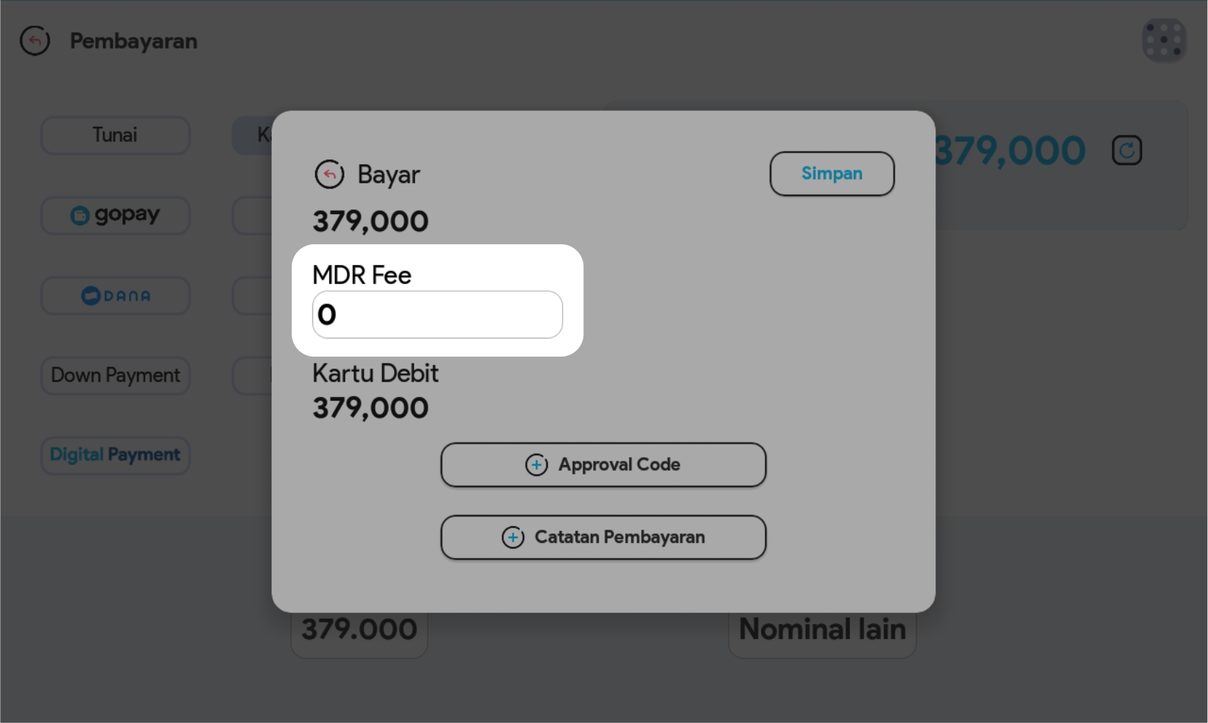 Penambahan Besaran MDR Fee dilakukan saat mencatatkan transaksi Penjualan pada fasilitas Penjualan. Besaran MDR Fee dapat dibuat berbeda-beda untuk setiap bank. Berikut caranya: