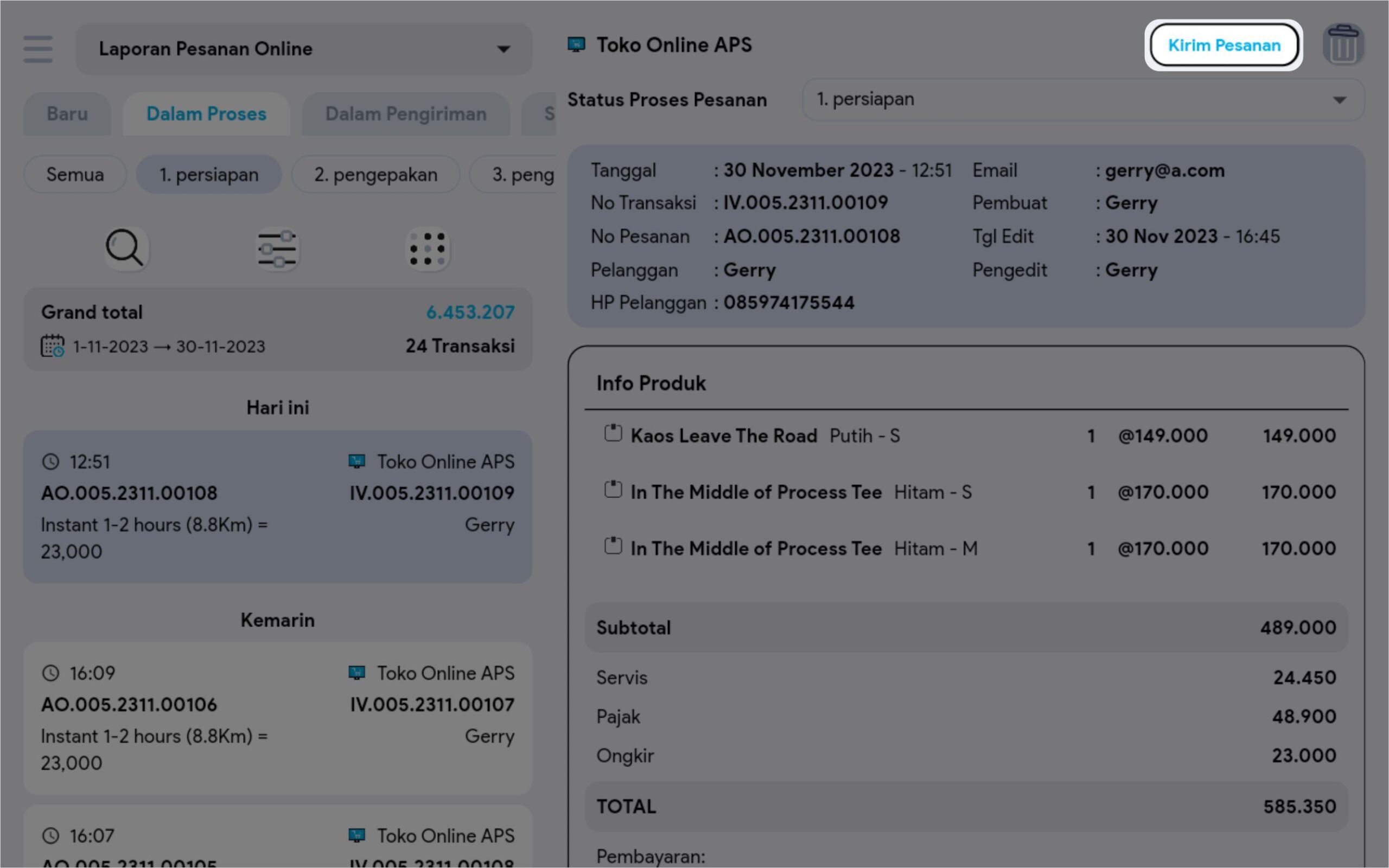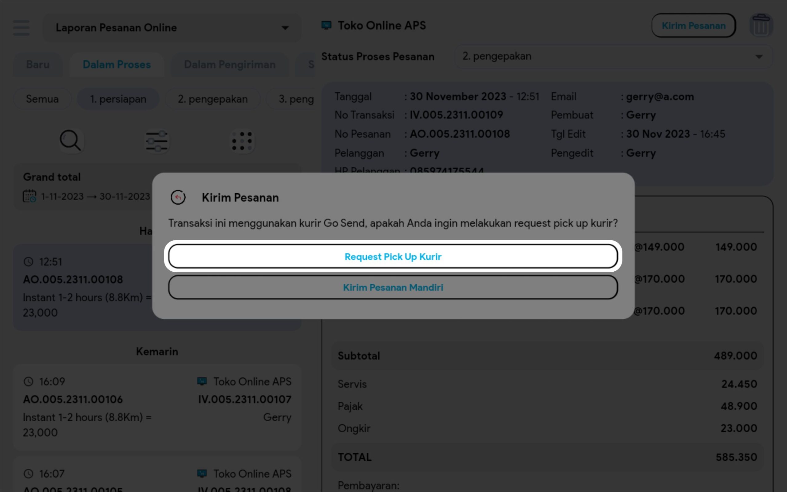 2. Pada tabulasi pesanan dalam proses klik button kirim pesanan di detail pesanan