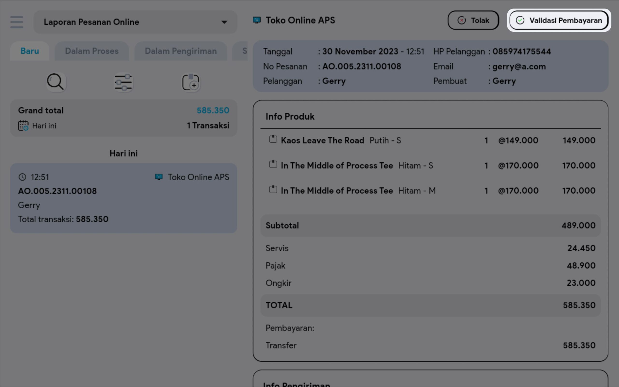 3. Klik Validasi Pembayaran pada pesanan yang bersumber pada Toko Online