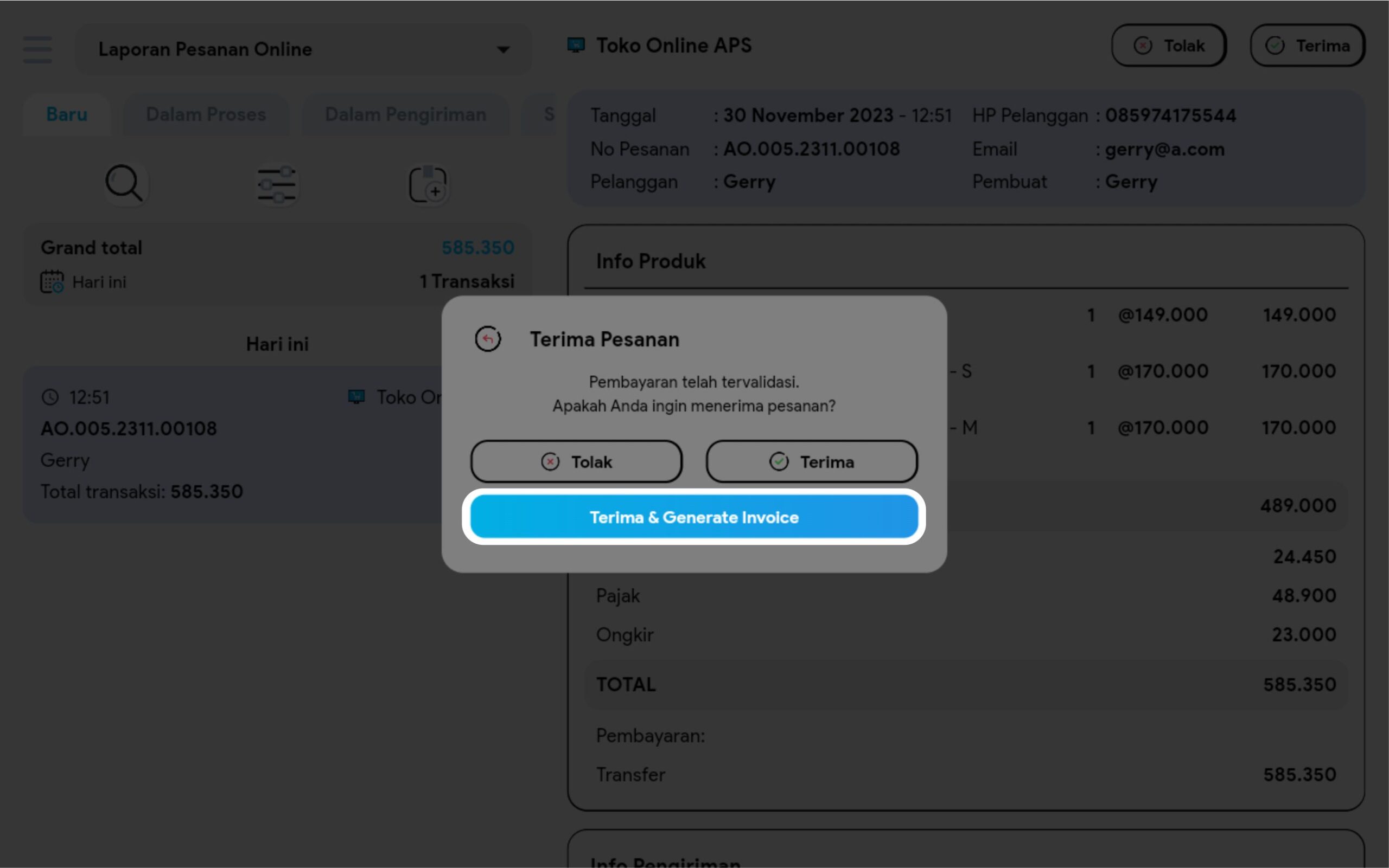 4. Klik button Terima & Generate Invoice
