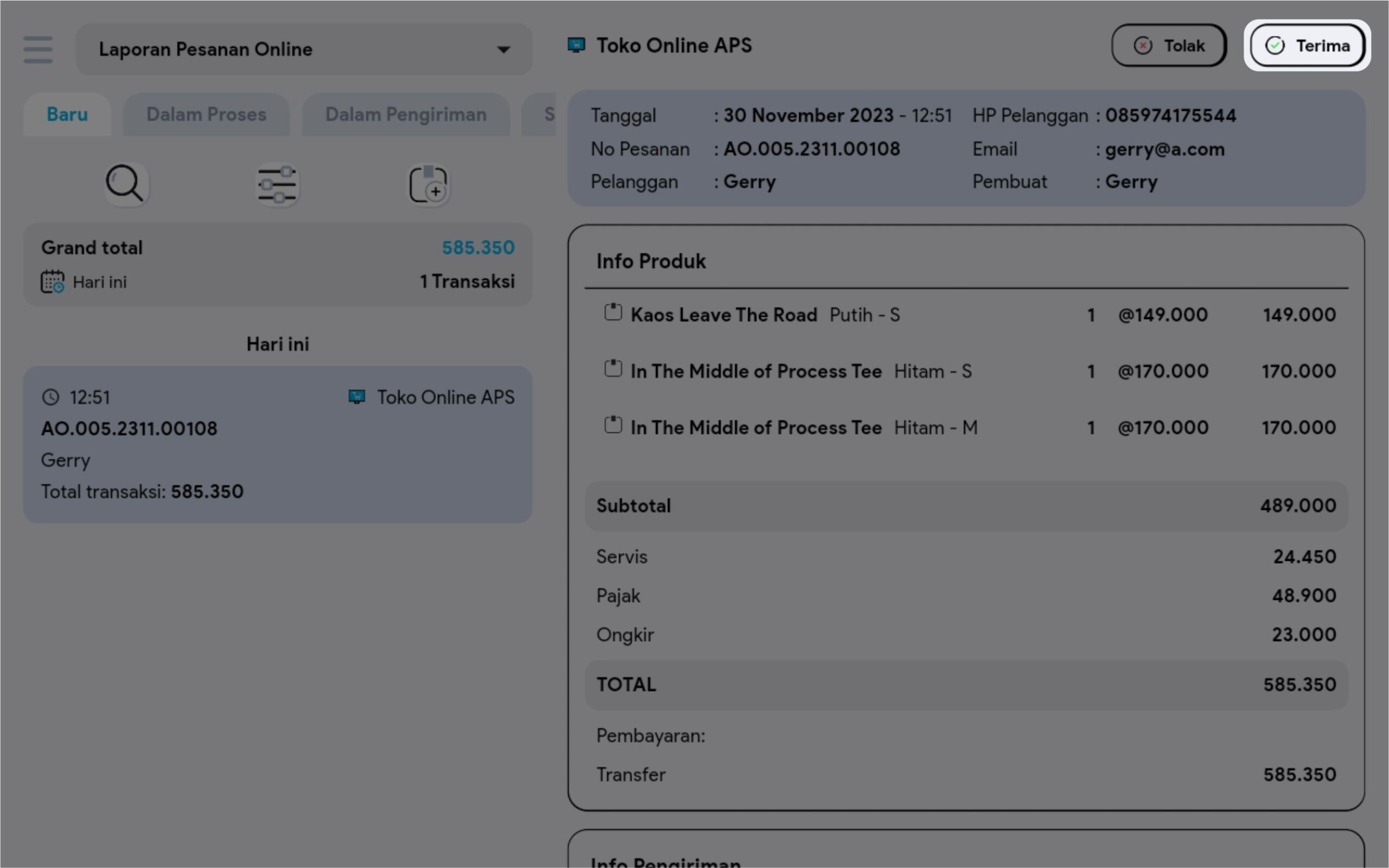 5. Klik button Terima pada pesanan yang bersumber dari marketplace selain toko online APS