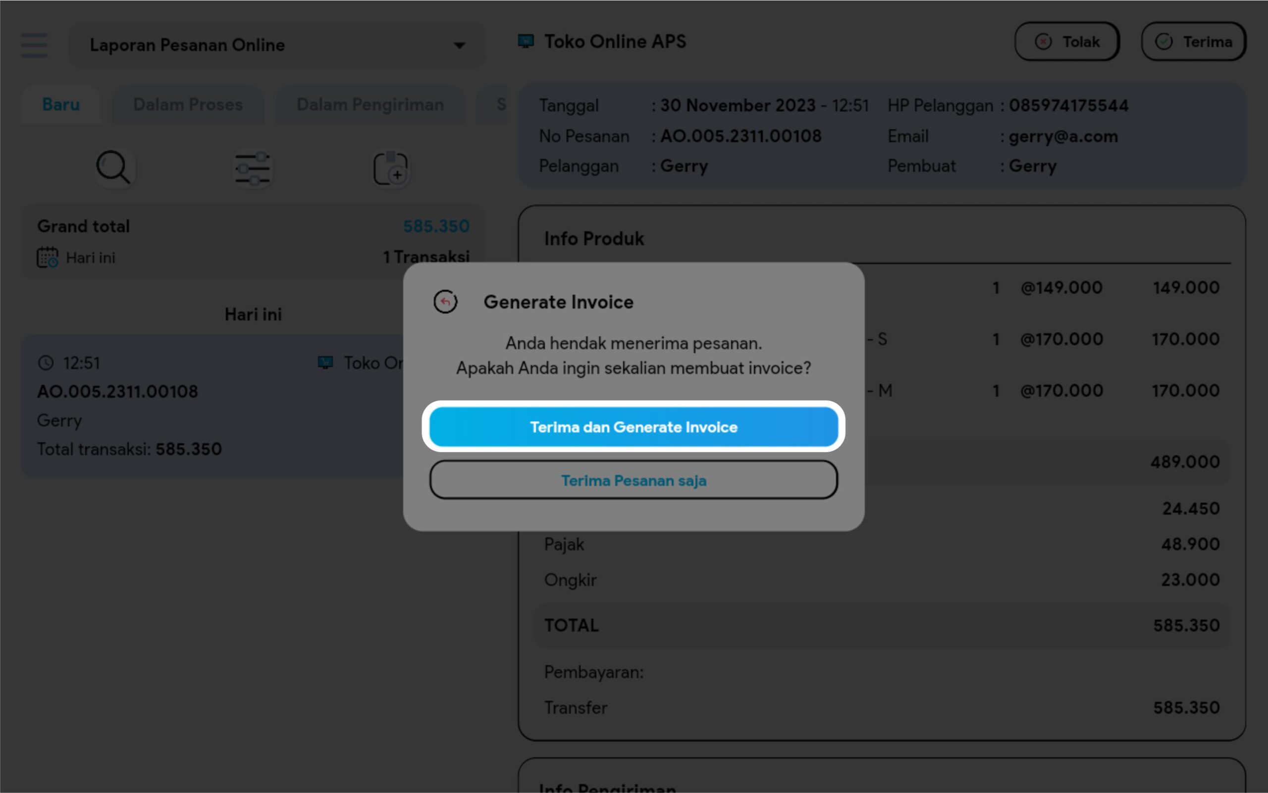 6. Klik button Terima dan Generate Invoice