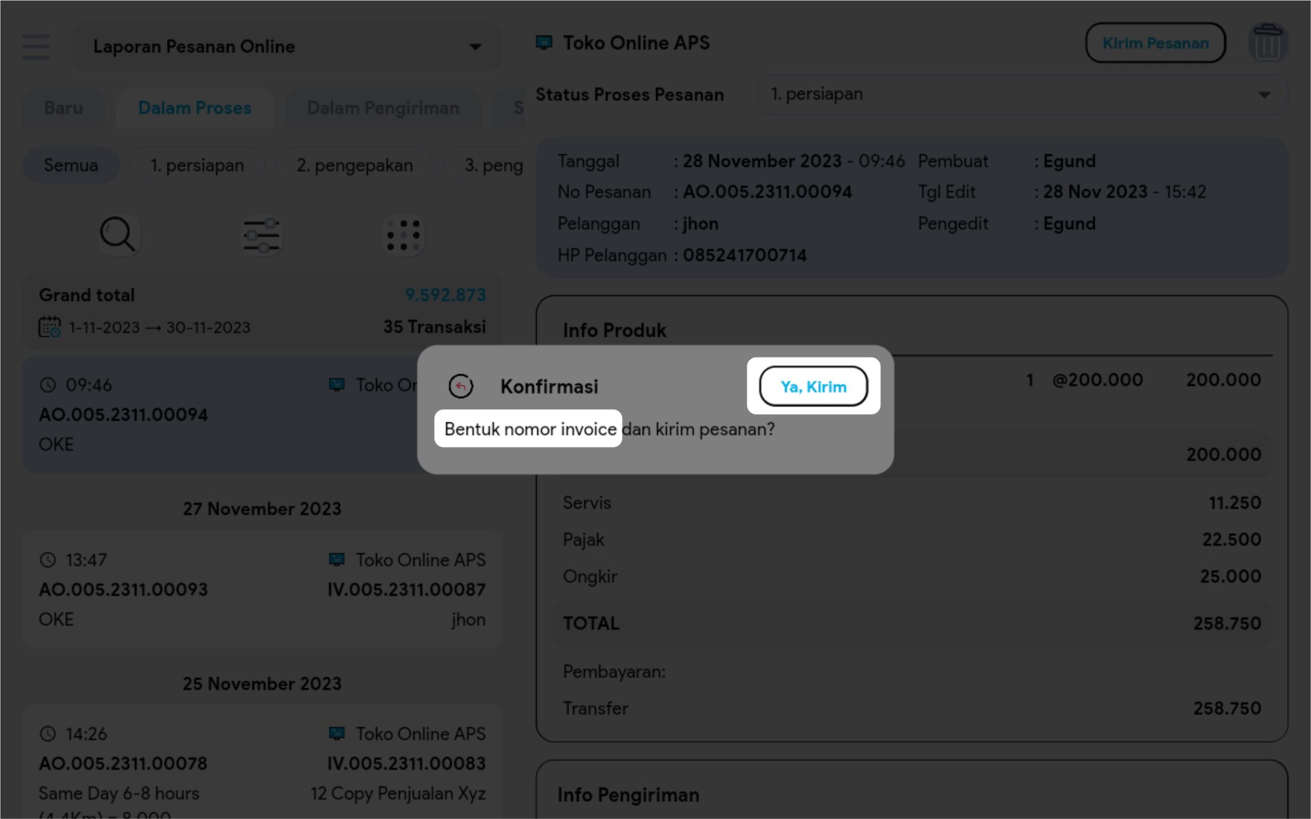 8. Jika Anda melakukan konfirmasi, maka nomor invoice akan terbentuk otomatis