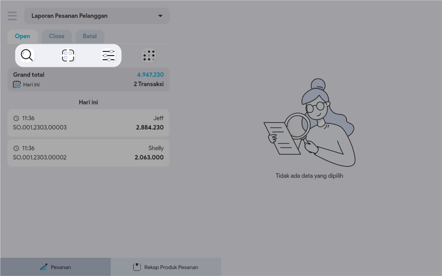 2. Anda dapat menggunakan Search, Scan atau Filter, untuk mencari pesanan yang ingin ditambahkan DP-nya